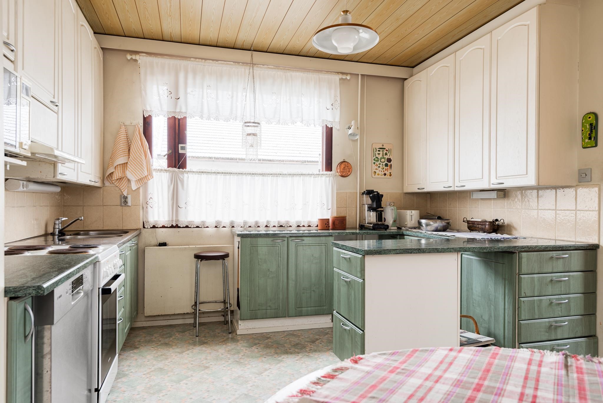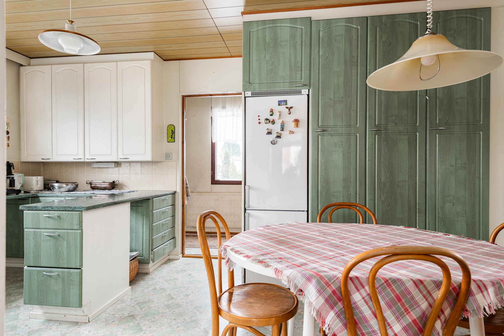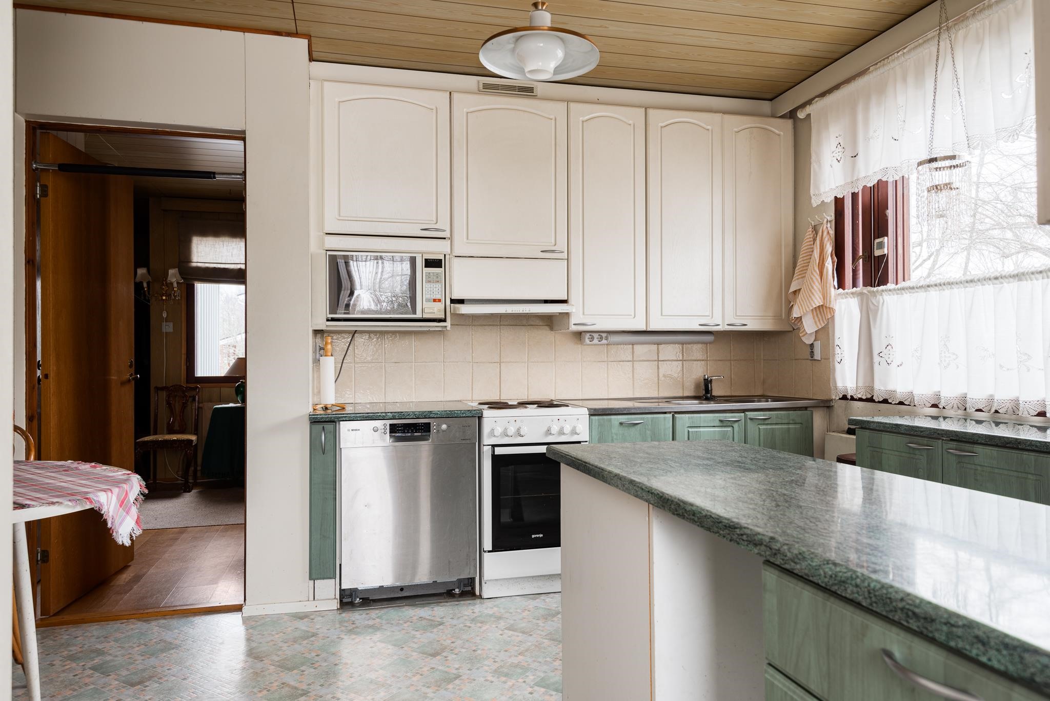- Jääkaappipakastin 2 kpl, toinen kellarissa, sähköliesi, liesituuletin hormiin, astianpesukone, kaapistot, kiinteät valaisimet. Arkkupakastin