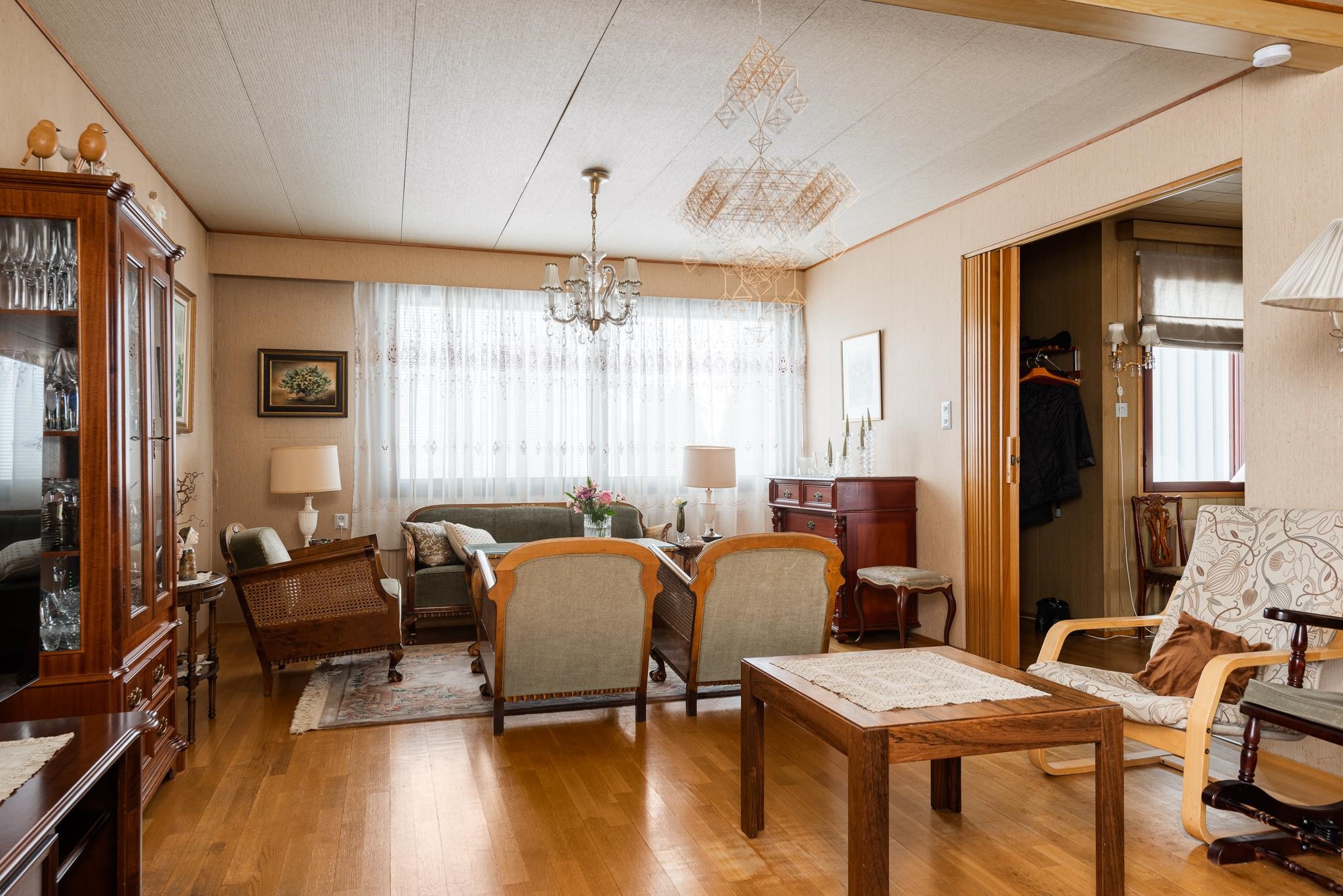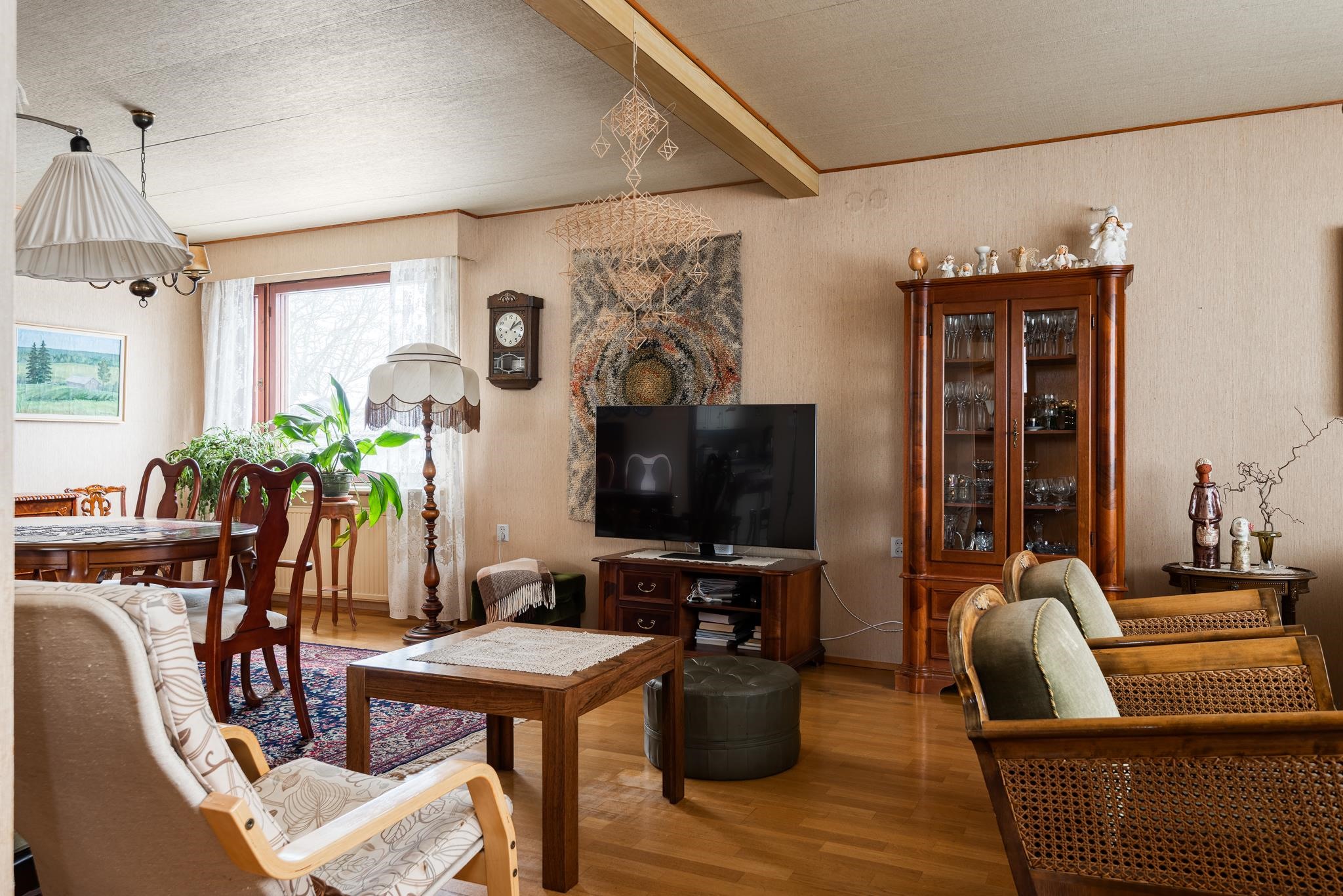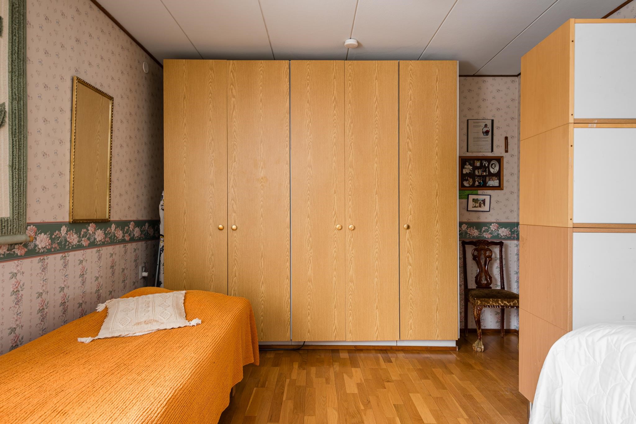 Keittiö: muovimatto. Olohuone: parketti. Makuuhuone 1: parketti. Makuuhuone 2: parketti. Sauna: laatta / puupaneeli. Kylpyhuone: laatta / laatta. Wc: muovimatto.