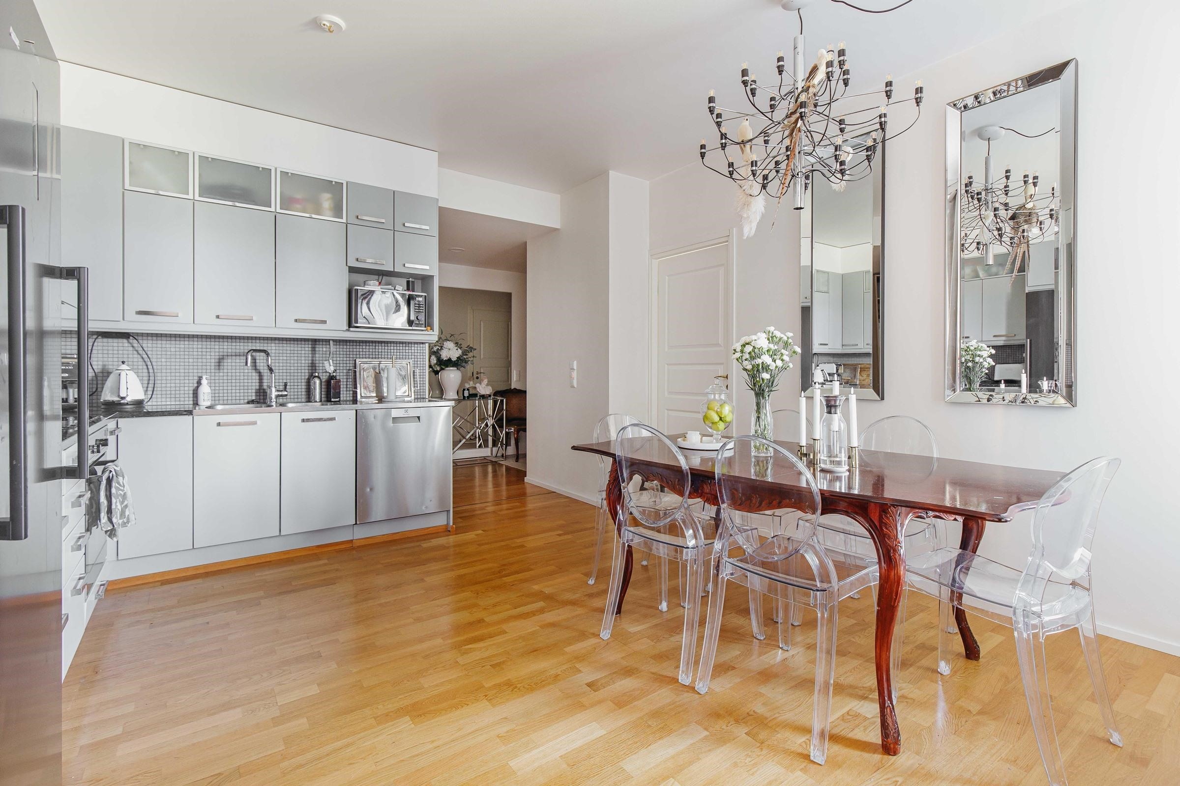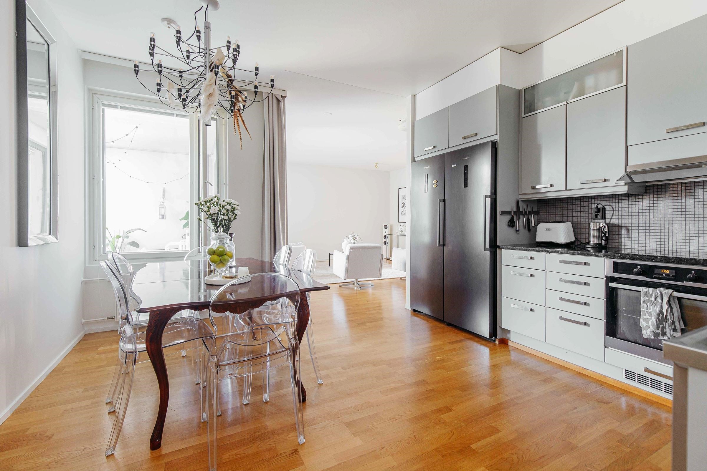 - Jääkaappi, jääkaappipakastin, erillisuuni, induktioliesi, liesituuletin, astianpesukone, kaapistot, kiinteät valaisimet.
