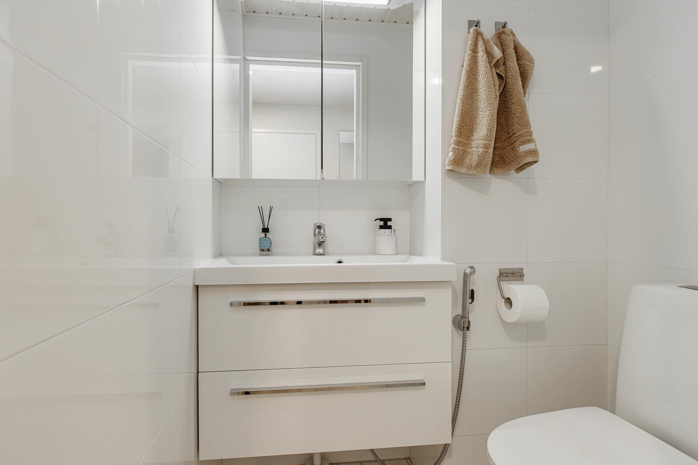 - Sauna, sähkökiuas, kylpyhuone, erillinen wc, suihku, suihkuseinä, peilikaappi, allaskaappi, pesukoneliitäntä, kiinteät valaisimet.