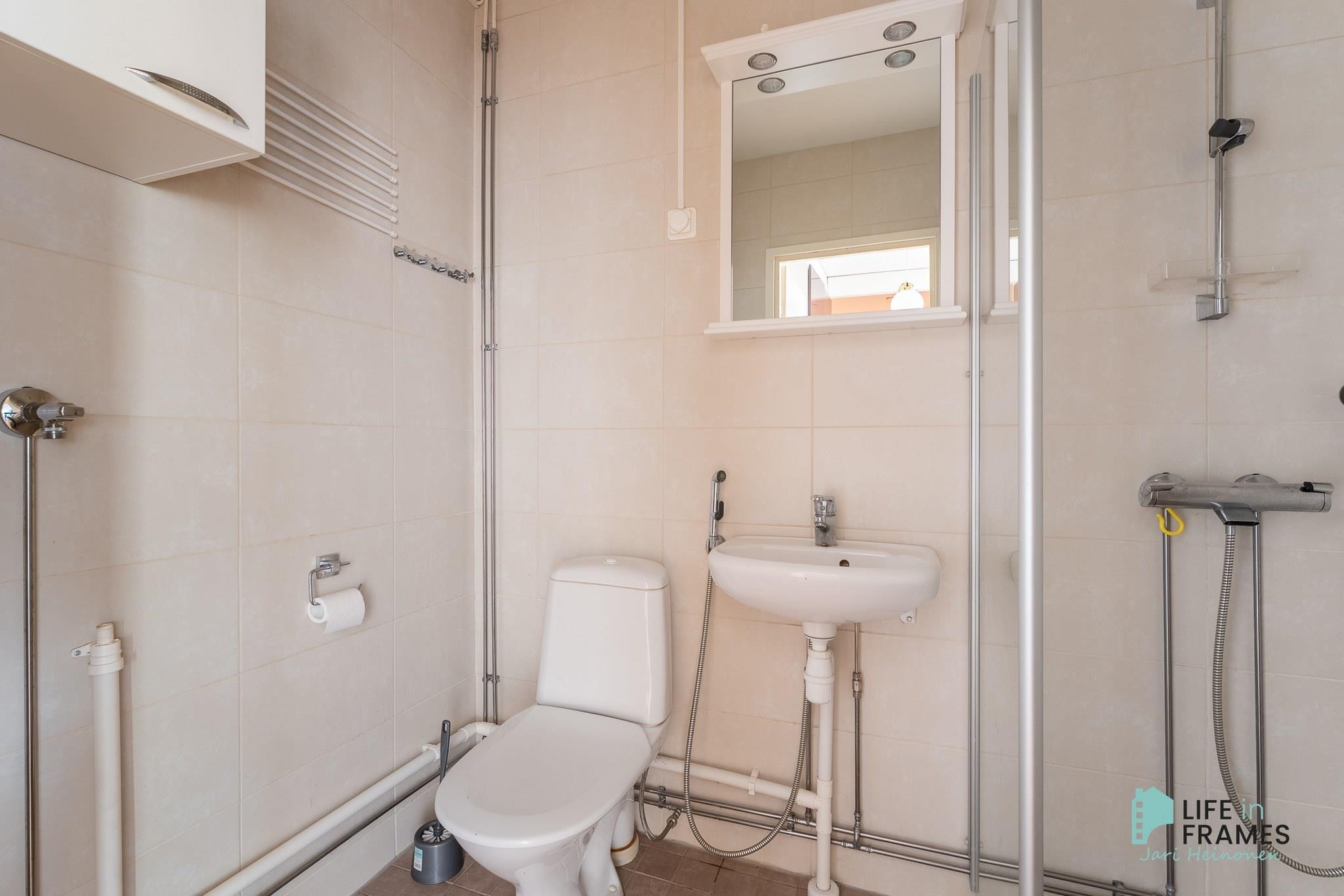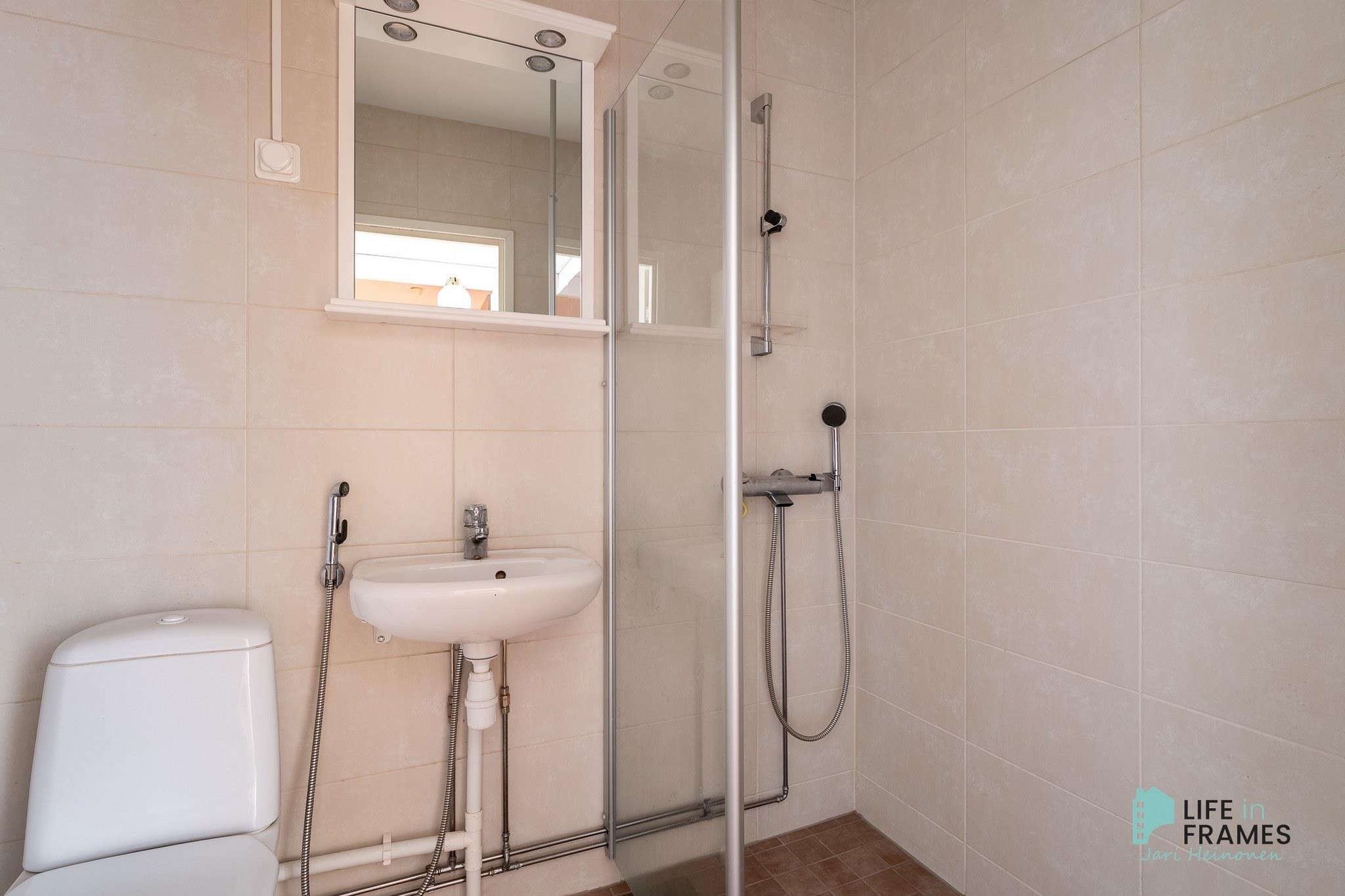 - Kylpyhuone, suihku, suihkuseinä, peilit, lattialämmitys, kiinteät valaisimet.