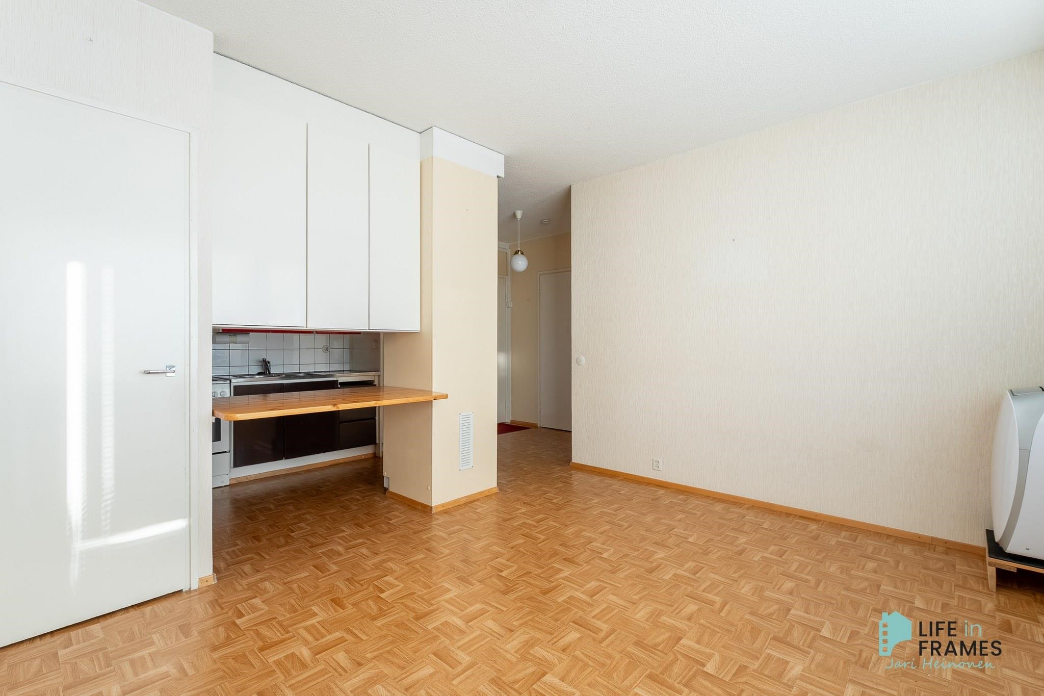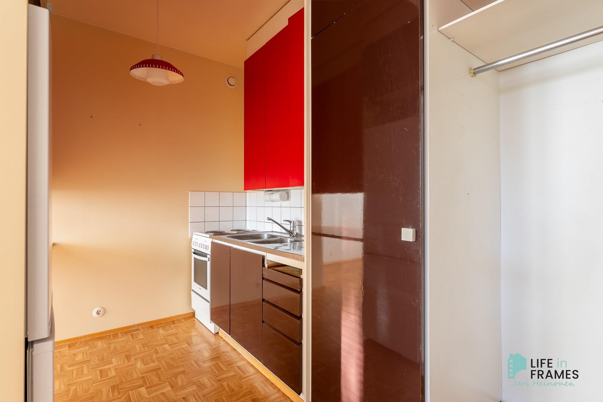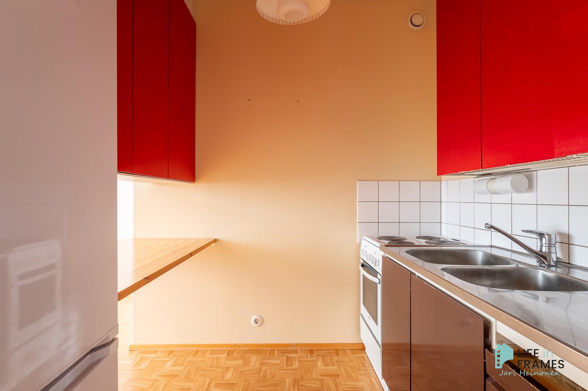 - Jääkaappipakastin, lattialiesi, kaapistot, kiinteät valaisimet.