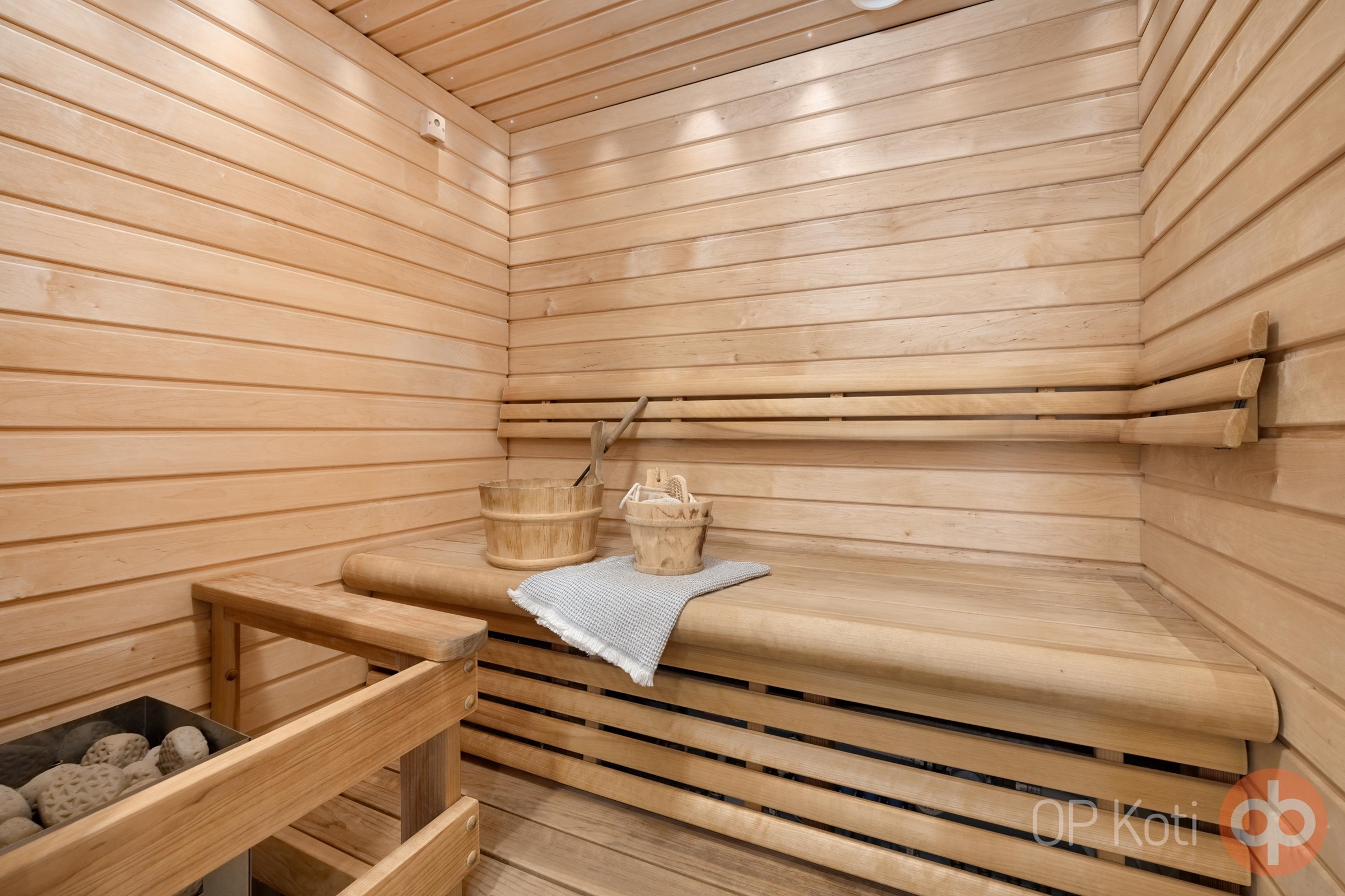 - Sauna, sähkökiuas, kylpyhuone, erillinen wc, suihku, suihkuseinä, kaapit, allaskaappi, pesukoneliitäntä, lattialämmitys, kiinteät valaisimet.