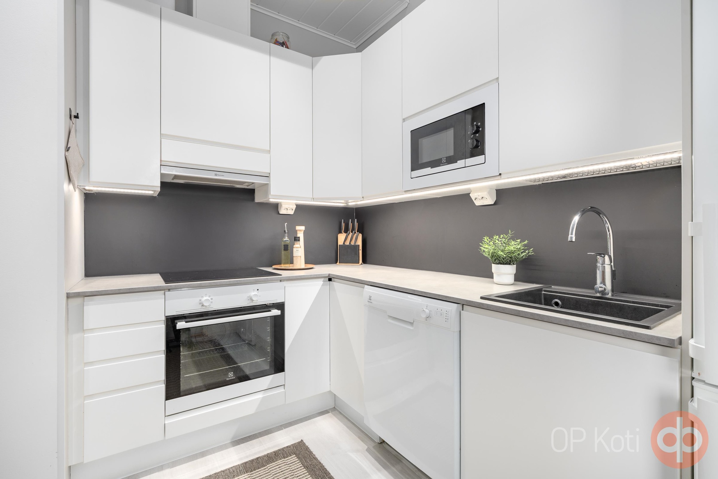 - Jääkaappipakastin, erillisuuni, induktioliesi, liesituuletin, mikroaaltouuni, astianpesukone, kaapistot, kiinteät valaisimet.