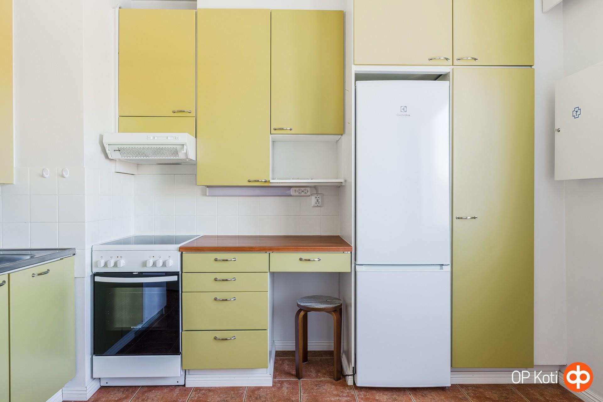 - Jääviileäkaappi, sähköliesi, liesituuletin, astianpesukone, kaapistot, kiinteät valaisimet.