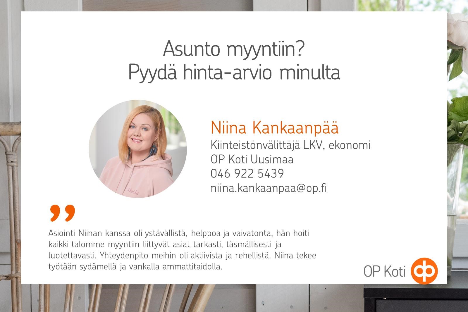 Tervetuloa tutustumaan tähän viihtyisään ja hyvin pidettyyn kaksioon, joka tarjoaa toimivan pohjaratkaisun ja arjen sujuvuutta parhaimmillaan. Asunto sijaitsee ylimmässä, 3. kerroksessa ja siinä on lasitettu parveke, jolta avautuvat rauhalliset etelänpuoleiset näkymät. Huoneistossa viihtyy niin ensiasunnon ostaja, sijoittaja kuin helppoa asumista arvostava. Asunnossa on tehty tärkeitä päivityksiä: ilmalämpöpumppu (2022), keittiön kodinkoneet uusittu (2017) ja pintaremonttia on tehty. Säilytystilaa on runsaasti, ja käytössäsi on myös oma kellarikomero. Taloyhtiö on hyvin hoidettu ja laajasti peruskorjattu, mm. ikkunat ja parvekeovet uusittu (2020), vesikatto uusittu (2018), ilmanvaihtokanavat puhdistettu ja useita sisä- ja ulkopuolen kunnostuksia on tehty. Lisäksi taloyhtiössä on käynnissä linjasaneerauksen suunnittelu ja itse käyttövesiputkiremontti on tarkoitus toteuttaa vuonna 2027, ja tämän huoneiston alustava lainaosuus on noin 25 000 €. Tiedossa oleva remontti nostaa yhtiön tasoa merkittävästi tulevina vuosina. Ota yhteyttä niina.kankaanpaa@op.fi, puh. 046 922 5439.