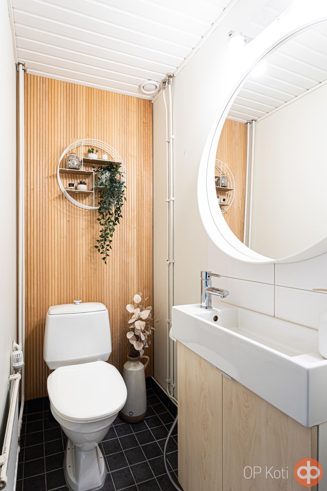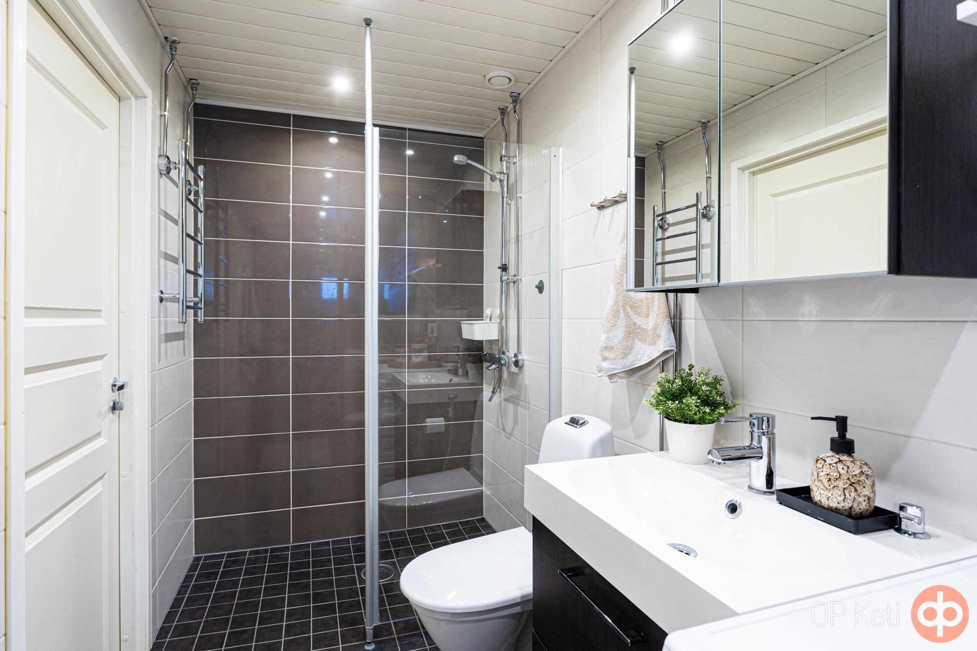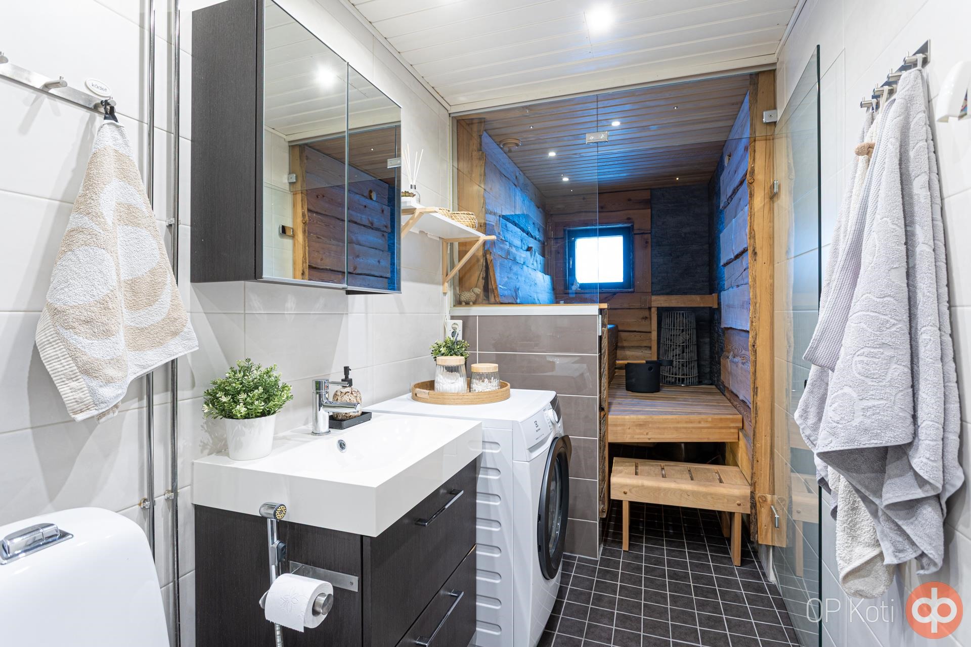 - Sauna, sähkökiuas, kylpyhuone, erillinen wc remontoitu 2023, suihku, suihkuseinä, peilikaappi, allaskaappi, pesukoneliitäntä, lattialämmitys, kiinteät valaisimet.