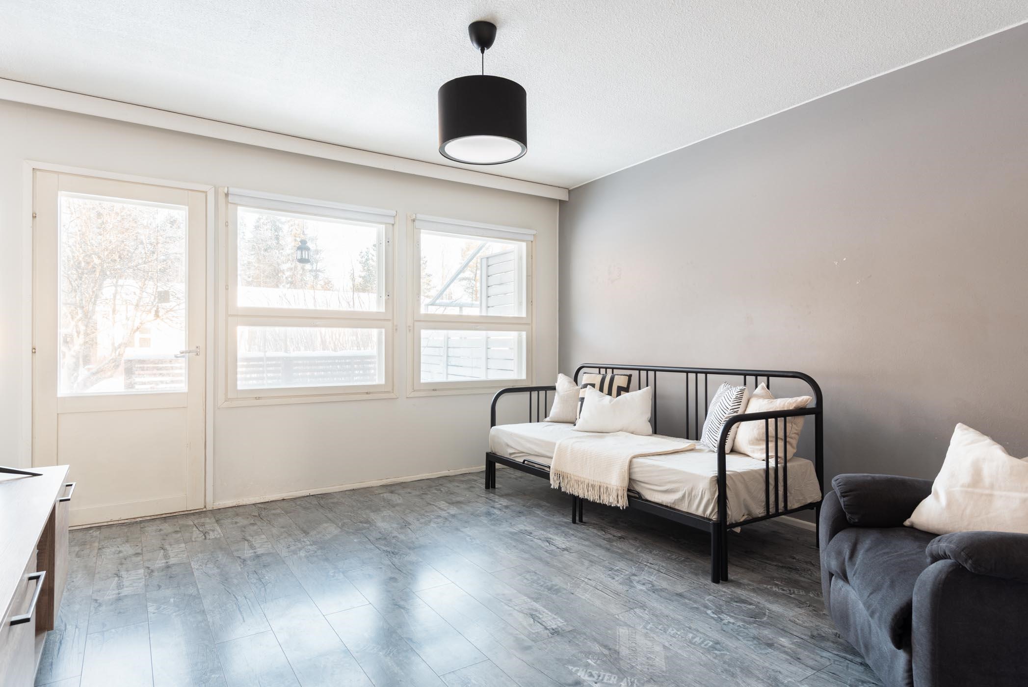- Olohuoneen ja keittiön ikkunat on länteen. Makuuhuoneiden ikkunat itään,