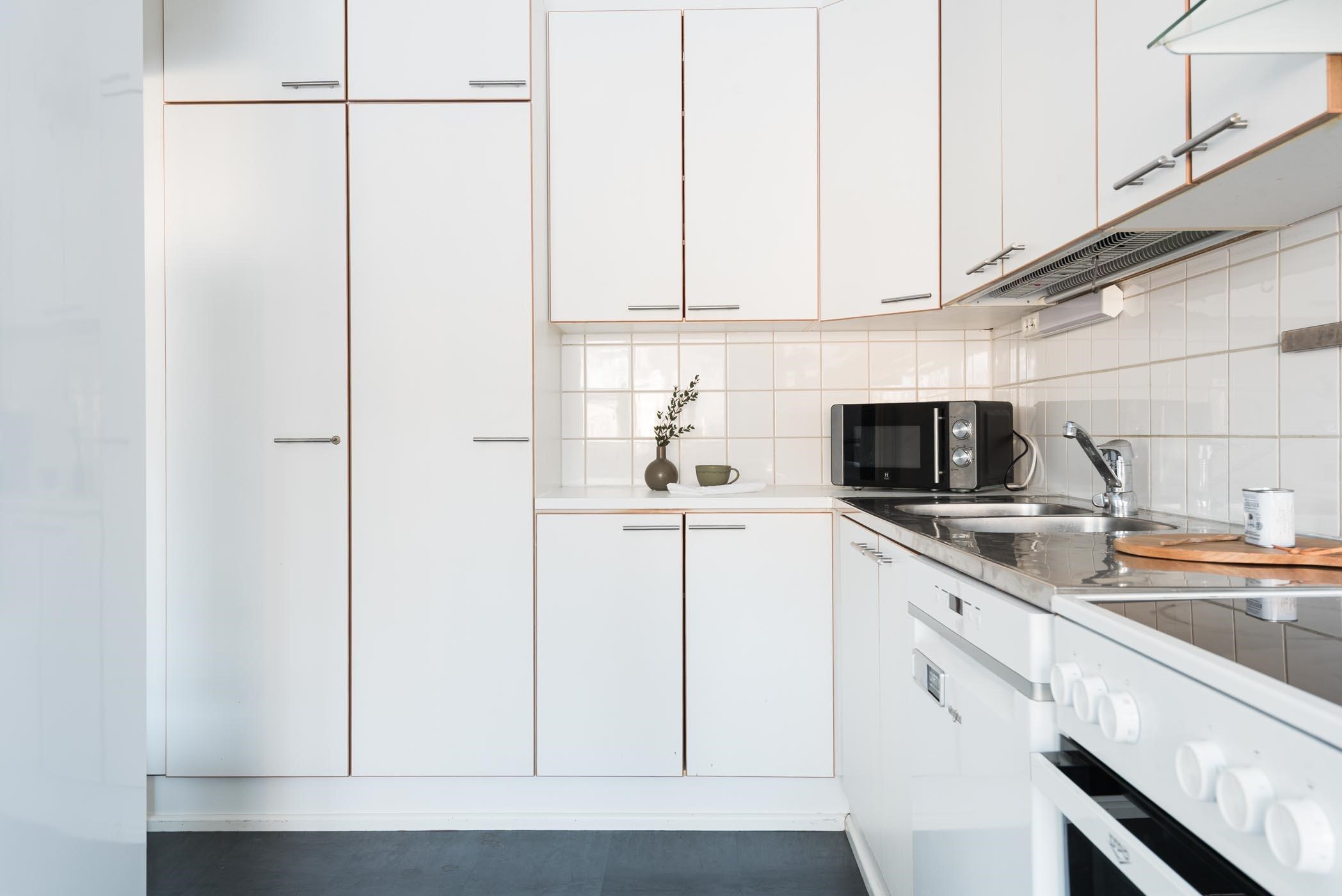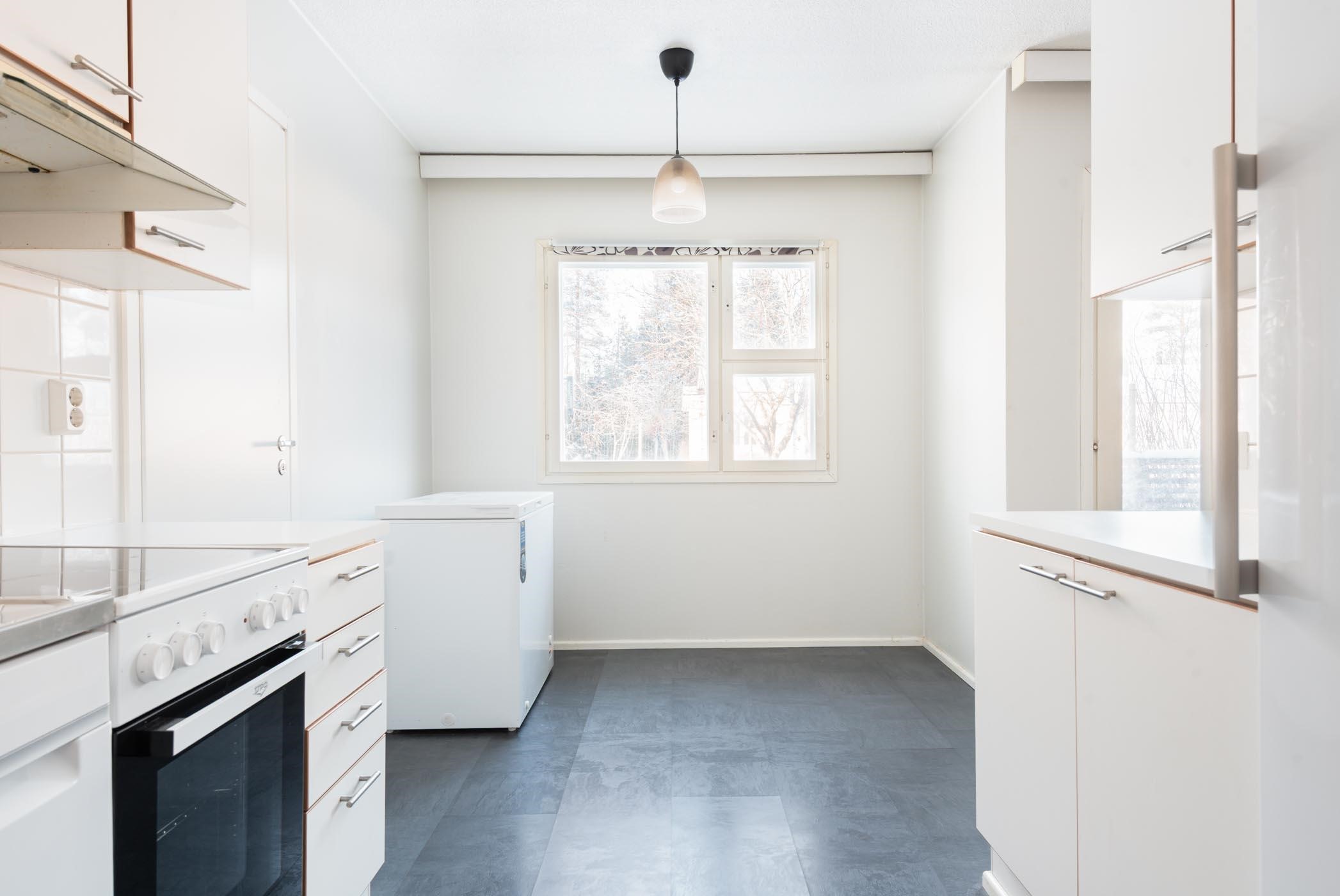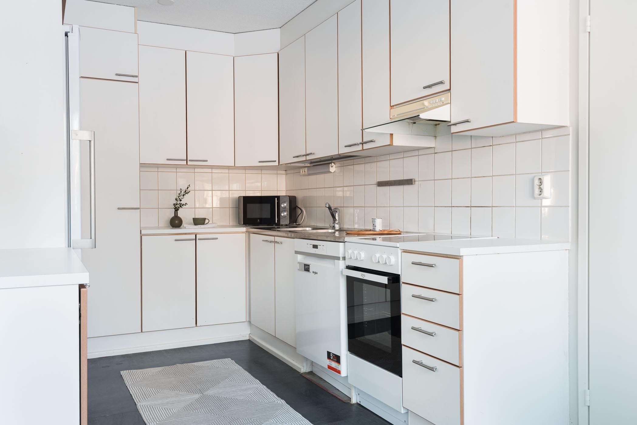 - Jääkaappi (uusittu 2021), keraaminen liesi (uusittu 2025), liesituuletin, astianpesukone, kaapistot, kiinteät valaisimet (työtasovalaisin). Arkkupakastin (uusittu 2021). Keittiön kaapinovien vetimet uusittu.