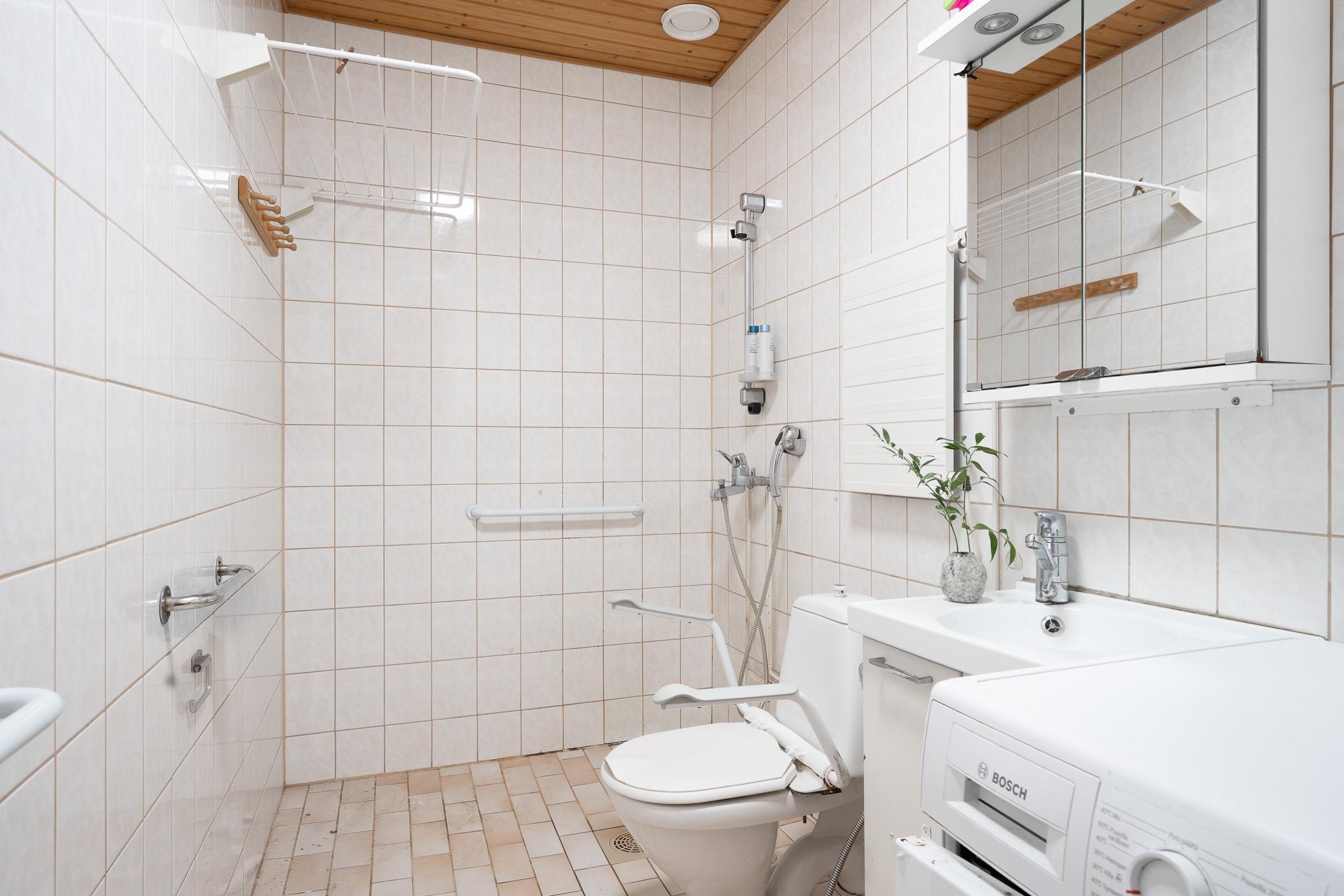 - Kylpyhuoneessa suihku, peilikaappi, allaskaappi,pesukoneliitäntä ja kiinteät valaisimet.