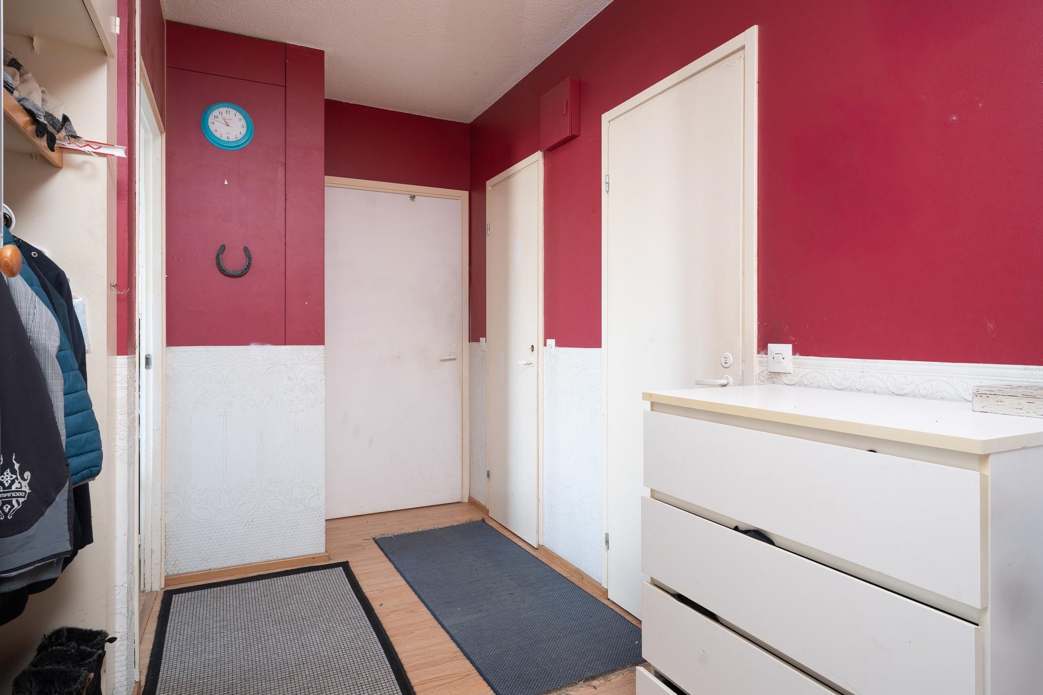 Eteinen:laminaattilattia/seinät maalattu, Olohuone: laminaattilattia/maalattu seinät. Keittiö: laminaattilattia/seinät maalattu,välitilan laatta. Makuuhuone 1 : laminaattilattia/tapetoitu seinät. Makuuhuone 2 :laminaattilattia/tapetoitu seinät/maalattu. Kylpyhuone: laatta/laatta.