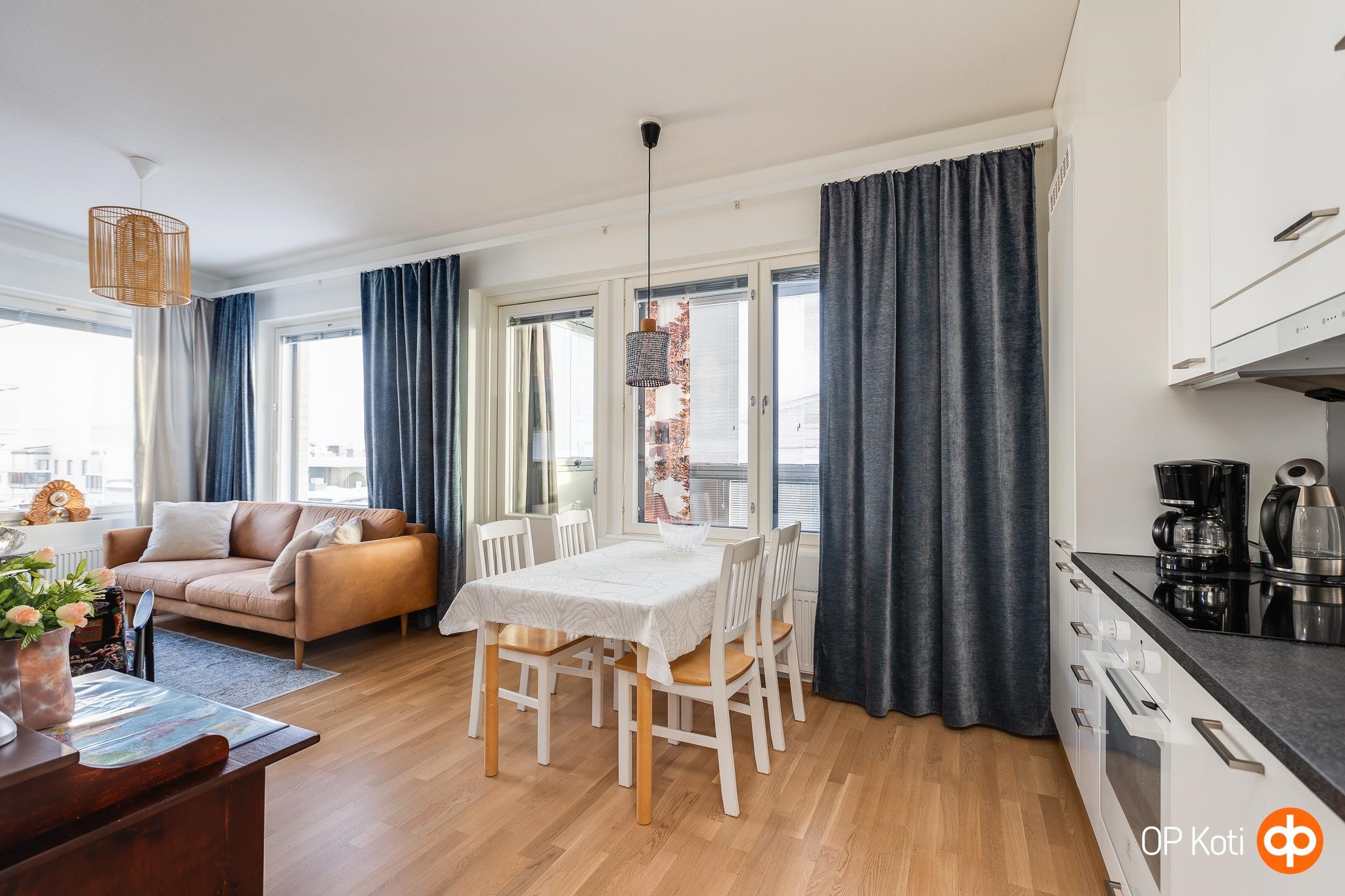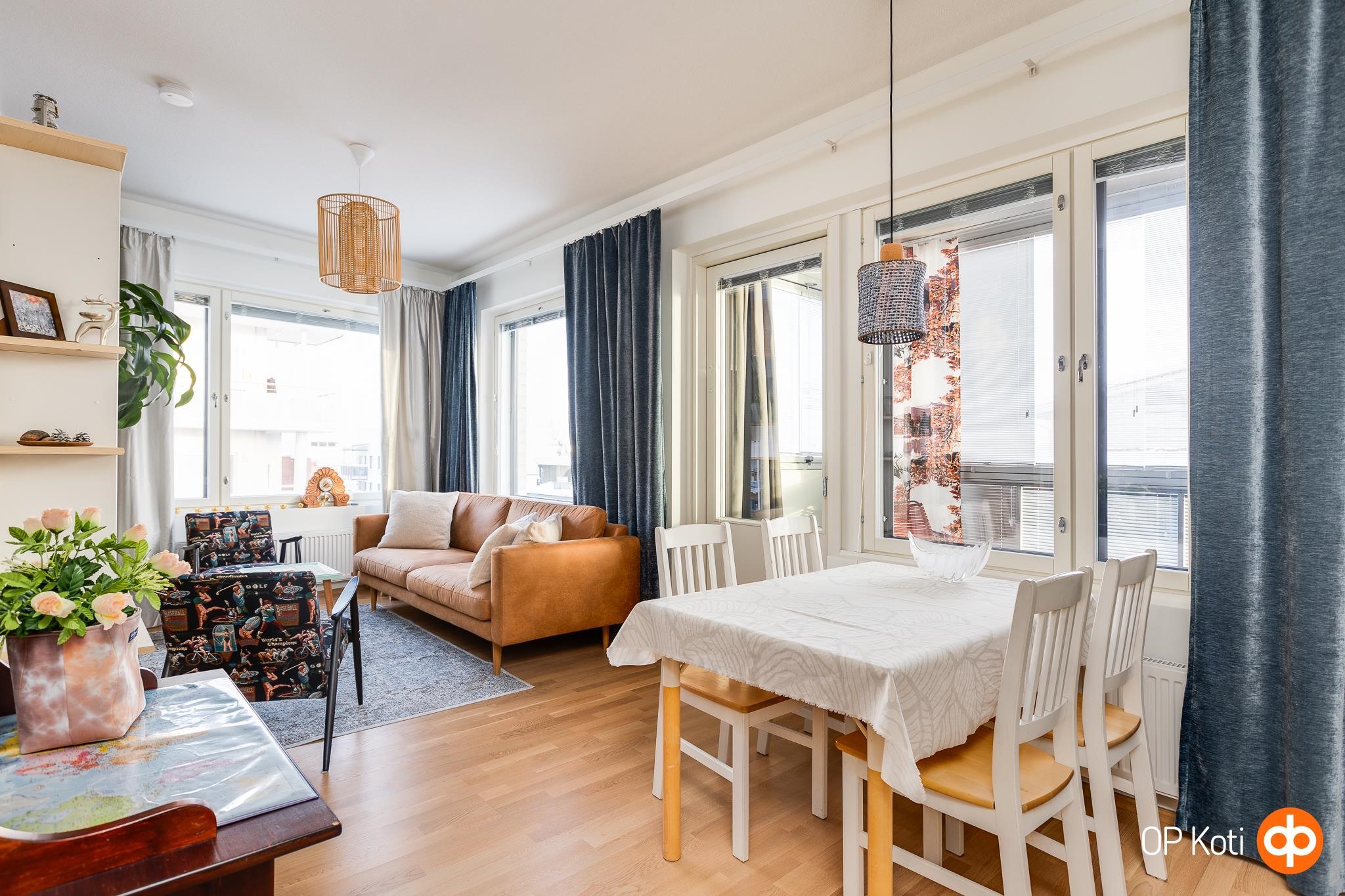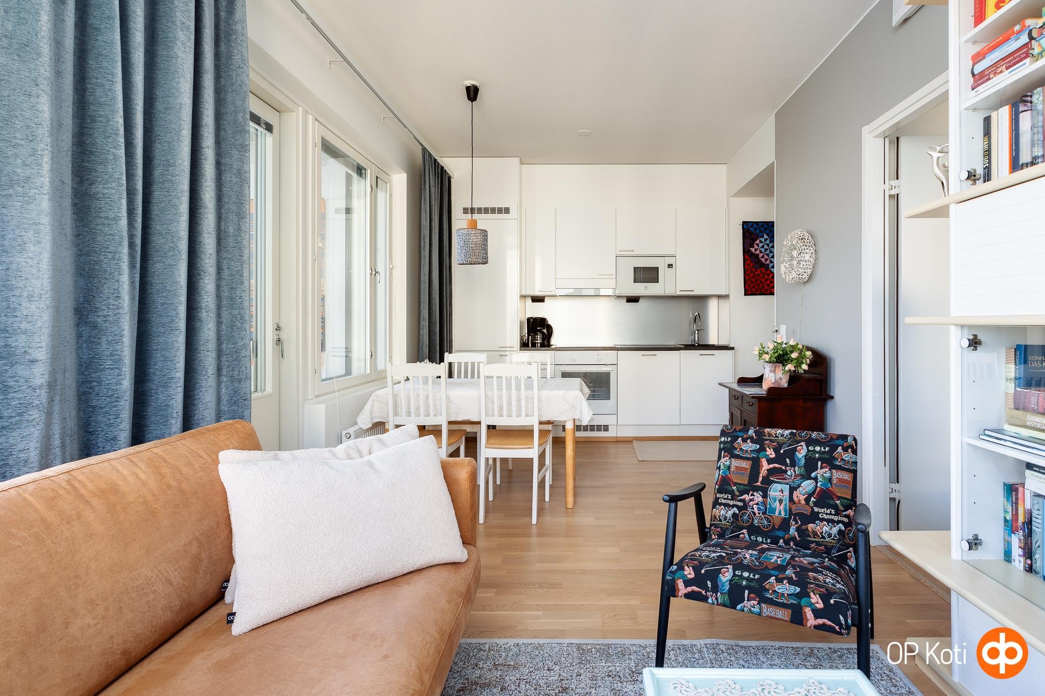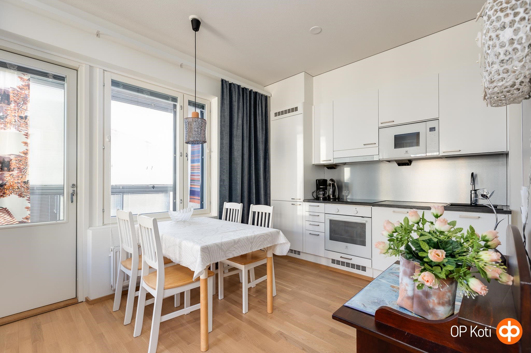 Tämä moderni kaksio sopii täydellisesti kaupunkiasumista arvostavalle, joka haluaa elää lähellä palveluita mutta nauttia myös rauhallisista hetkistä omassa kodissa. Kulmahuoneiston suuret ikkunat päästävät valon virtaamaan luonnollisesti läpi asunnon ja tarjoavat vaikuttavat näkymät kaupungin kattojen ylle. Avarassa olohuoneessa on tilaa niin rentoutumiseen kuin yhdessäoloon. Keittiö on käytännöllinen ja hyvin varusteltu, ja makuuhuoneen yhteydessä oleva vaatehuone tekee arjesta sujuvaa. Lasitettu parveke toimii lisähuoneena läpi vuoden, ja siellä voi nauttia aamukahvista tai seurata kaupungin elämää iltaisin.