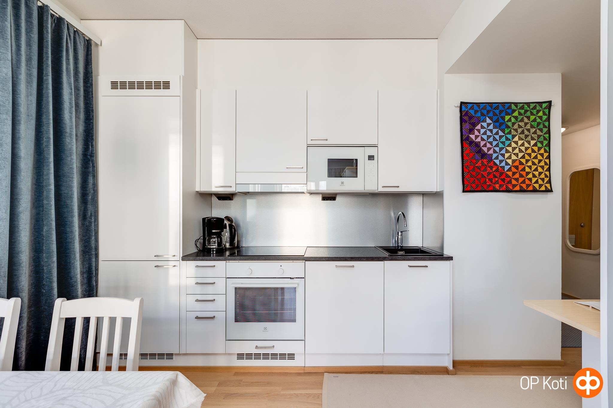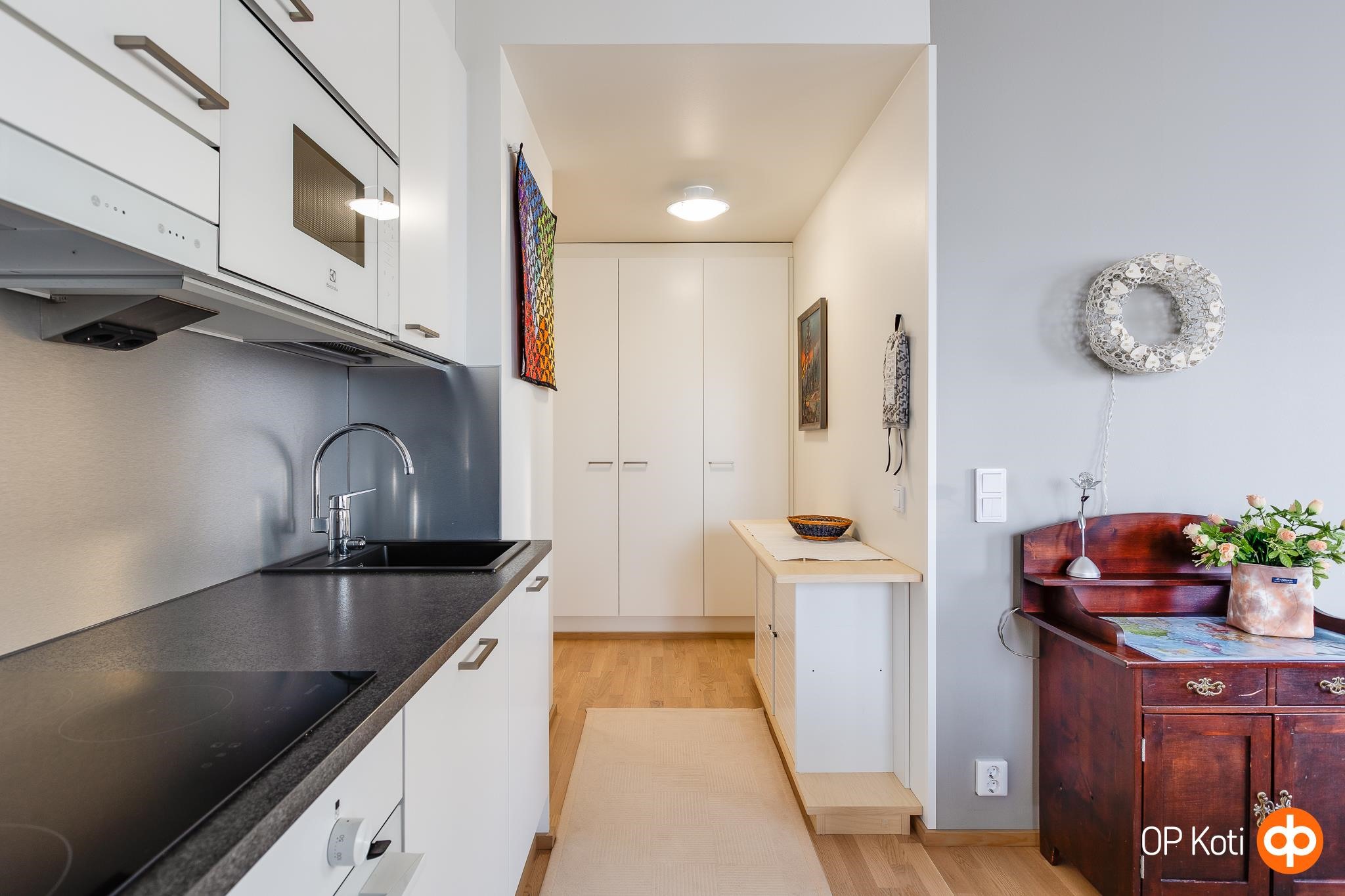 - Jääkaappipakastin (integroitu), erillisuuni, liesitaso, induktioliesi, liesituuletin, mikroaaltouuni (integroitu), astianpesukone (integroitu), kaapistot, kiinteät valaisimet.
