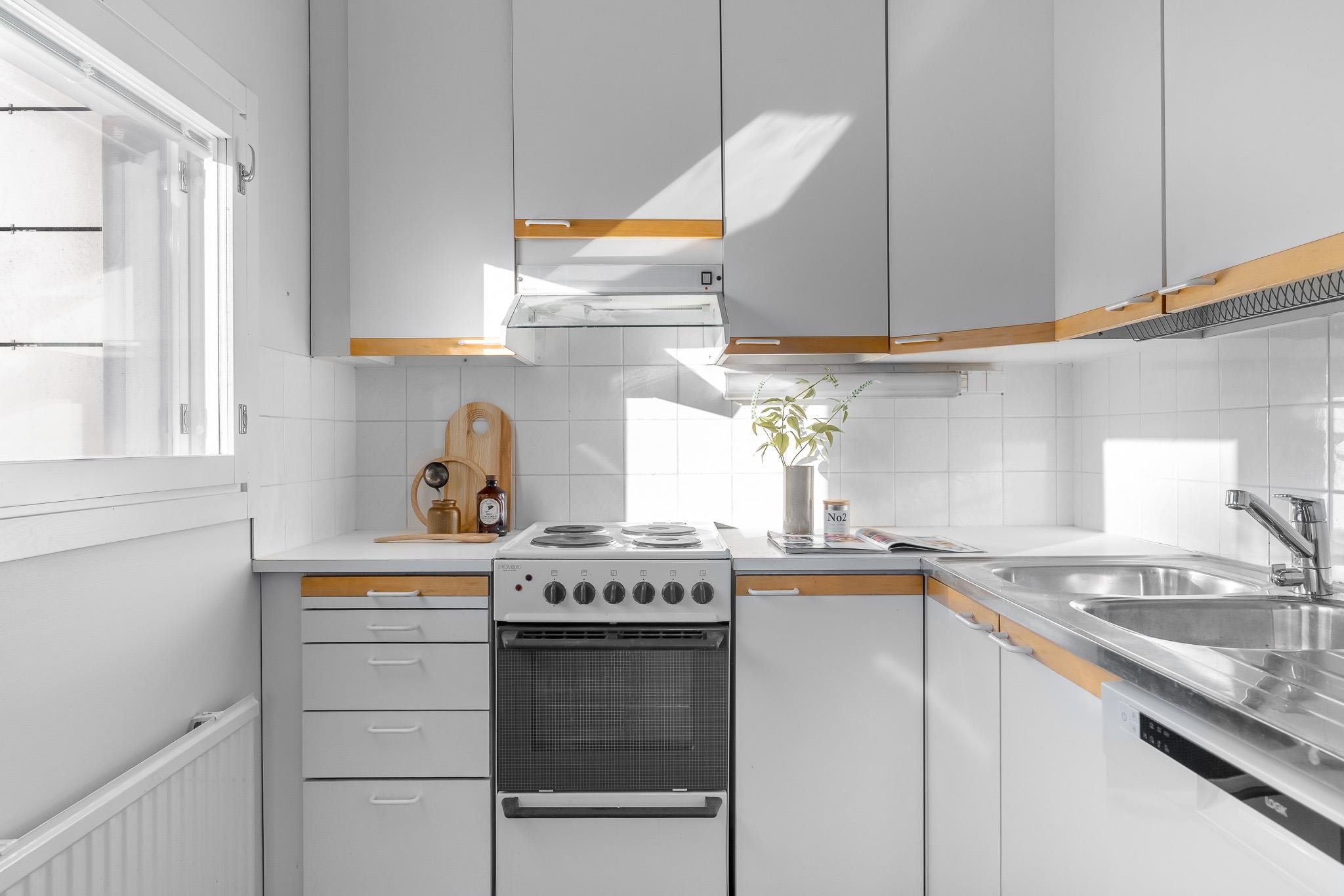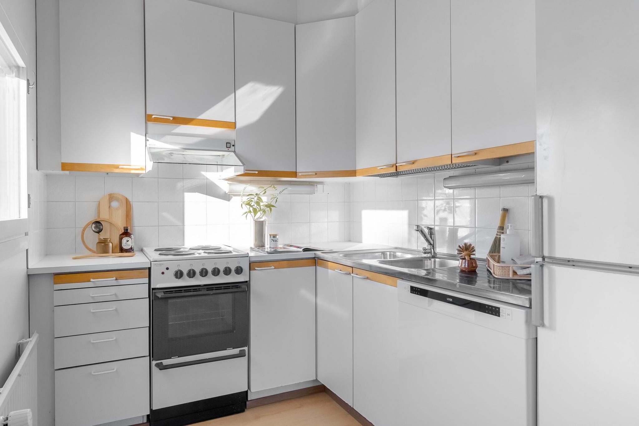 - Jääviileäkaappi, sähköliesi, liesituuletin MUH, astianpesukone uusi, kaapistot, kiinteät valaisimet.