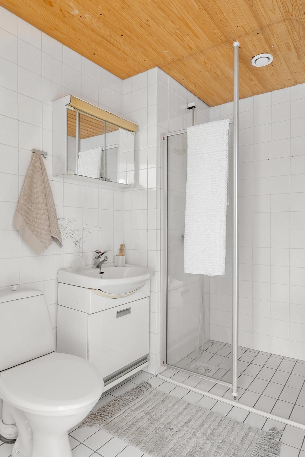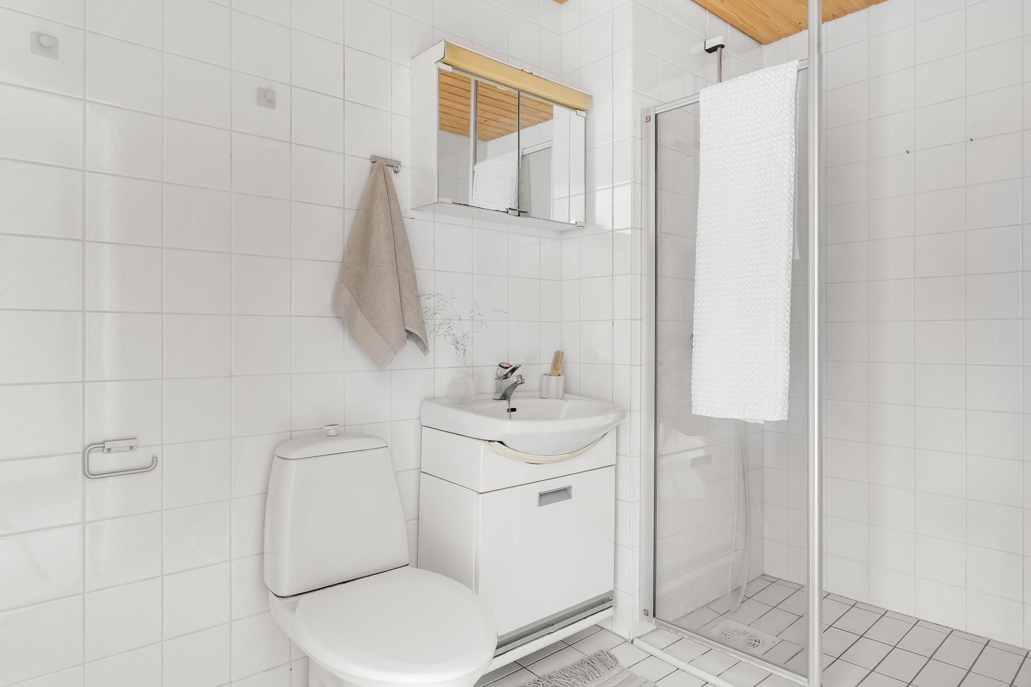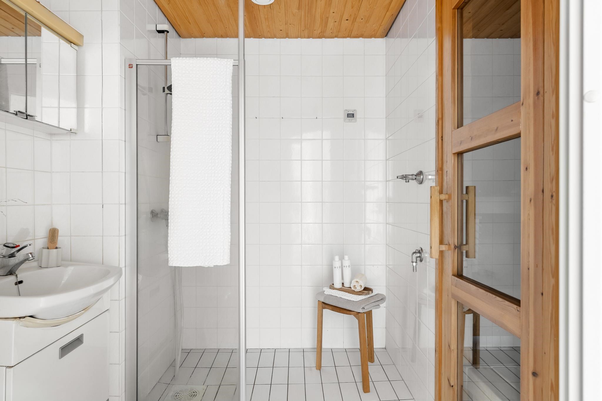 - Sauna, sähkökiuas, kylpyhuone, suihku, suihkuseinä, peilikaappi, allaskaappi, pesukoneliitäntä, lattialämmitys, kiinteät valaisimet.