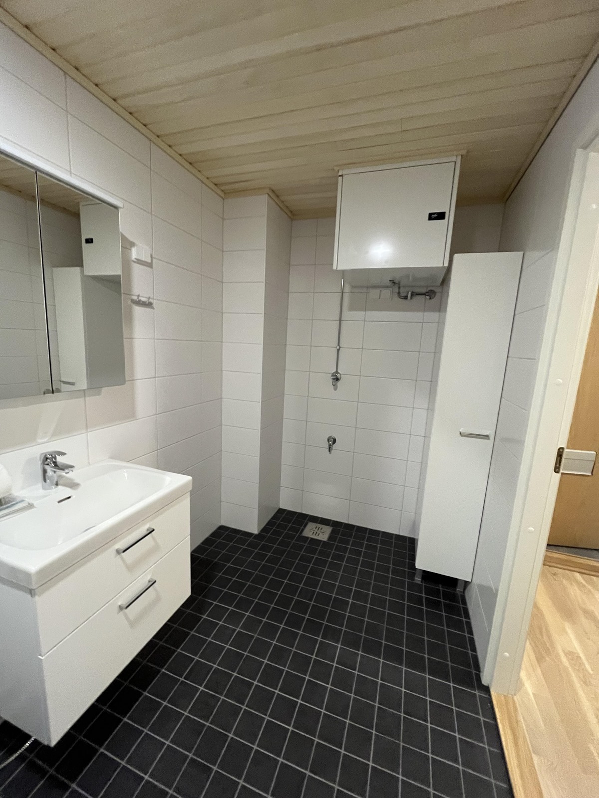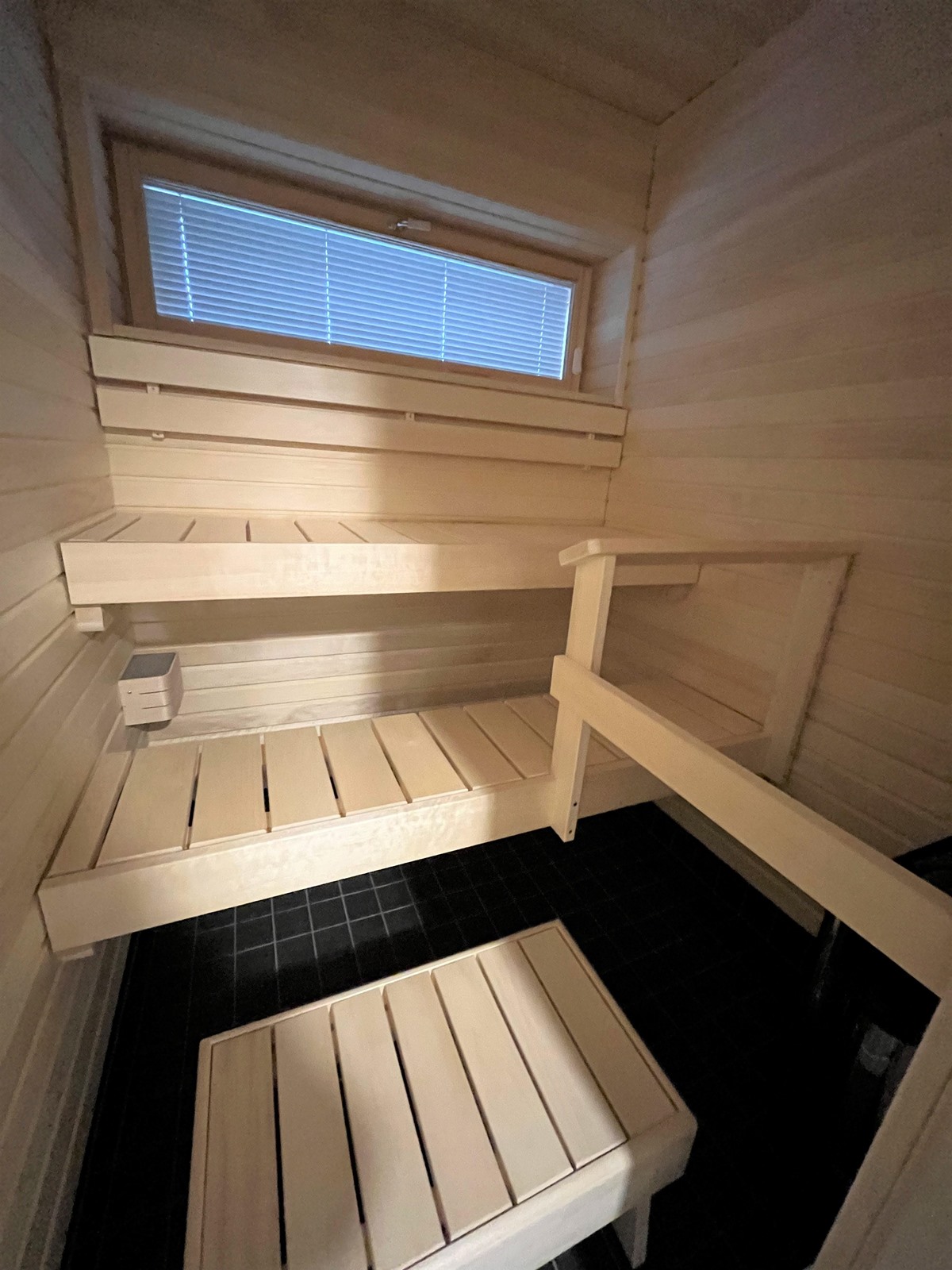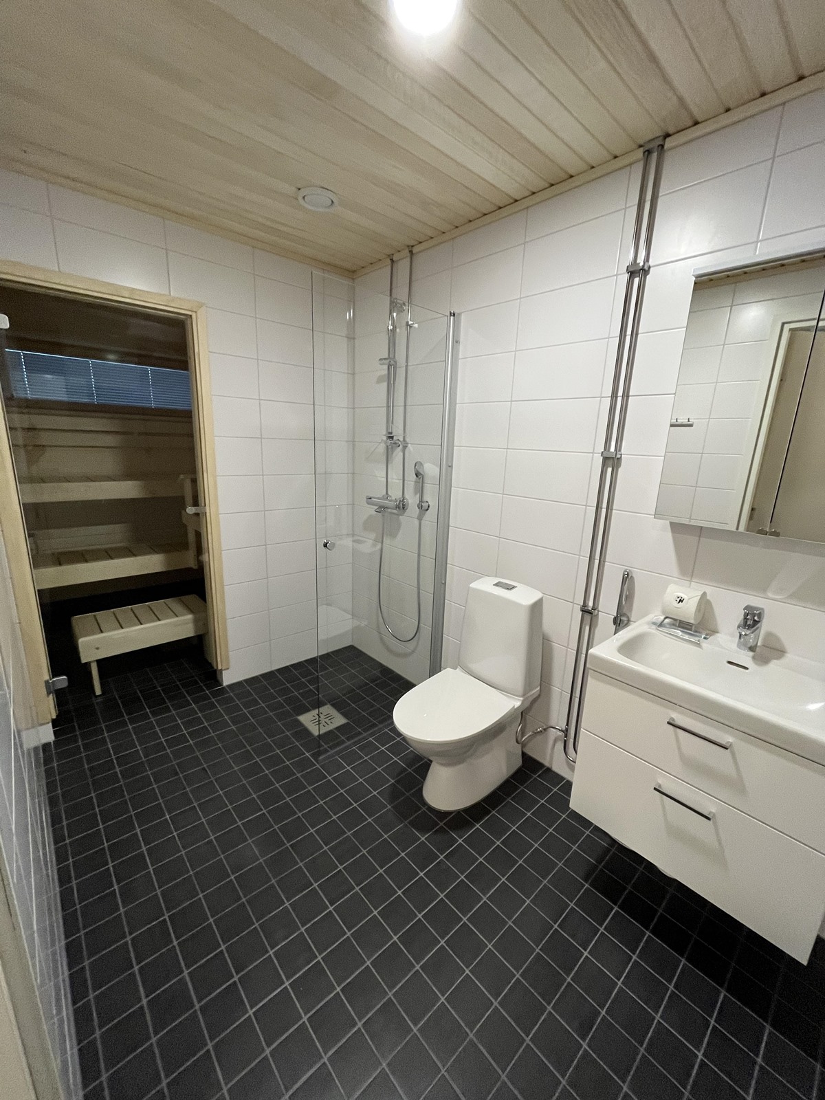 - Sauna, sähkökiuas, suihku, suihkuseinä, peilikaappi, allaskaappi, pesukoneliitäntä, lattialämmitys.