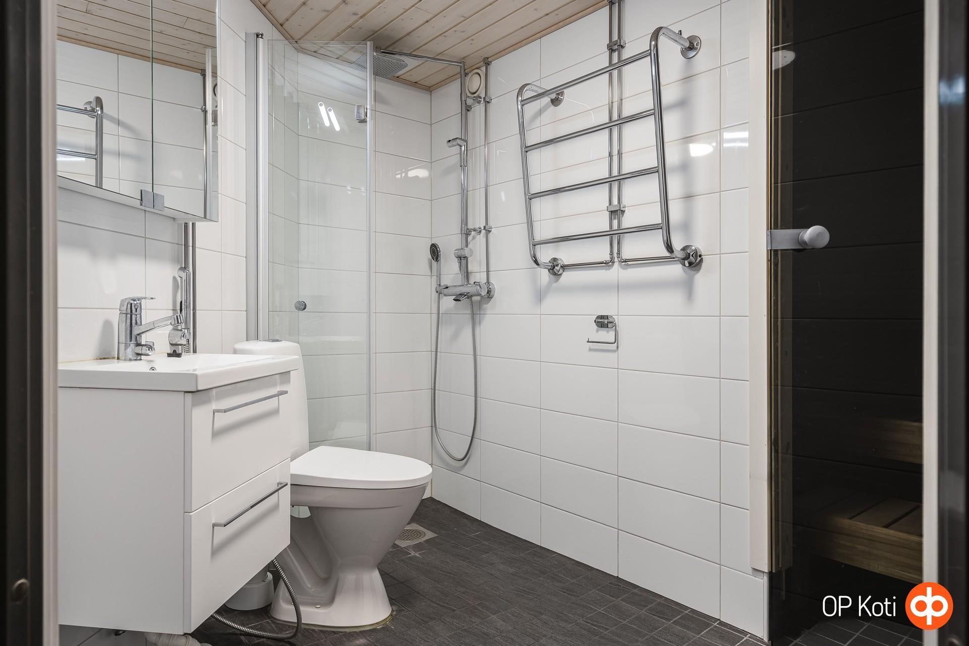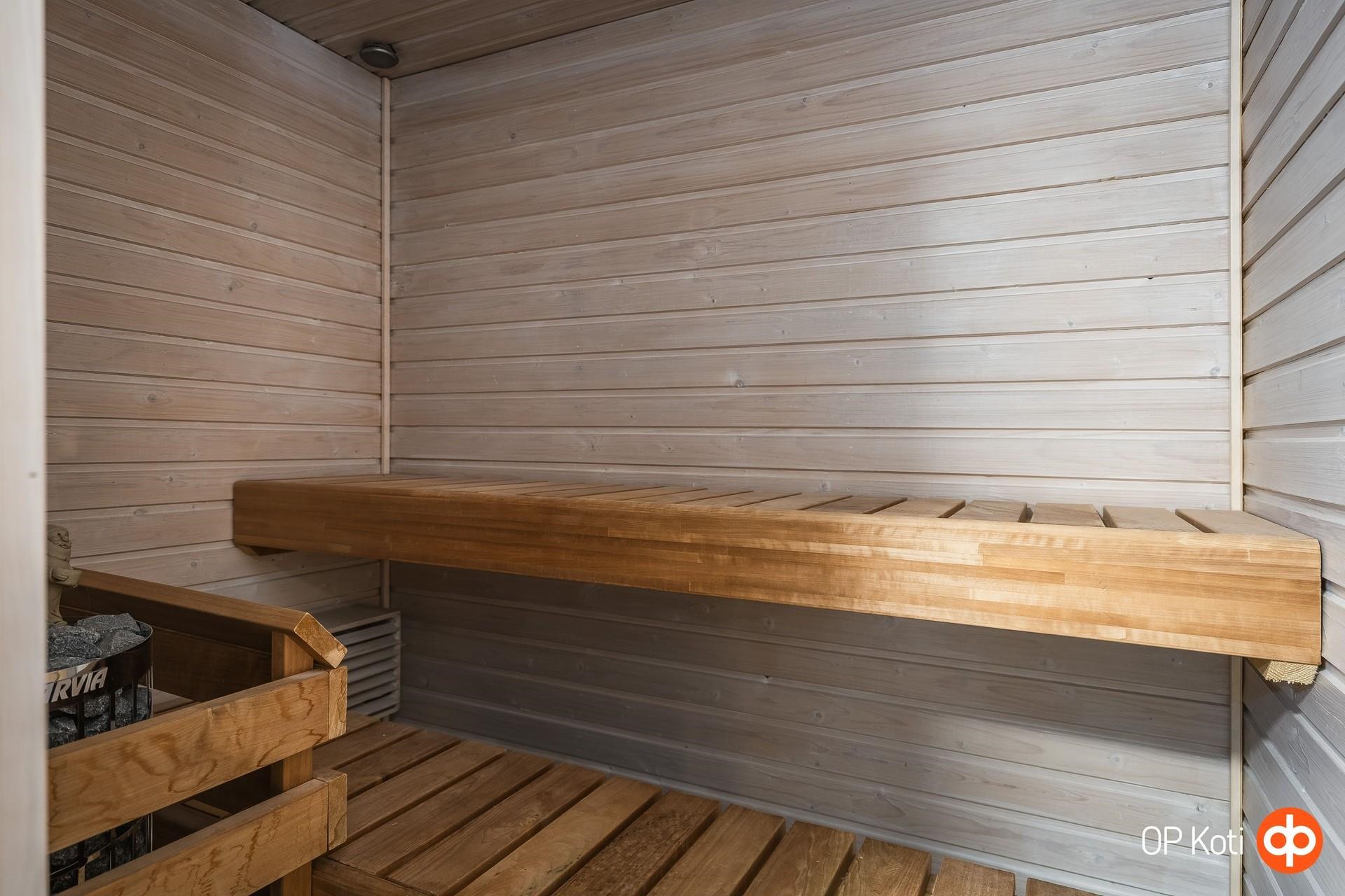 - Sauna, sähkökiuas, kylpyhuone, suihku, peilikaappi, allaskaappi, pesukoneliitäntä, kiinteät valaisimet. Suihkuovet, pyyhekuivain - vesikiertoinen