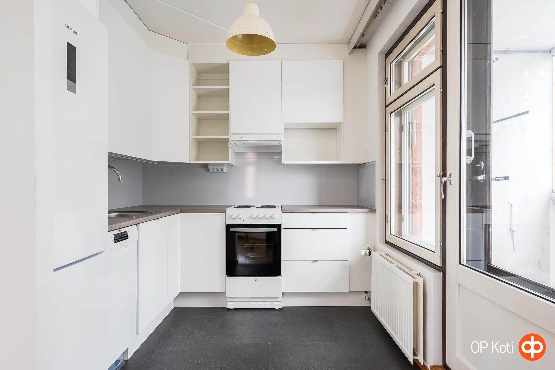 - Jääkaappi, jääkaappipakastin, sähköliesi, liesituuletin, kaapistot, kiinteät valaisimet. Keittiössä on upouudet kaapistot. Välitila ja lattia on myös uudistettu.