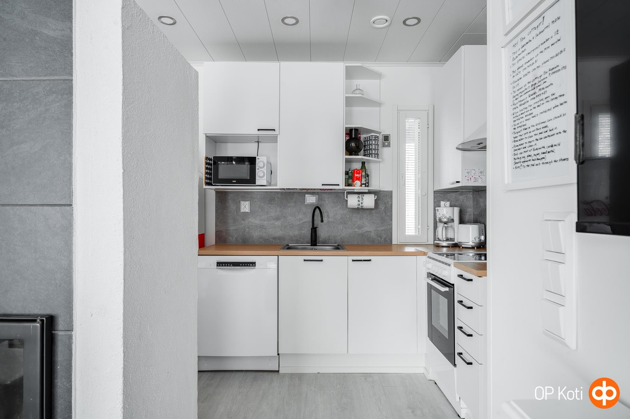 - Jenkkikaappi, lattialiesi, keraaminen liesi, liesituuletin, mikroaaltouuni, astianpesukone, kaapistot, kiinteät valaisimet, pöytätasojen materiaali laminaattitasot.