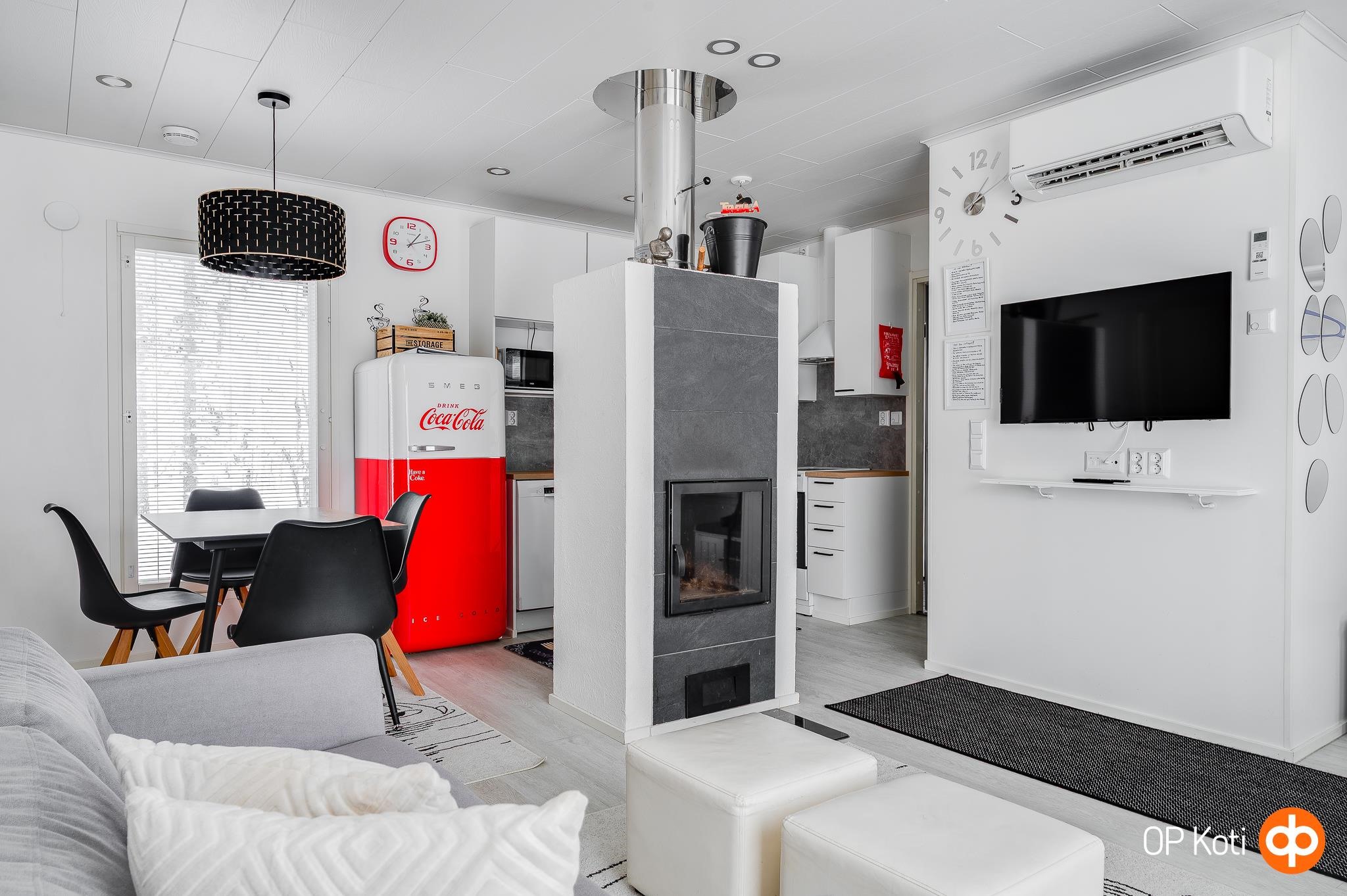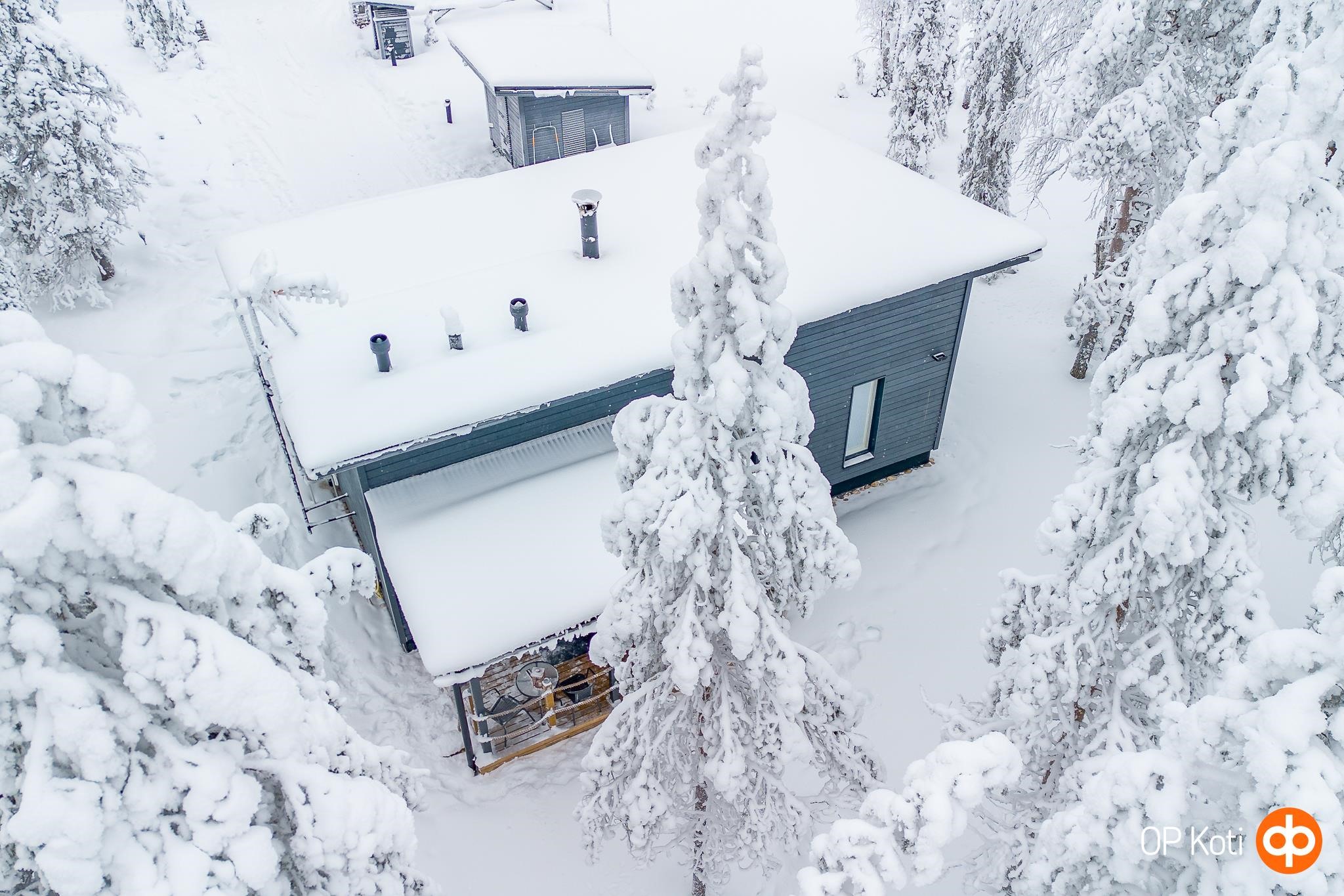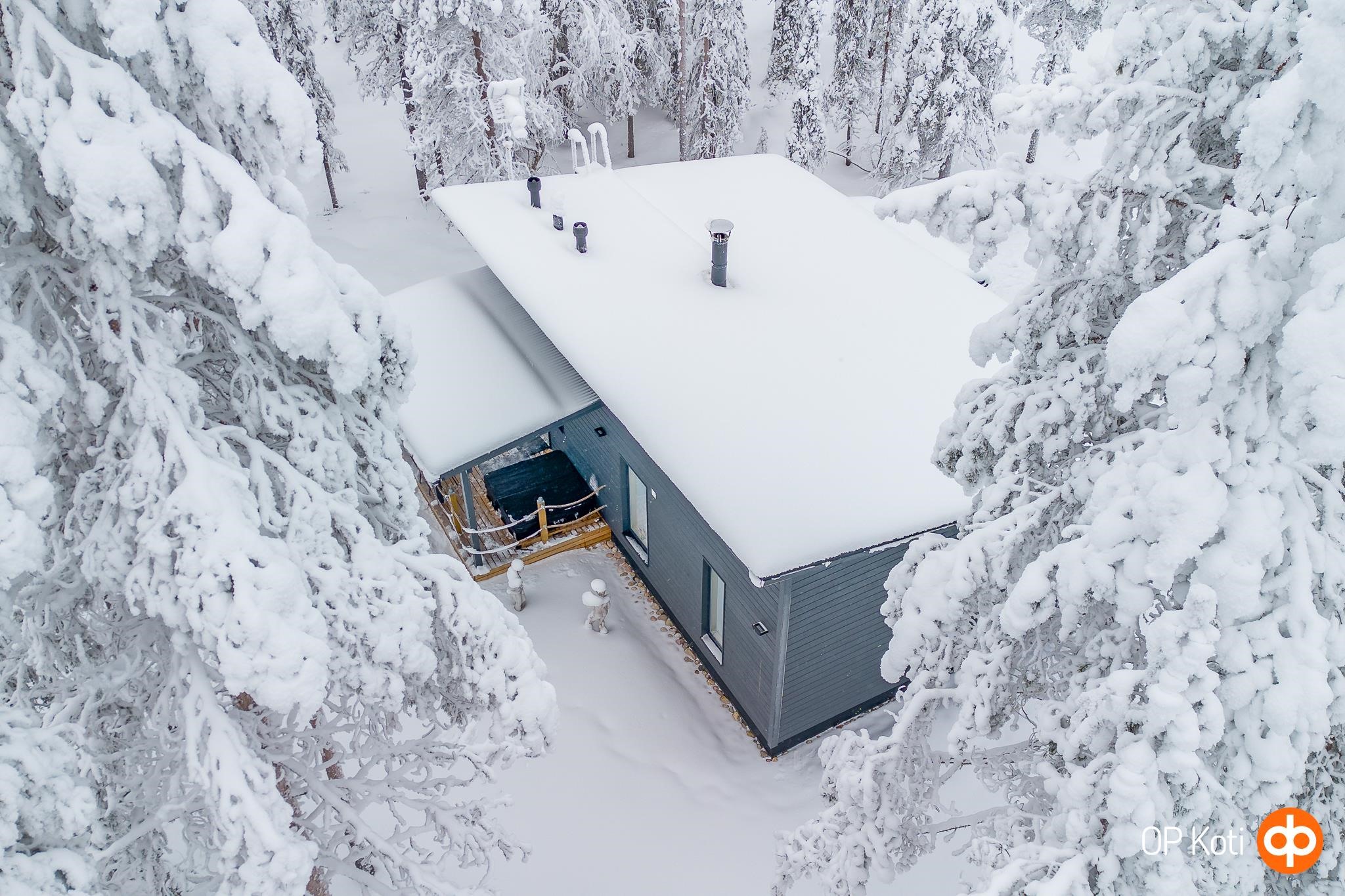 Kodikkaat oleskelutilat yhdistyvät keittiöön, jonka varustelu täyttää vaativankin tarpeet: astianpesukone, laadukkaat pintamateriaalit ja hyvin suunniteltu työskentelytila tekevät ruoanlaitosta vaivatonta. Olohuoneen varaava takka sekä ilmalämpöpumppu takaavat miellyttävän lämpötilan ympäri vuoden, ja sähköinen lattialämmitys tuo lisämukavuutta. Tilavassa kylpyhuoneessa on oma sauna sekä kodinhoitotilaa, ja poreallas terassilla kruunaa rentouttavat hetket tunturimaisemissa.