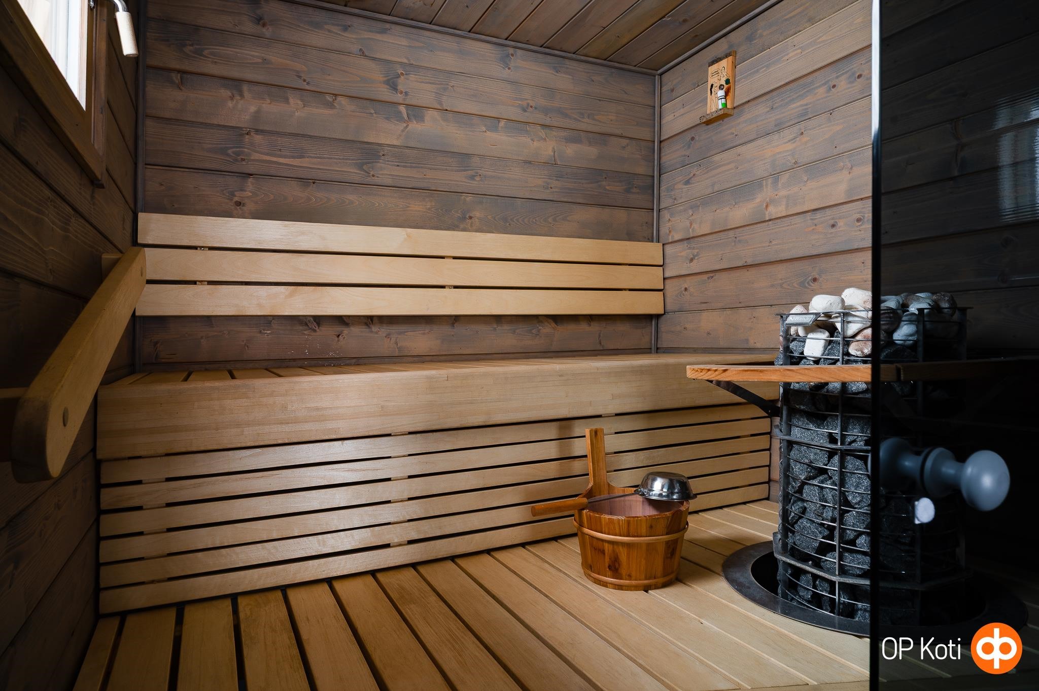 - Sauna, sähkökiuas, kylpyhuone, erillinen wc, suihku, poreallas, kaapit, pesukoneliitäntä, lattialämmitys, kiinteät valaisimet.