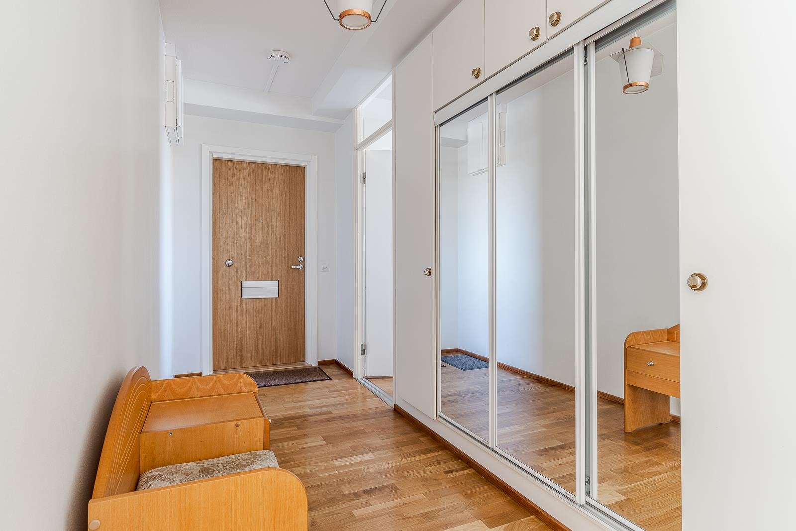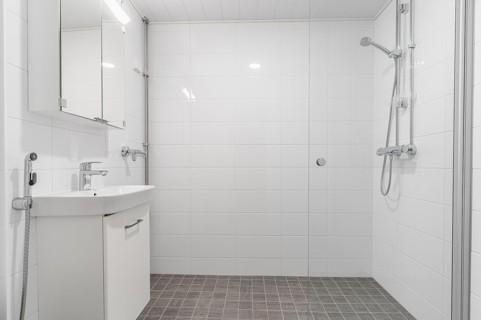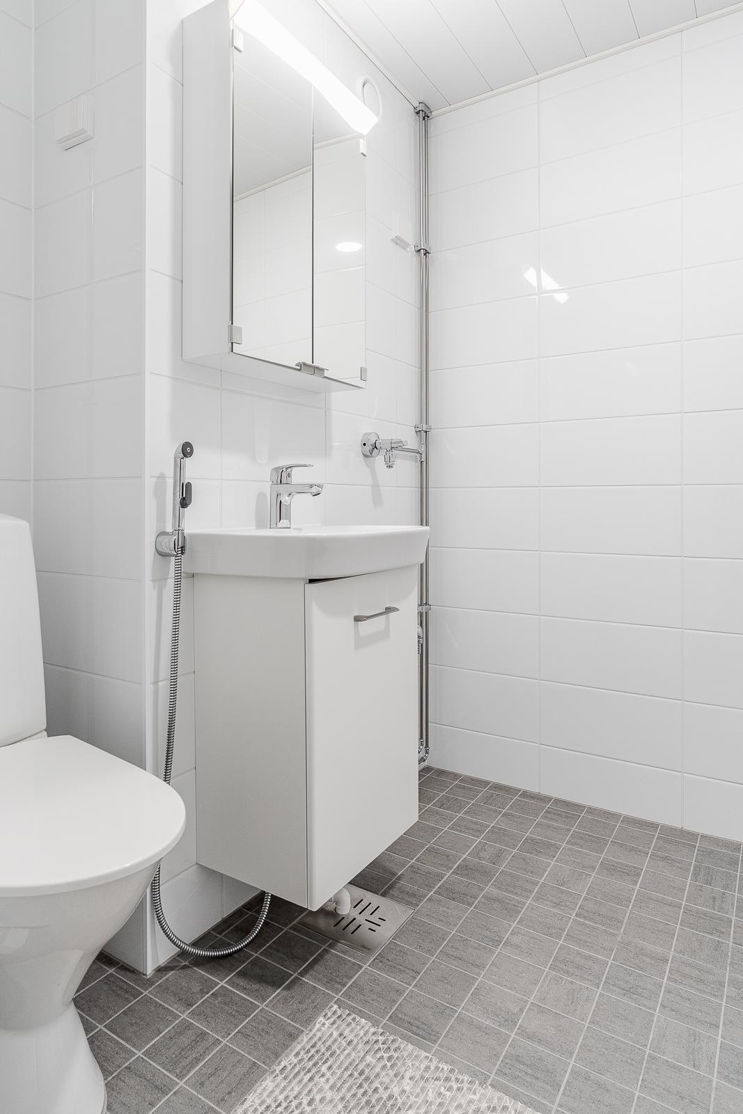 - Kylpyhuone, suihku, suihkuseinä, peilikaappi, allaskaappi, pesukoneliitäntä, lattialämmitys, kiinteät valaisimet.