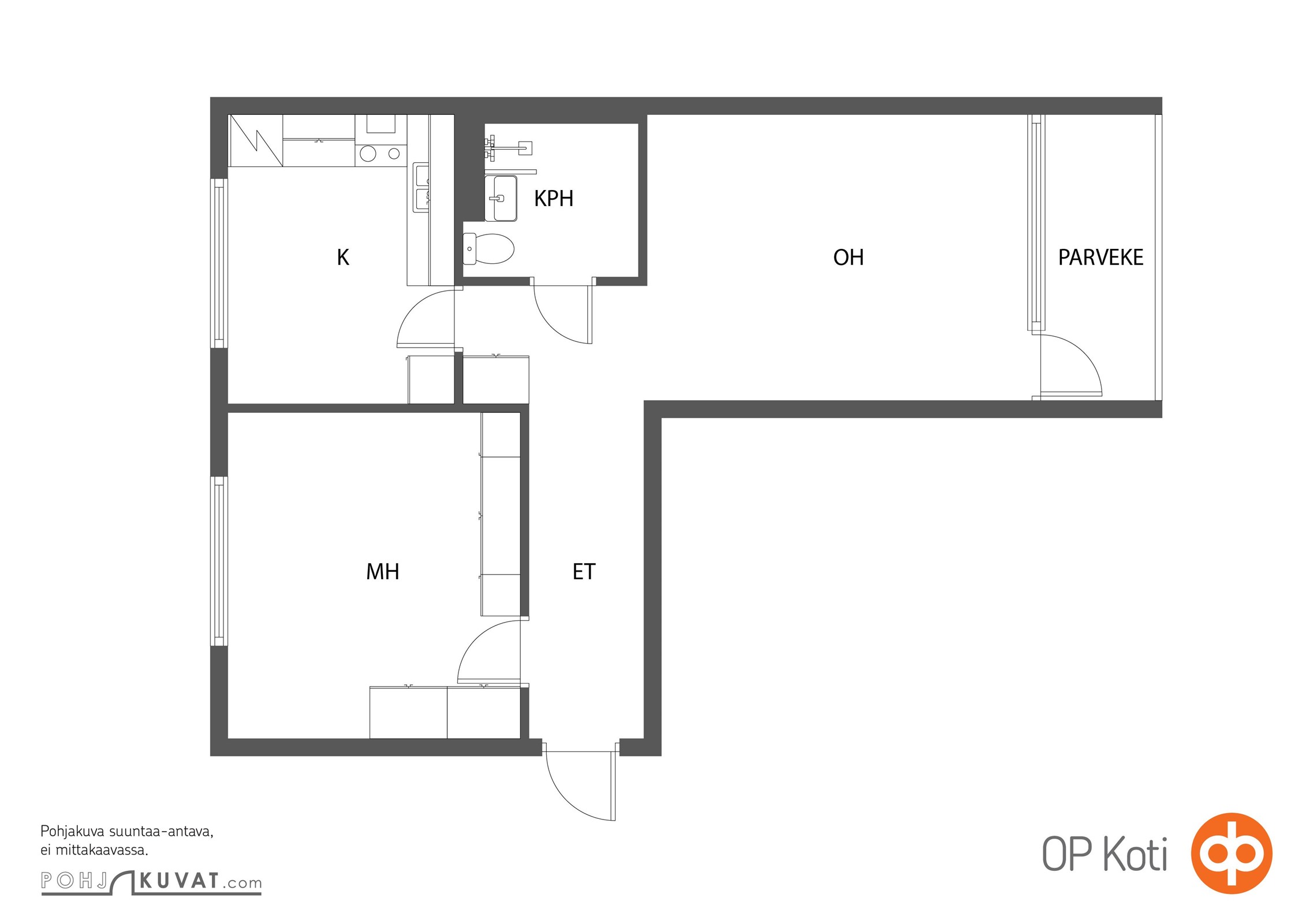 - parveke etelään, keittiö pohjoiseen