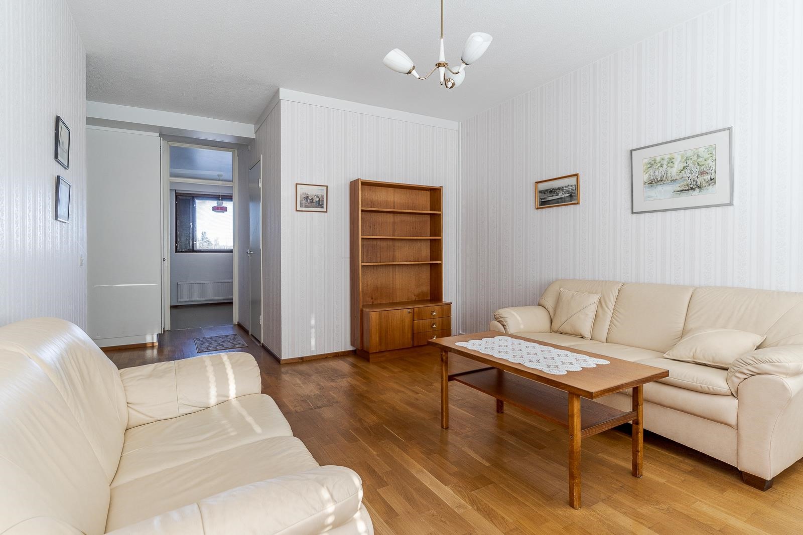 Keittiö: Lattia muovimattoa, seinäpinnat maalattu. Olohuone: Lattia parkettia (tammilauta), seinäpinnat tapetoitu. Makuuhuone 1: Lattia parkettia (tammilauta), seinäpinnat tapetoitu. Kylpyhuone: Lattia- ja seinäpinnat laatoitettu. Eteinen: Lattia parkettia (tammilauta), seinäpinnat maalattu.