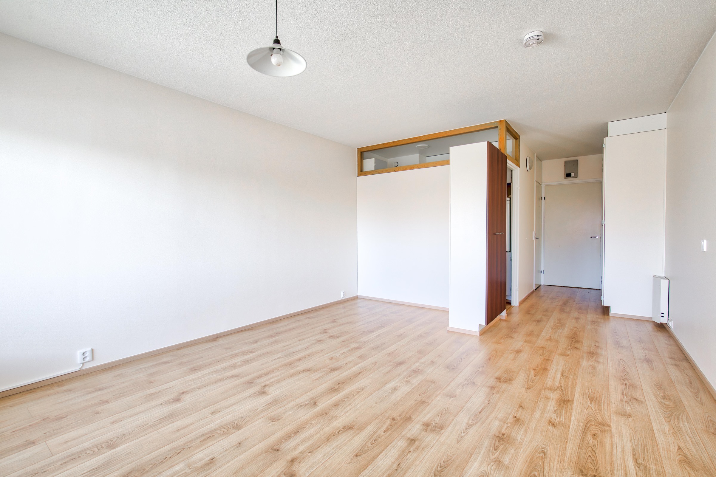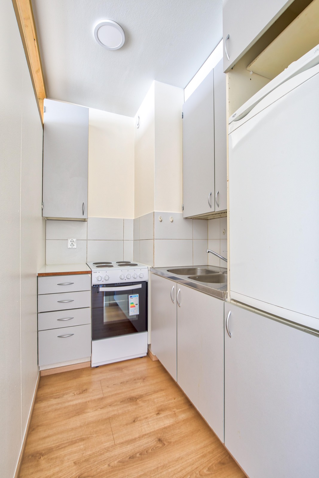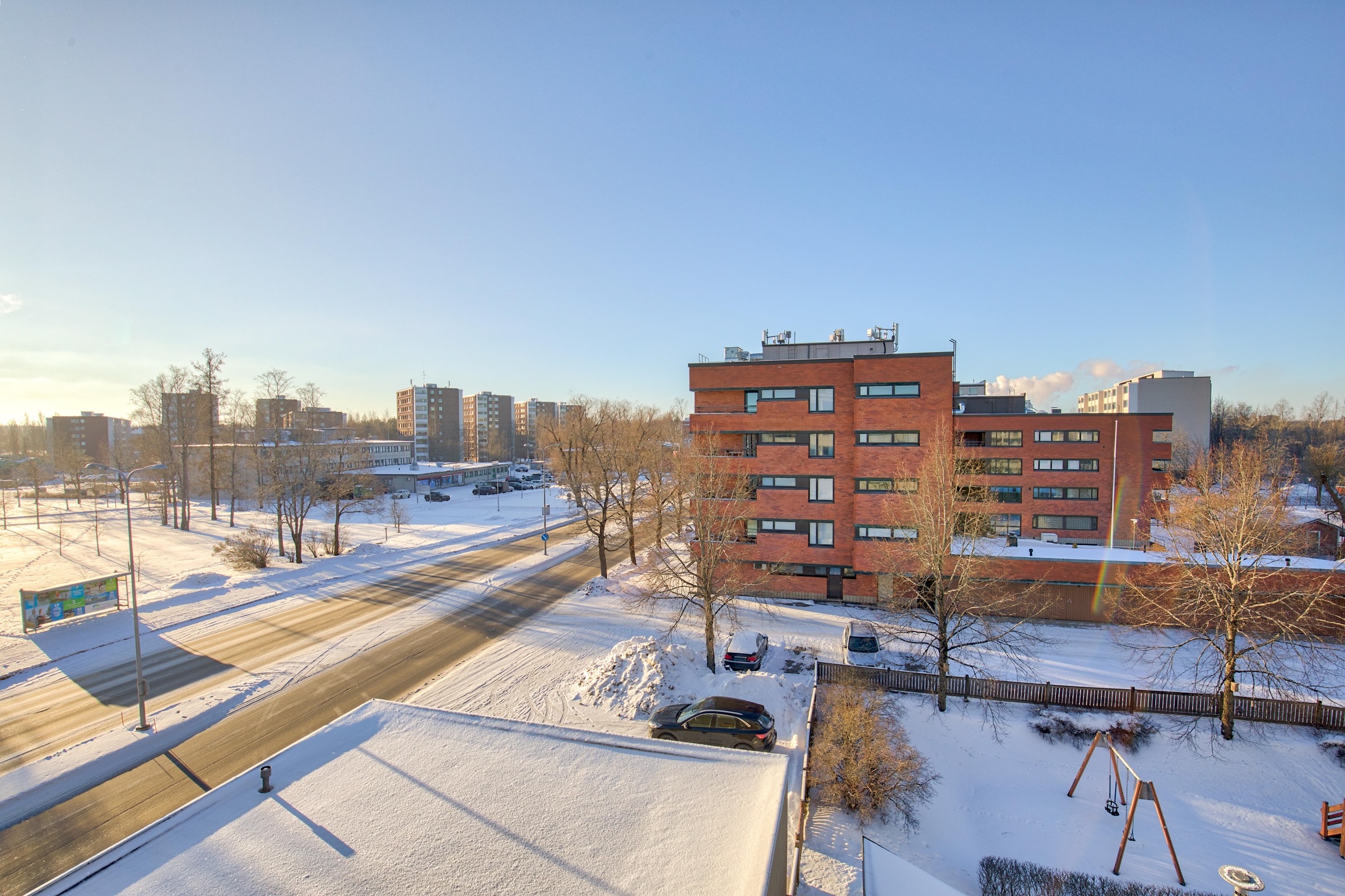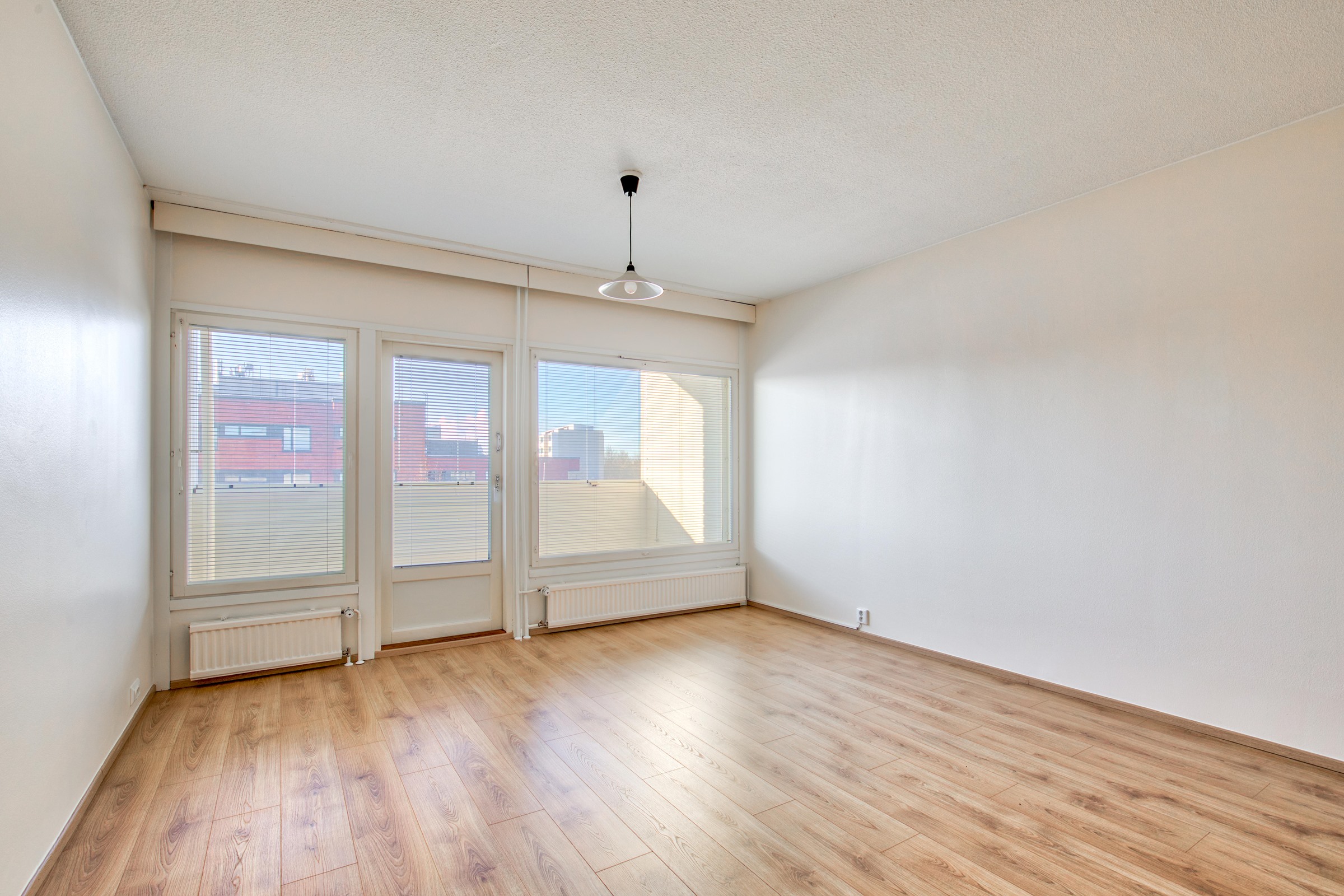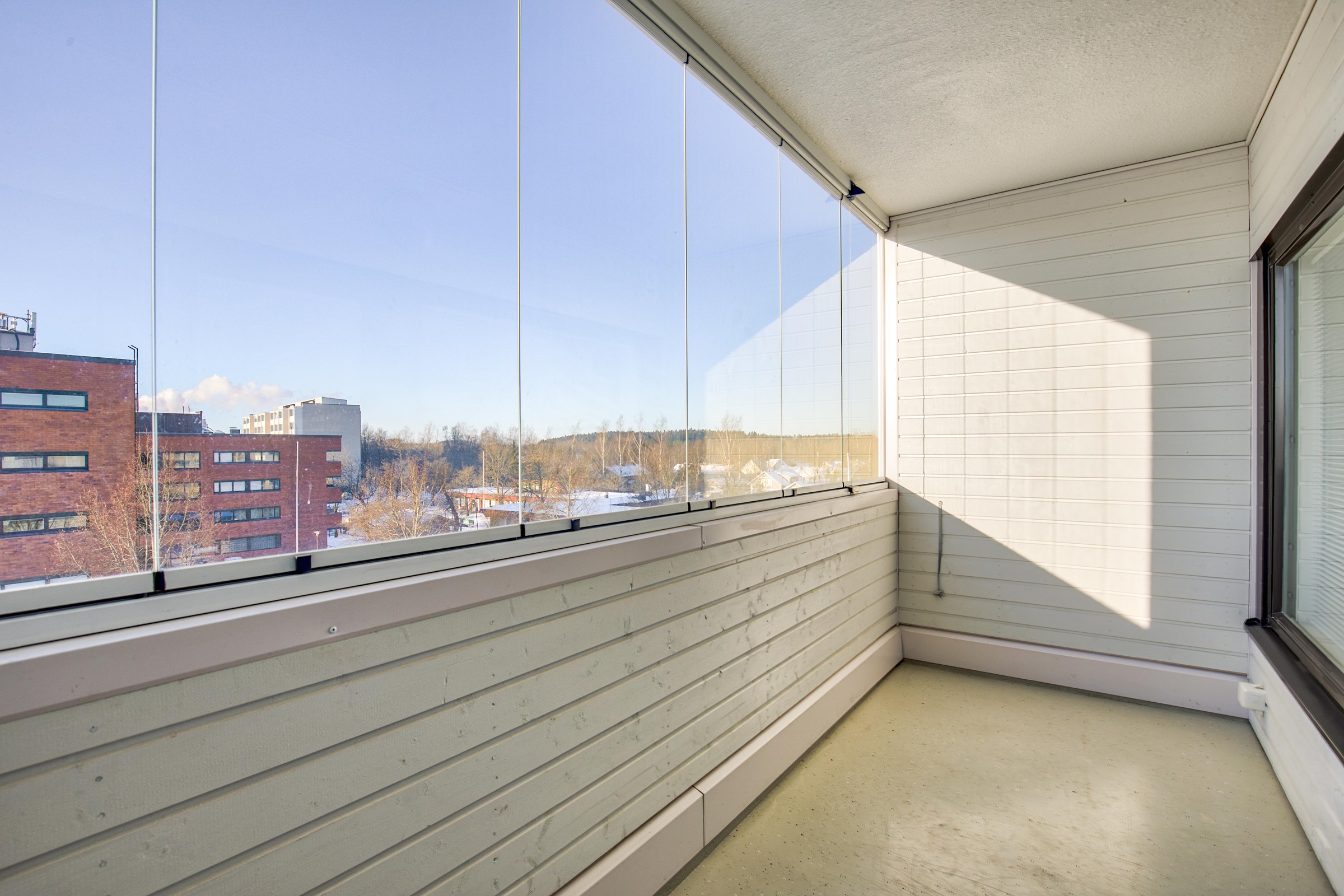 Viidennen kerroksen valoisa yksiö lasitetulla parvekkeella odottaa uusia omistajia Kuhalankadulla.