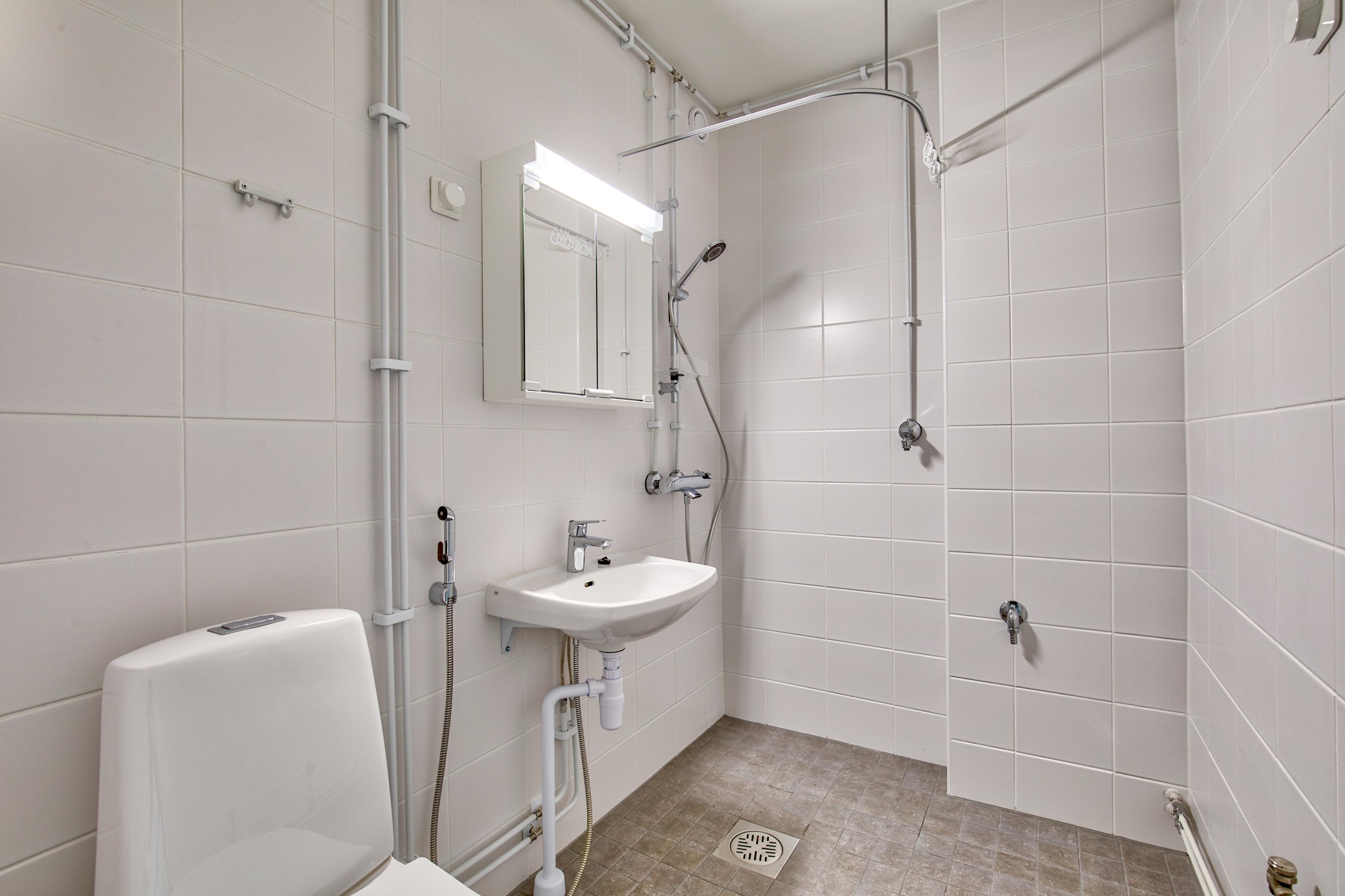 - Kylpyhuone, suihku, peilikaappi, pesukoneliitäntä, kiinteät valaisimet.