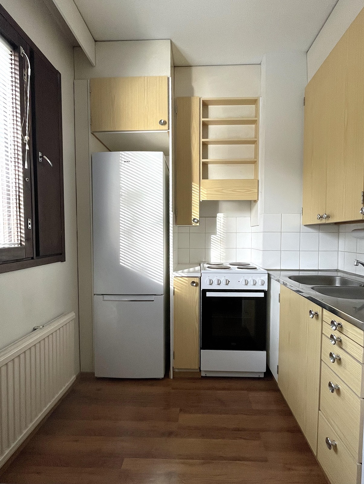 - Jääkaappipakastin, lattialiesi, kaapistot, kiinteät valaisimet.