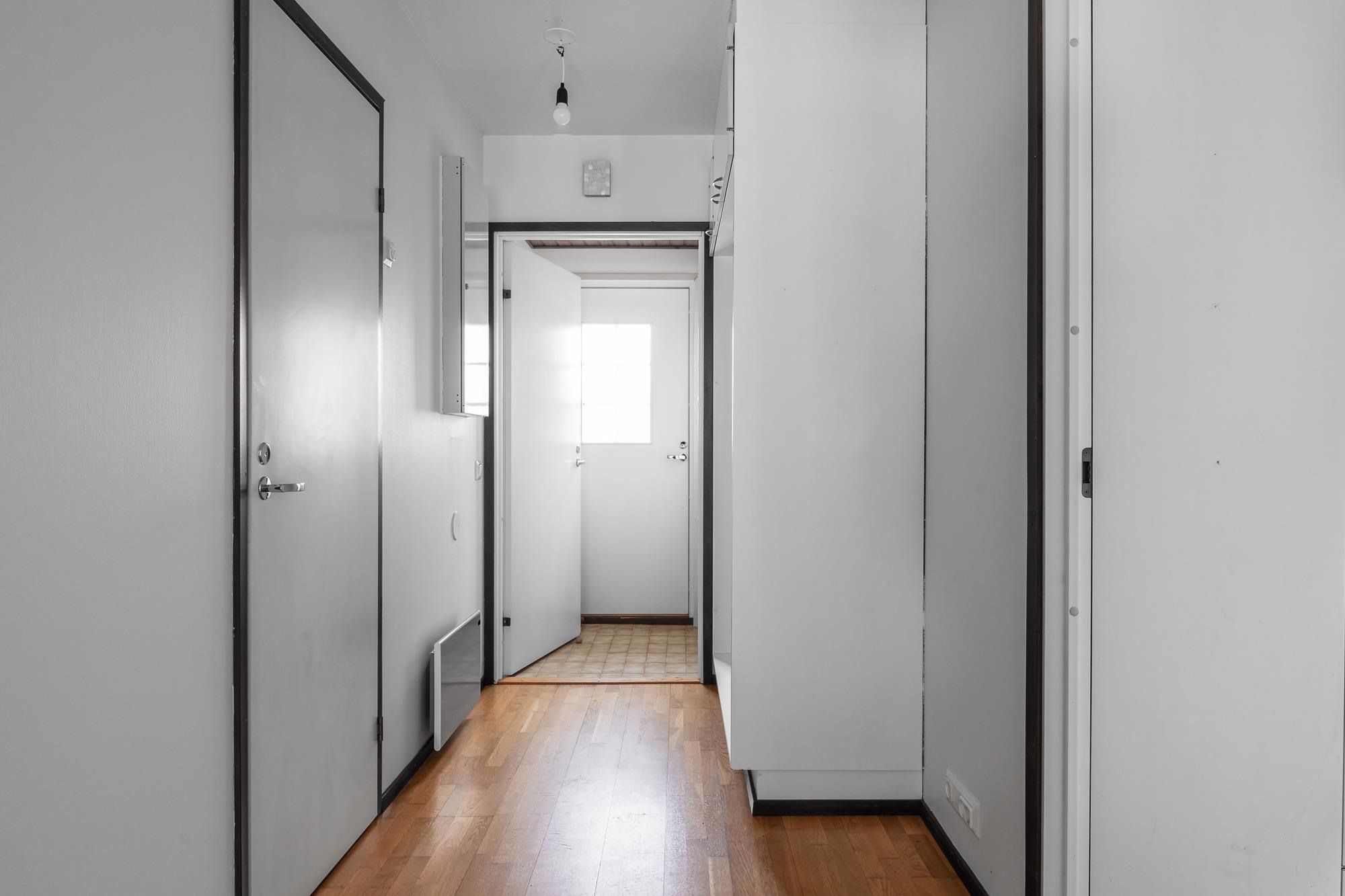 Keittiö: laminaattilattia. Olohuone: parkettilattia, seinät maalattu. Makuuhuone 1: parkettilattia, seinät maalattu. Sauna: paneloitu. Kylpyhuone: laatoitettu. Wc: kaakeloitu.