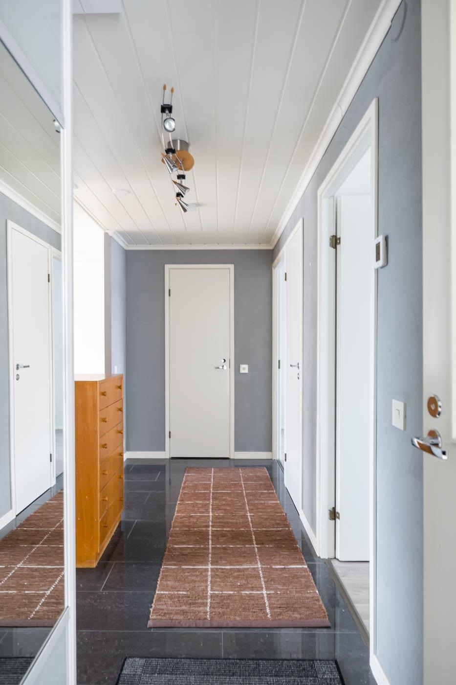 Keittiö: maali, laatta. Olohuone: tapetti, parketti. Makuuhuone 1: tapetti, laminaatti. Makuuhuone 2: maali, laminaatti. Sauna: paneeli, laatta. Kylpyhuone: laatta, laatta. Eteinen: maali, laatta. Wc: tapetti/laatta, laatta.