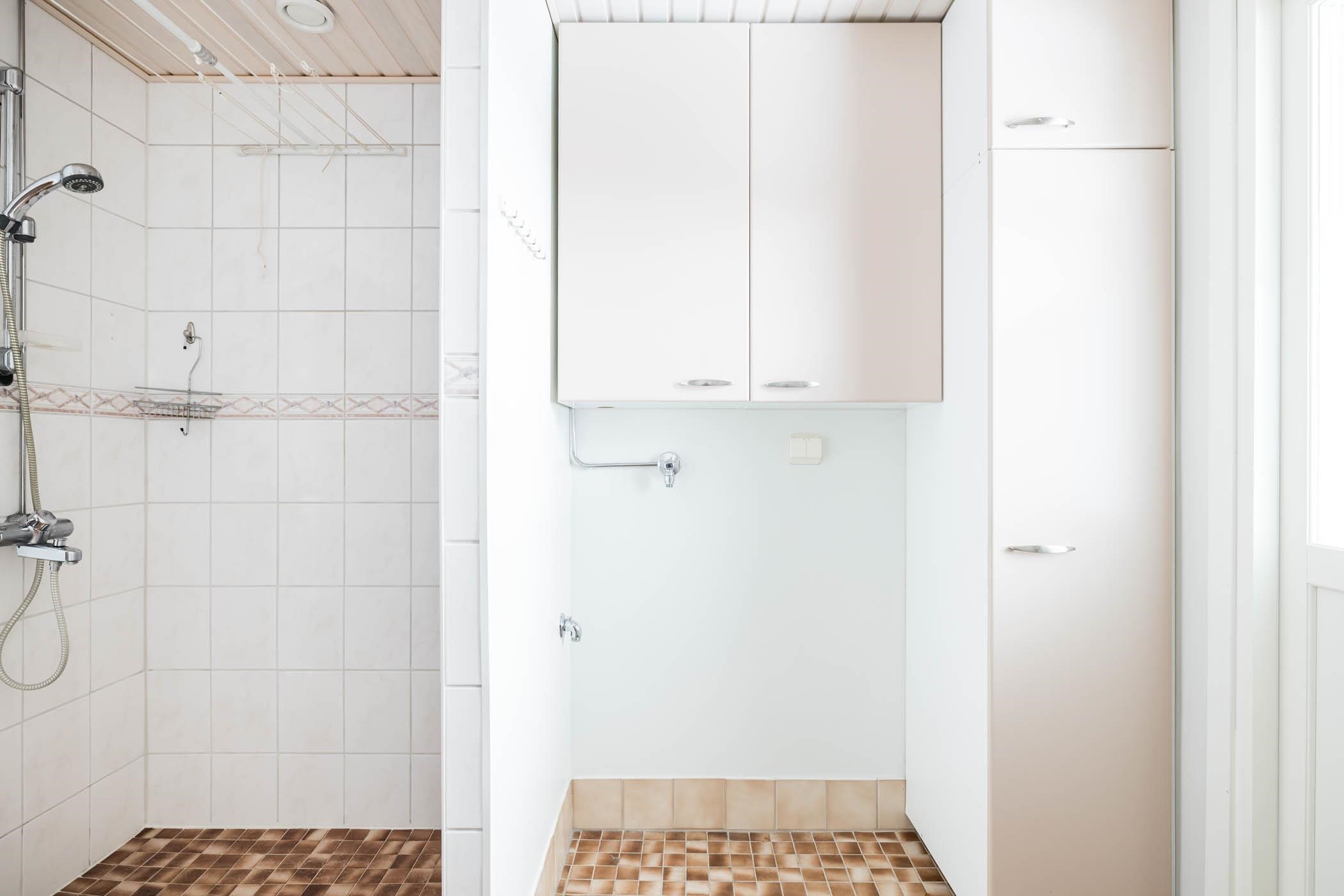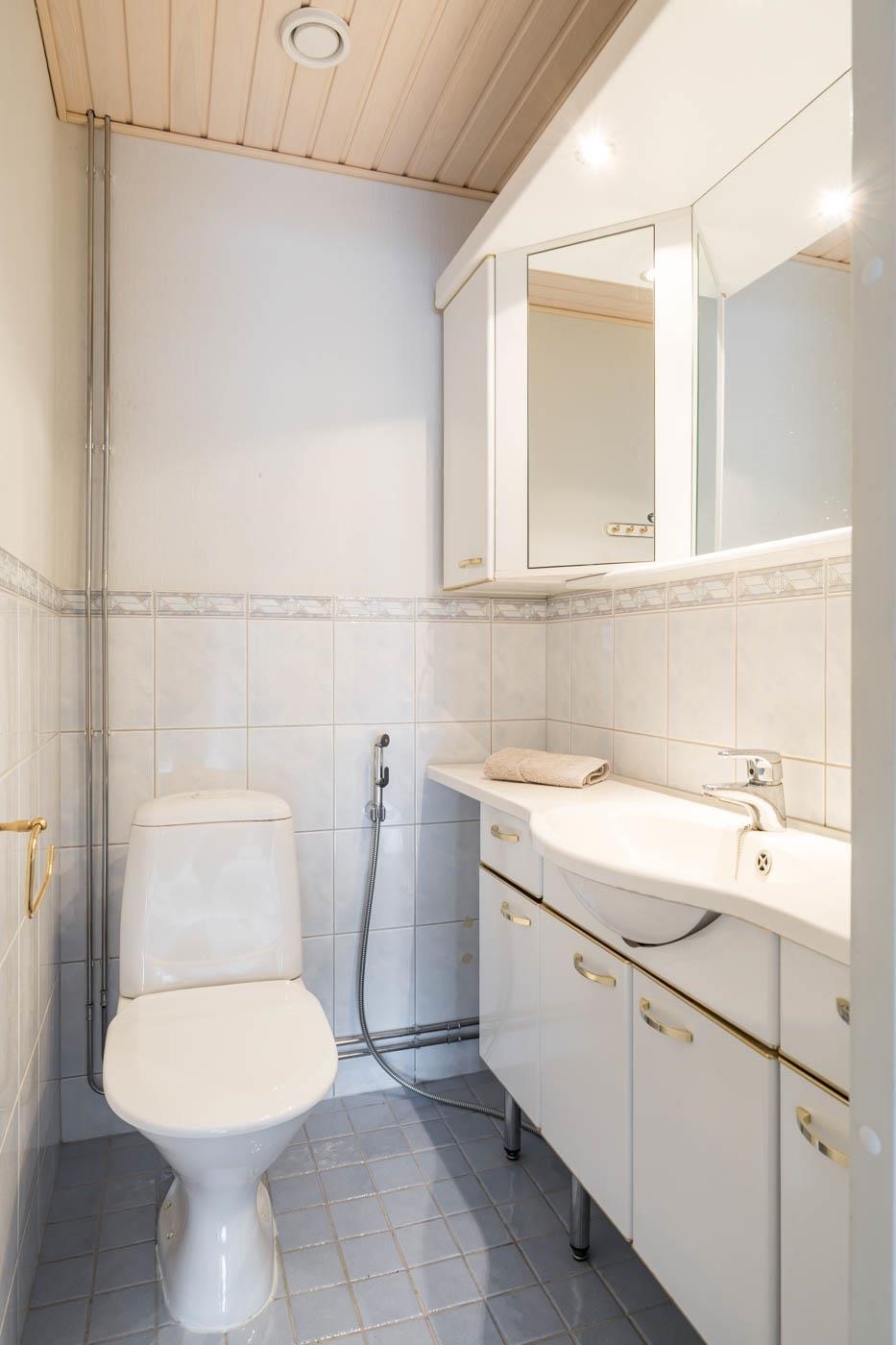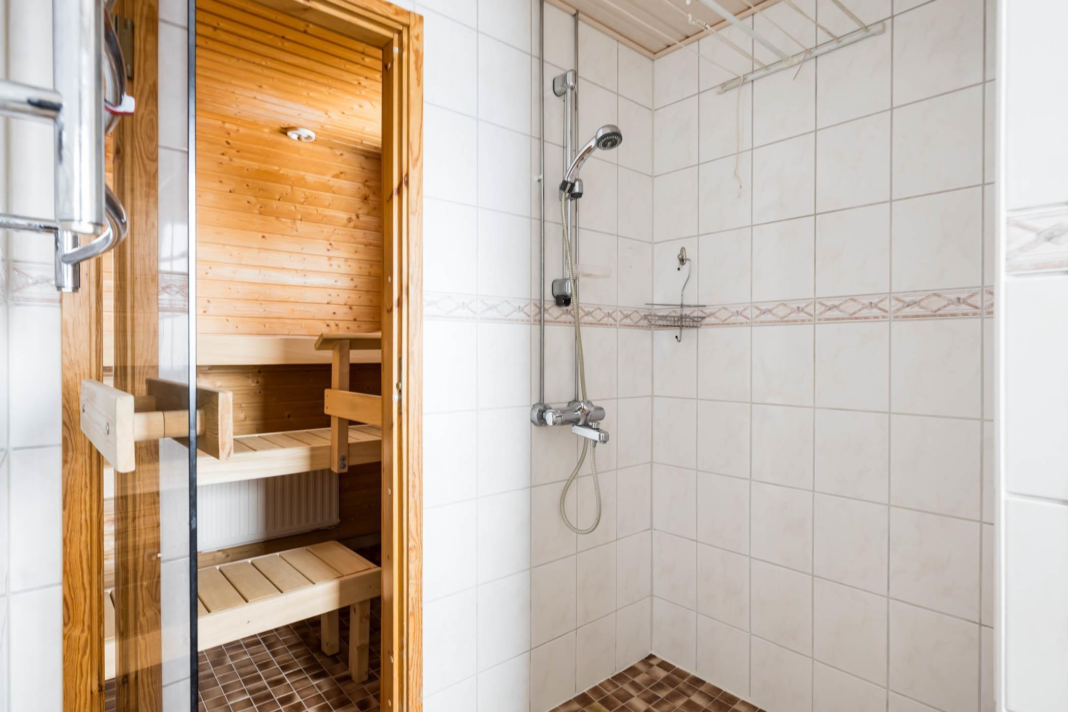 - Sauna, sähkökiuas, erillinen wc, suihku, peilikaappi, kaapit, allaskaappi, pesukoneliitäntä, kiinteät valaisimet.