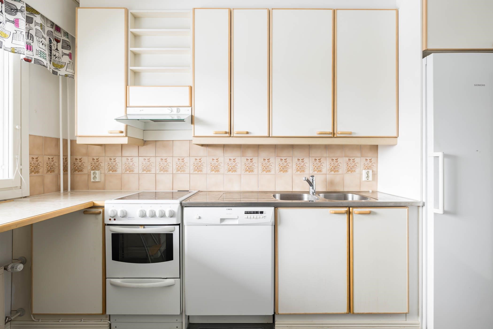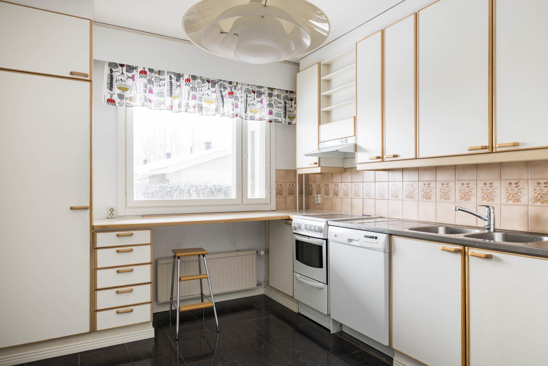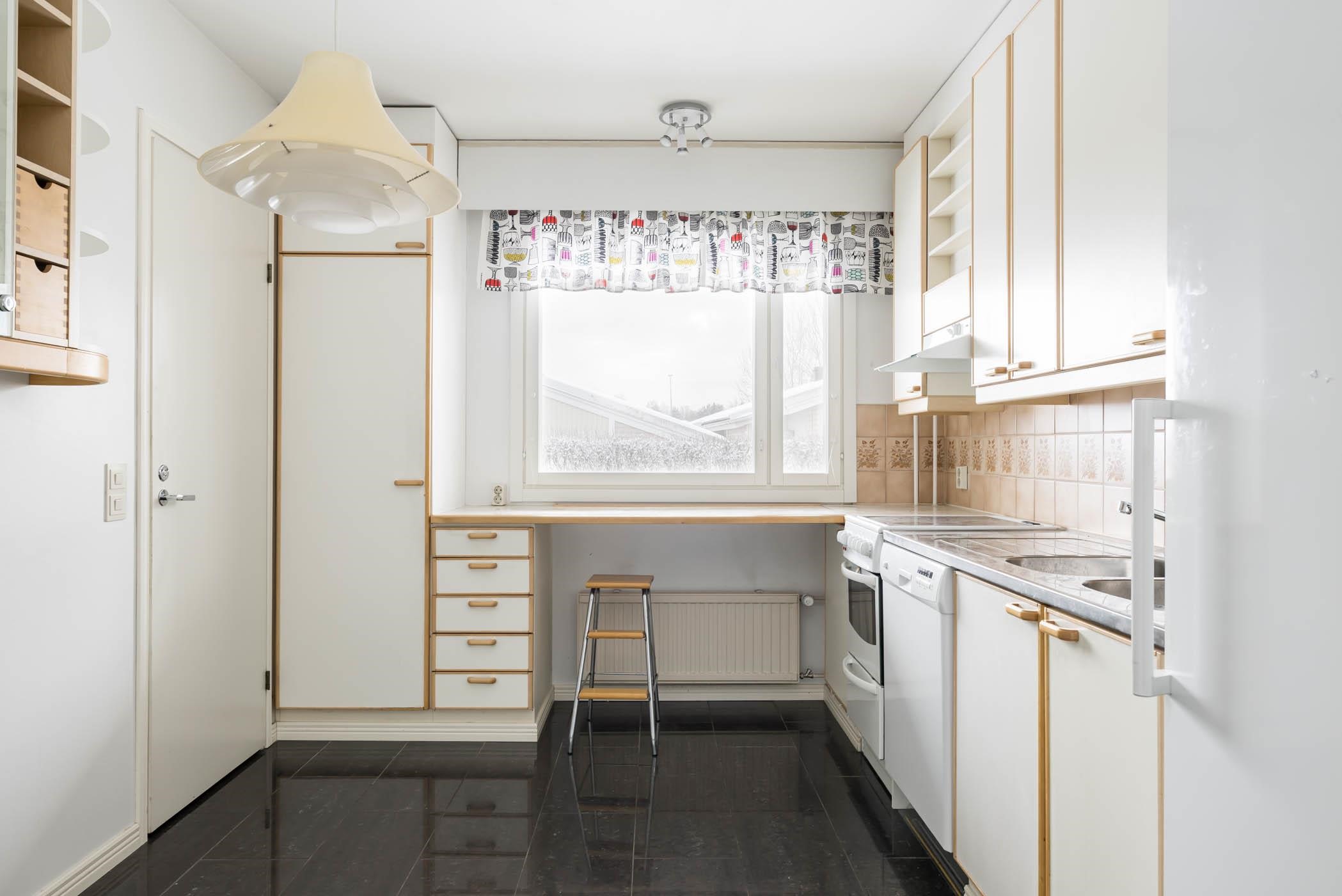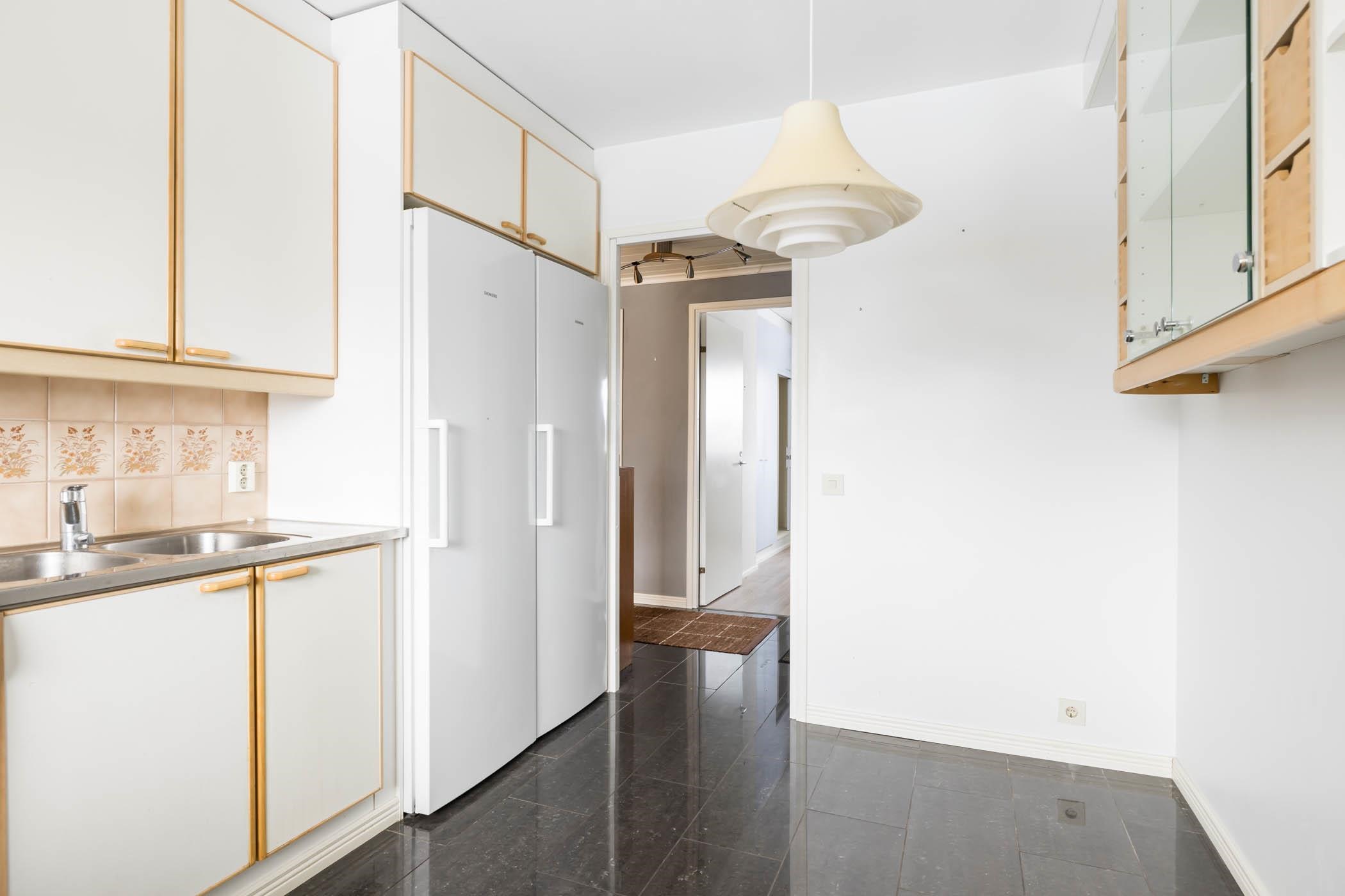 - Jääkaappi, pakastekaappi, keraaminen liesi, liesituuletin, astianpesukone, kaapistot, kiinteät valaisimet.