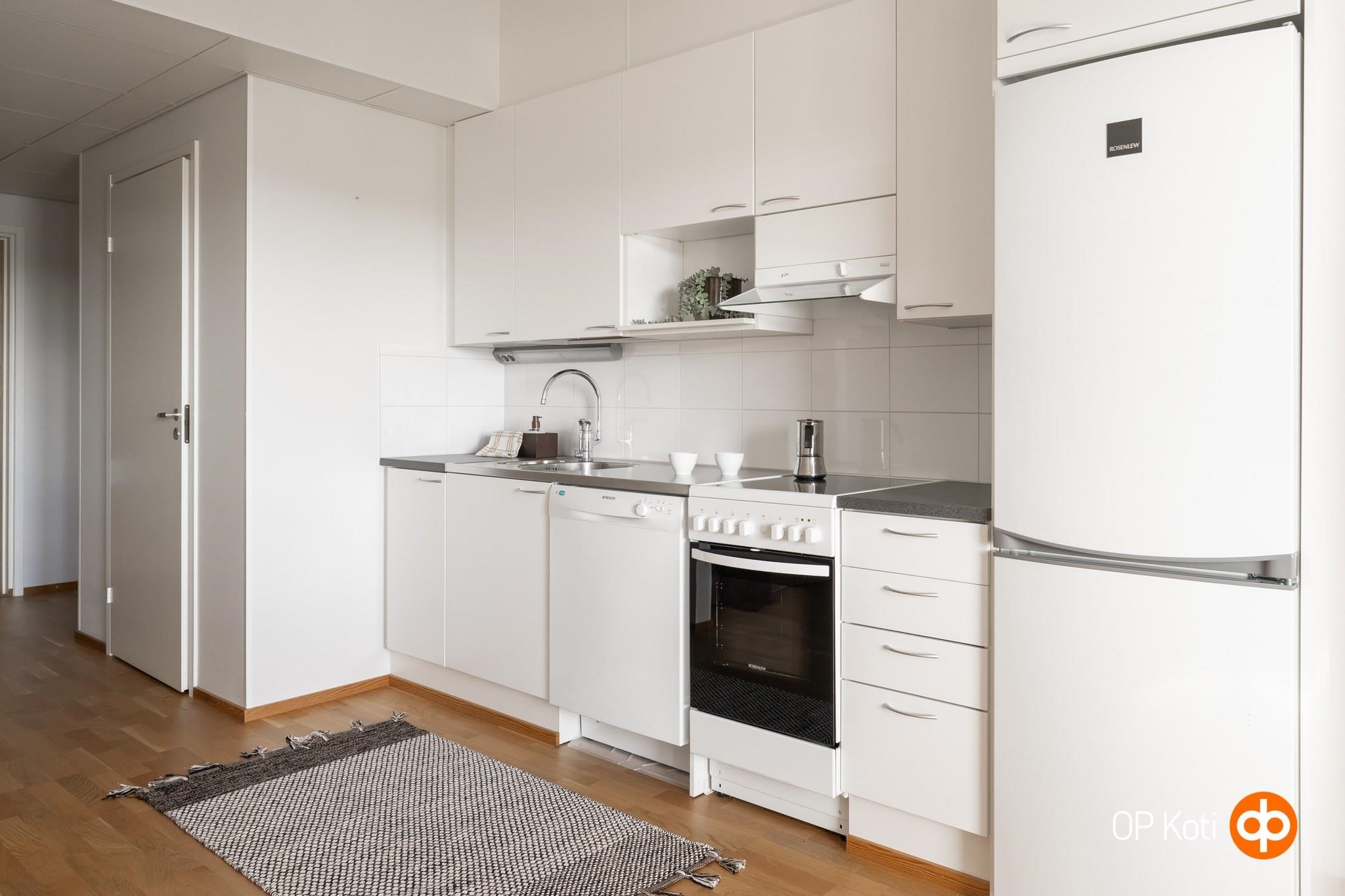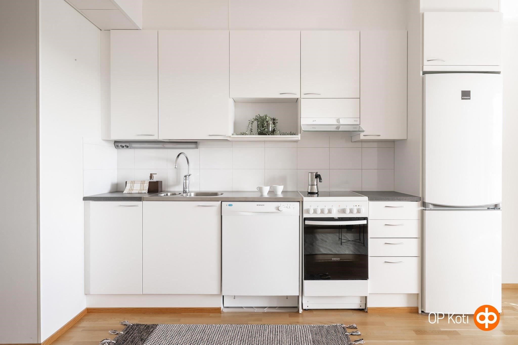 - Jääkaappipakastin, keraaminen liesi, liesituuletin, astianpesukone, kaapistot, kiinteät valaisimet. Sauna/kph/wc: Kylpyhuone, suihku, peilikaappi, pesukoneliitäntä, lattialämmitys. Pintamateriaalit: Keittiö: seinät maalatttu, välitila laatoitettu, lattiassa parketti. Olohuone: seinissä maali/tapetti, lattiassa parketti. Kylpyhuone: seinät ja lattia laatoitettu. Eteinen: seinät maalatttu, lattiassa parketti. Säilytystilat: Vaatehuone, irtaimistovarasto Jääkaappipakastin, lattialiesi 50 cm leveä 4-levyinen keraaminen turvaliesi, liesikupu, astianpesukone, kaapistot.
