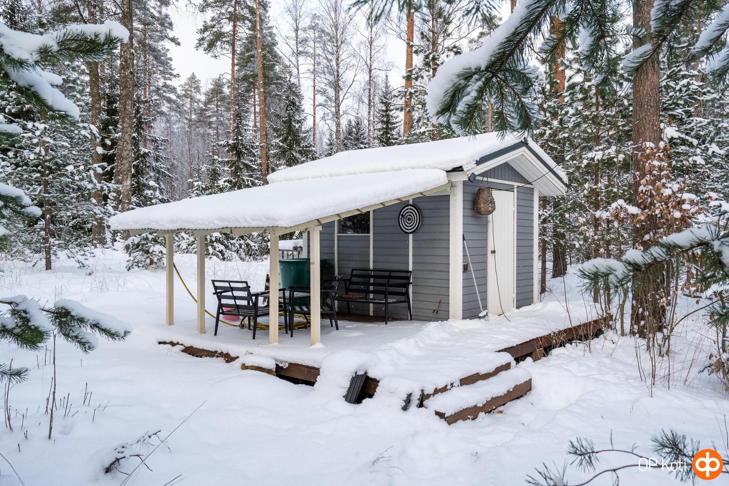 Pihapiirissä on kahden auton katos lämpimine varastoineen sekä erillinen lämmin hallirakennus.