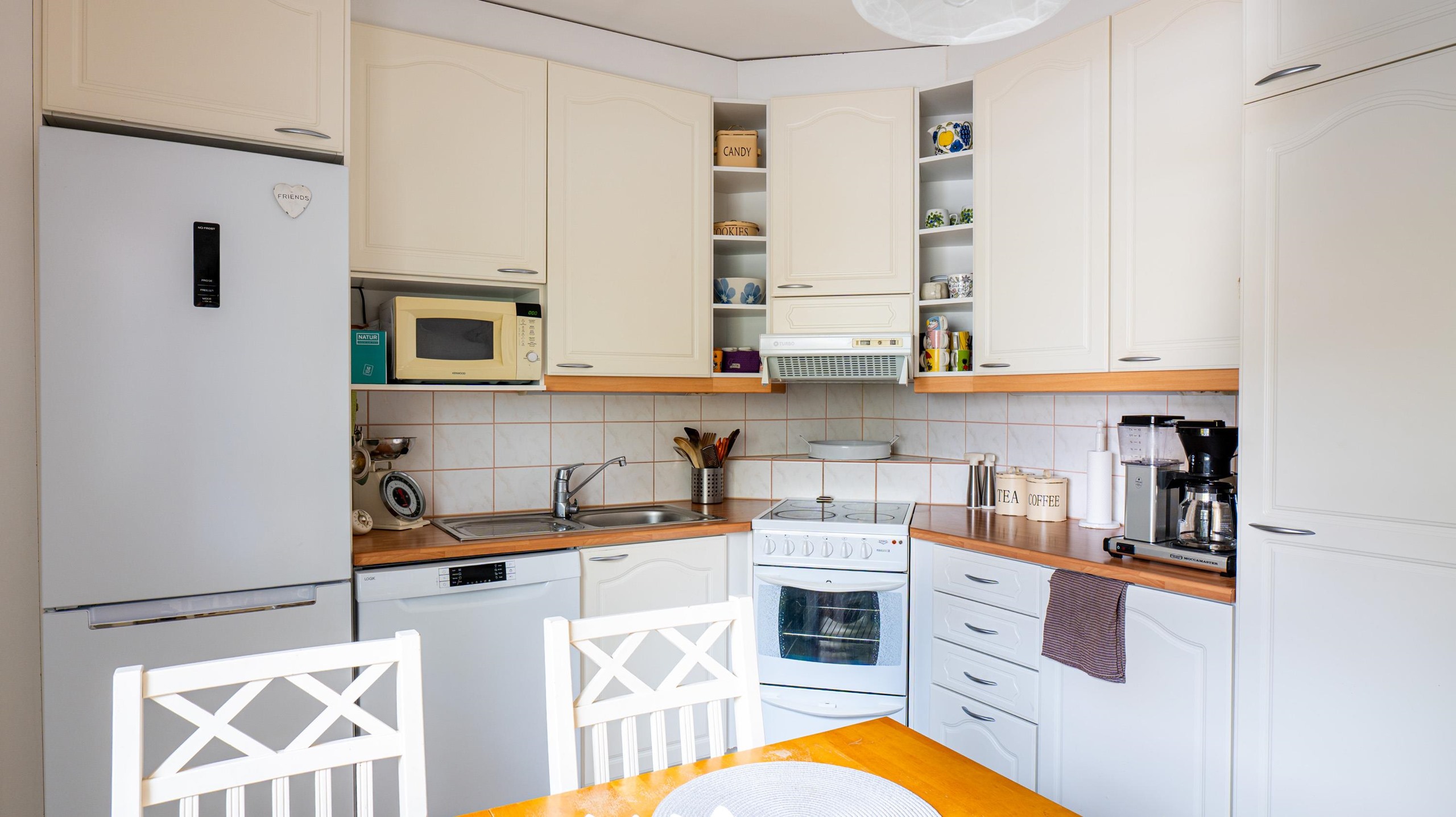 - Jääkaappipakastin, sähköliesi, liesituuletin, astianpesukone, kaapistot, kiinteät valaisimet.
