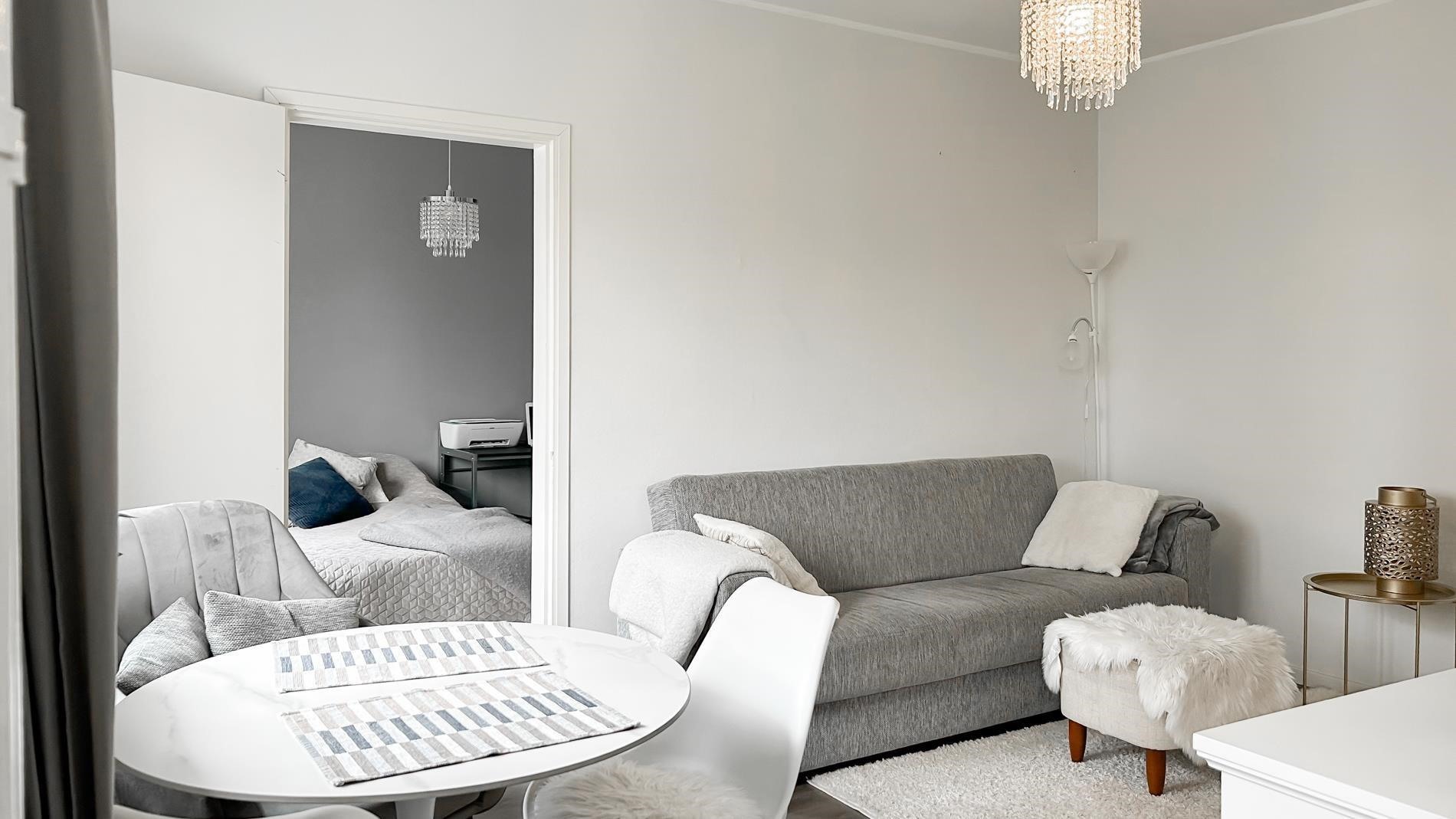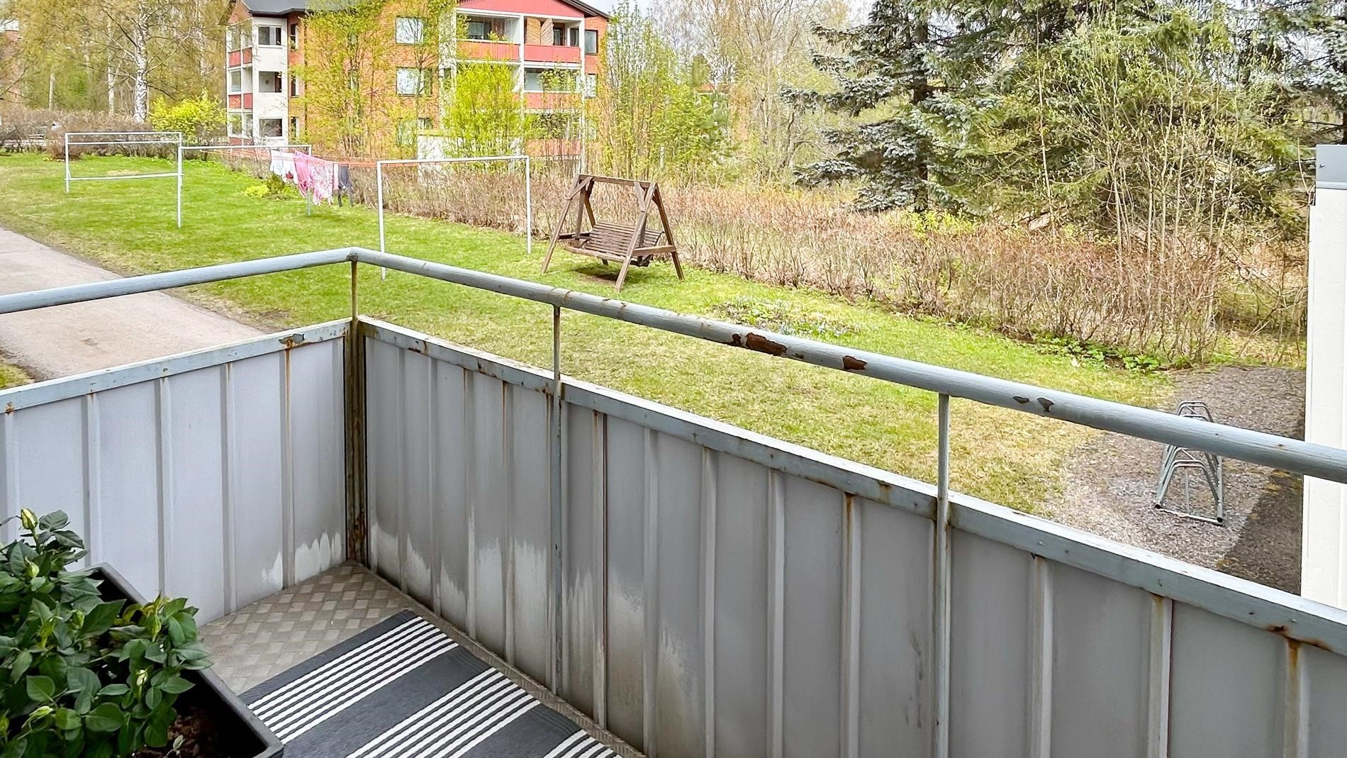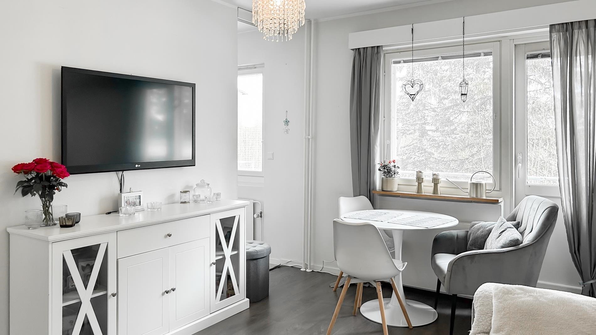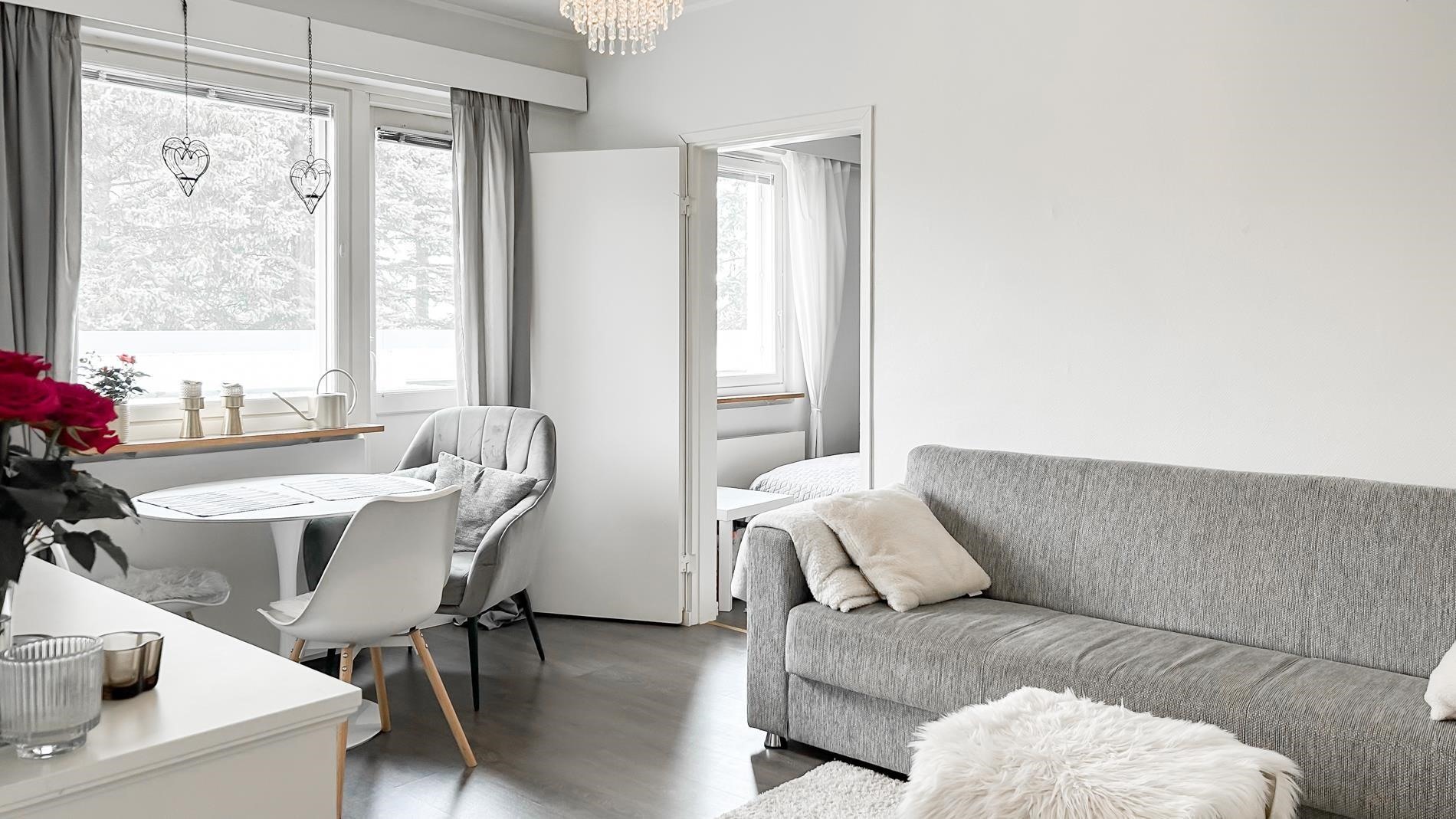 Asunto on ensimmäisessä kerroksessa, ei siis portaiden nousemista. Asunnon 36 neliötä on tehokäytetty, olohuoneeseen mahtuu ruokailuryhmä sohvakaluston ja muiden olohuoneen huonekalujen lisäksi, sieltä on myös käynti parvekkeelle. Keittokomeron iso ikkuna tuo valoa ja tilantuntua, säilytystilaa keittiössä on ihan kivasti. Erillisessä makuuhuoneessa on peiliovellinen vaatekaappi, huoneeseen mahtuu myös työpiste. Kylpyhuone on laatoitettu ja eteisessä on lisäsäilytystilaa vaatteille.
