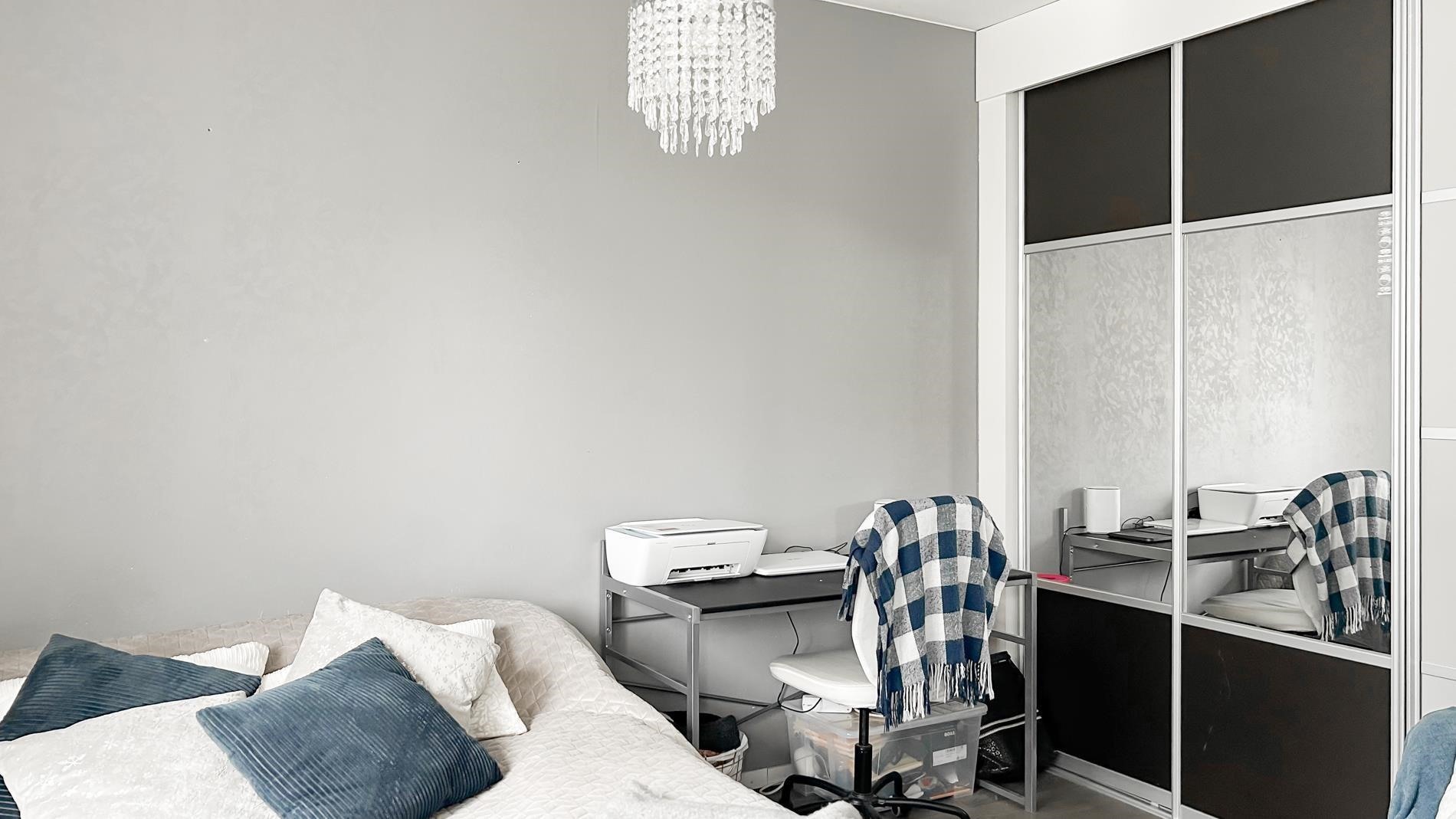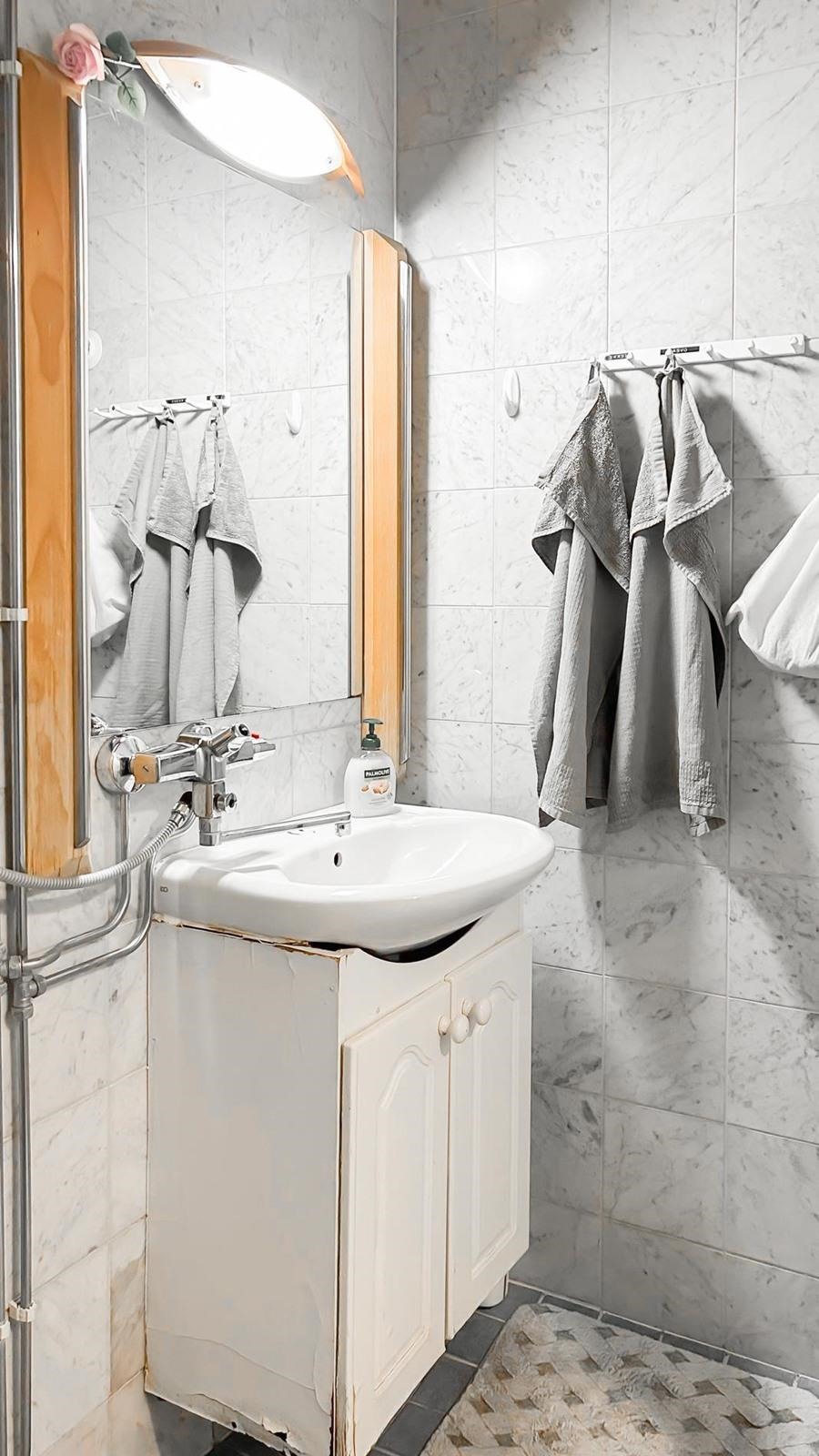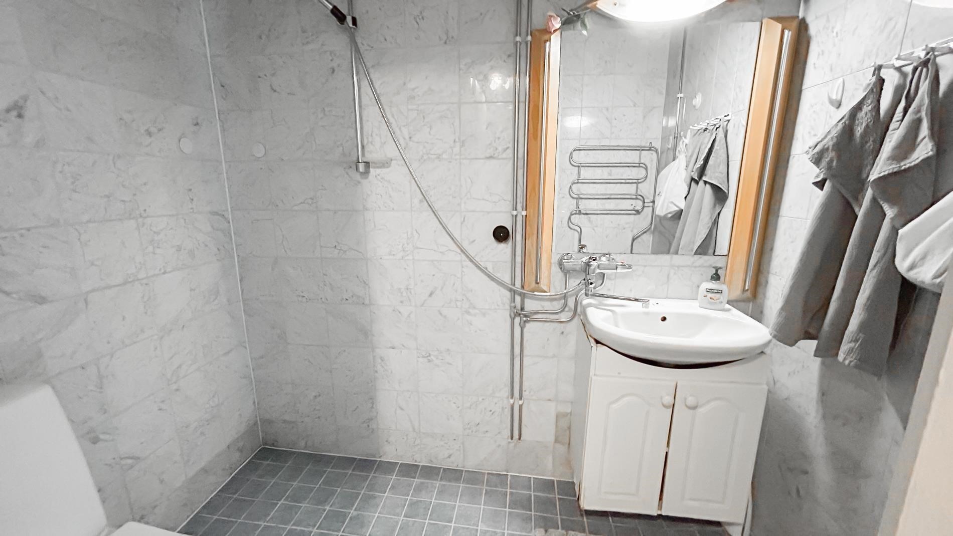 - Kylpyhuone, suihku, peilikaappi, pesukoneliitäntä, kiinteät valaisimet. Makuuhuoneen kaapistoihin asennettu liukuovet