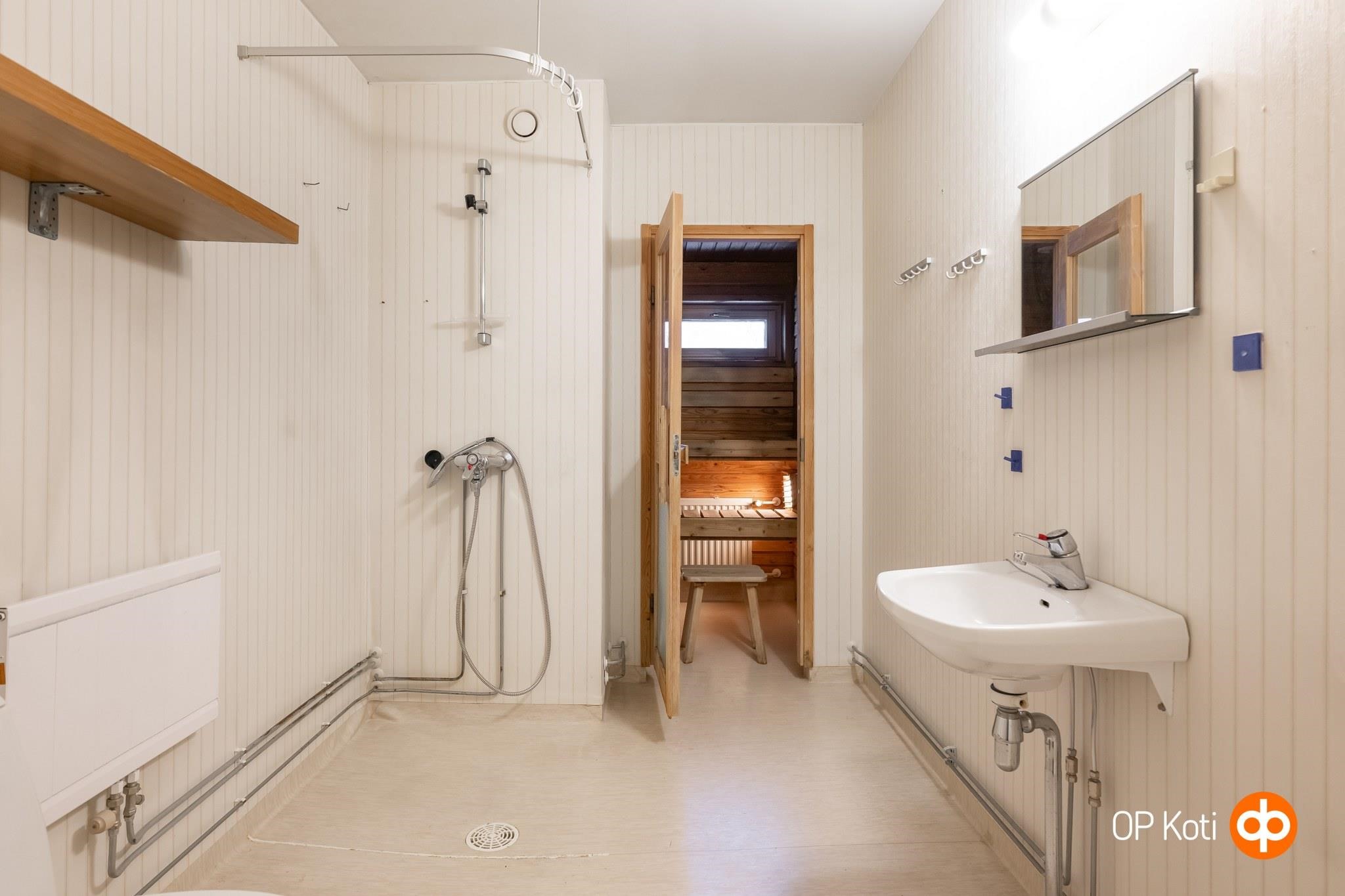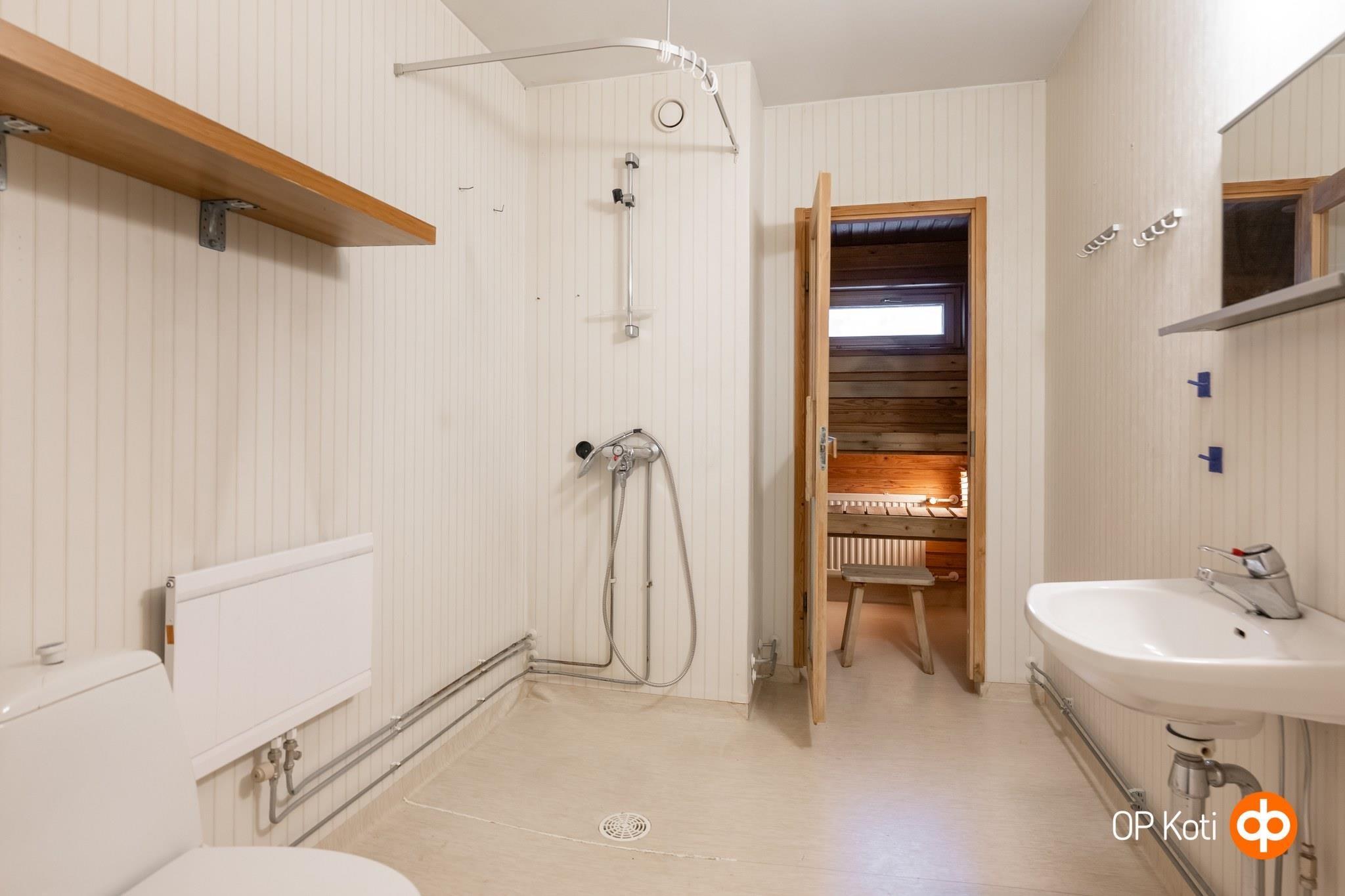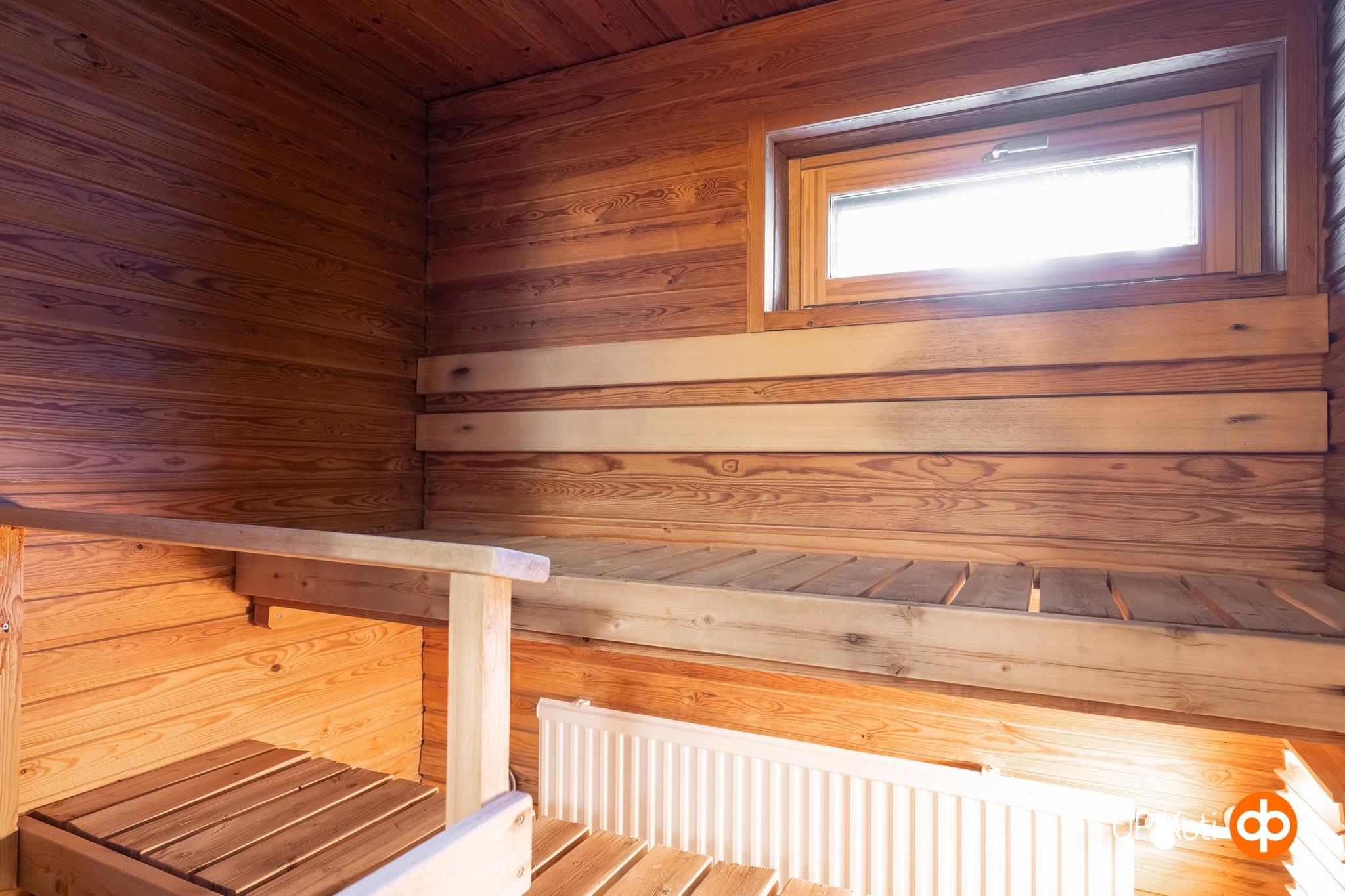 - Sauna, sähkökiuas, suihku, peilit, pesukoneliitäntä, kiinteät valaisimet.