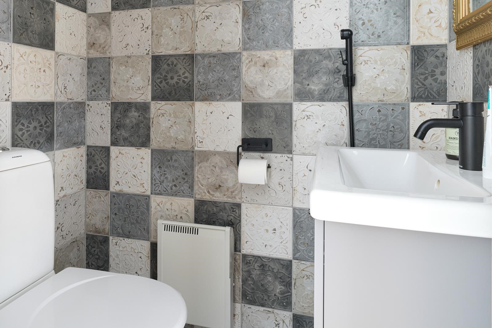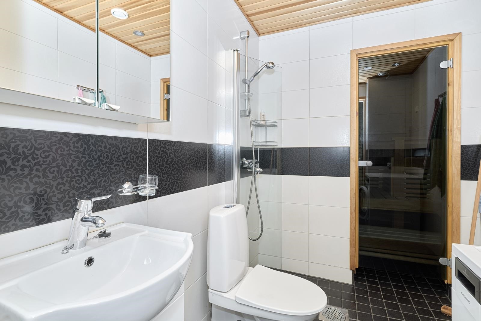 - Sauna, sähkökiuas, kylpyhuone, suihku, suihkuseinä, peilikaappi, pesukoneliitäntä, lattialämmitys.