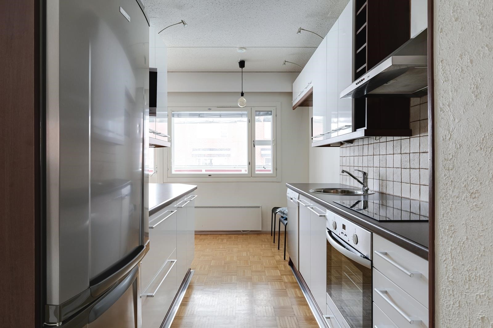 - Jääkaappipakastin, erillisuuni, liesituuletin, mikroaaltouuni, astianpesukone, kaapistot, kiinteät valaisimet.