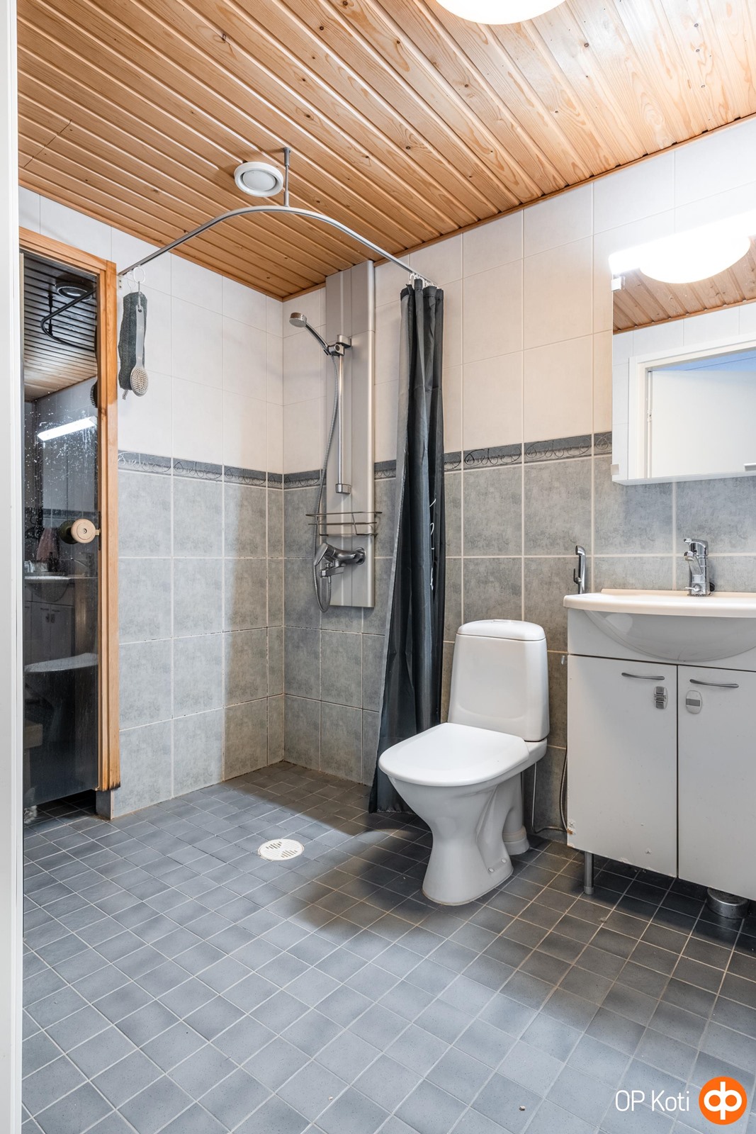 - Sauna, sähkökiuas, kylpyhuone, suihku, suihkuseinä, allaskaappi, pesukoneliitäntä, lattialämmitys Sähkö, kiinteät valaisimet.