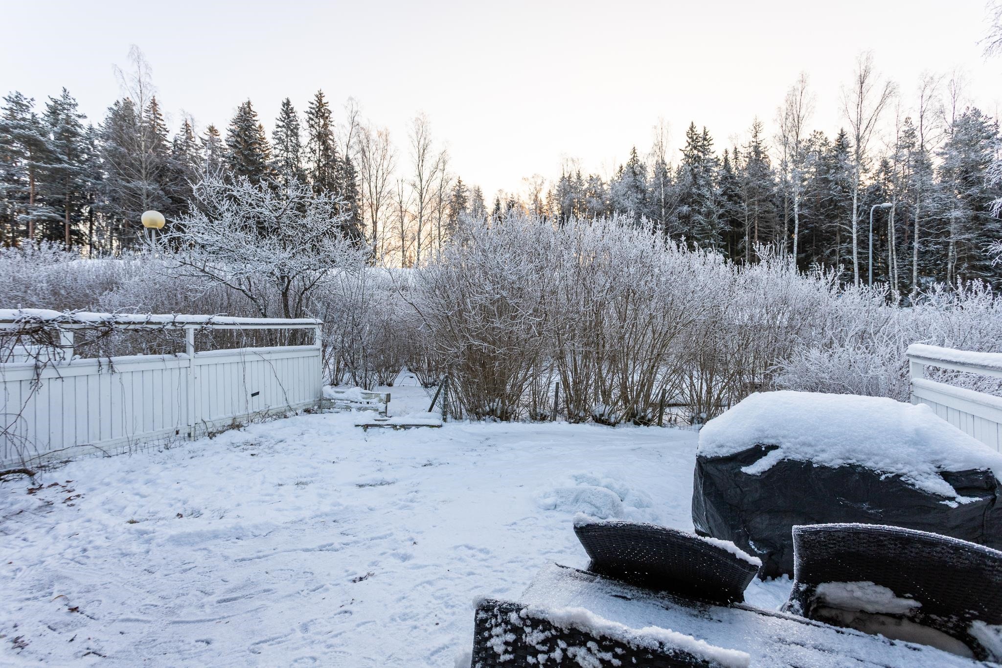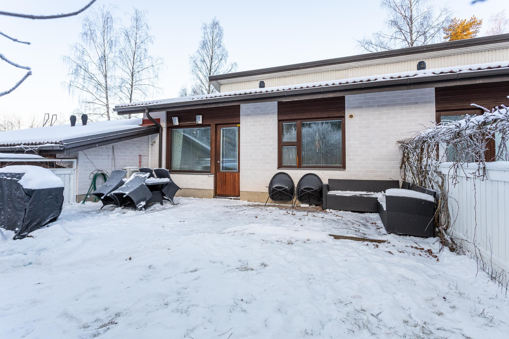 Olohuoneesta on käynti asunnon käytössä olevalle suurelle, suojaisalle terassipihalle. Sisääntulon yhteydessä sijaitsee tilava ulkovarasto, joka helpottaa arjen tavaroiden säilytystä.