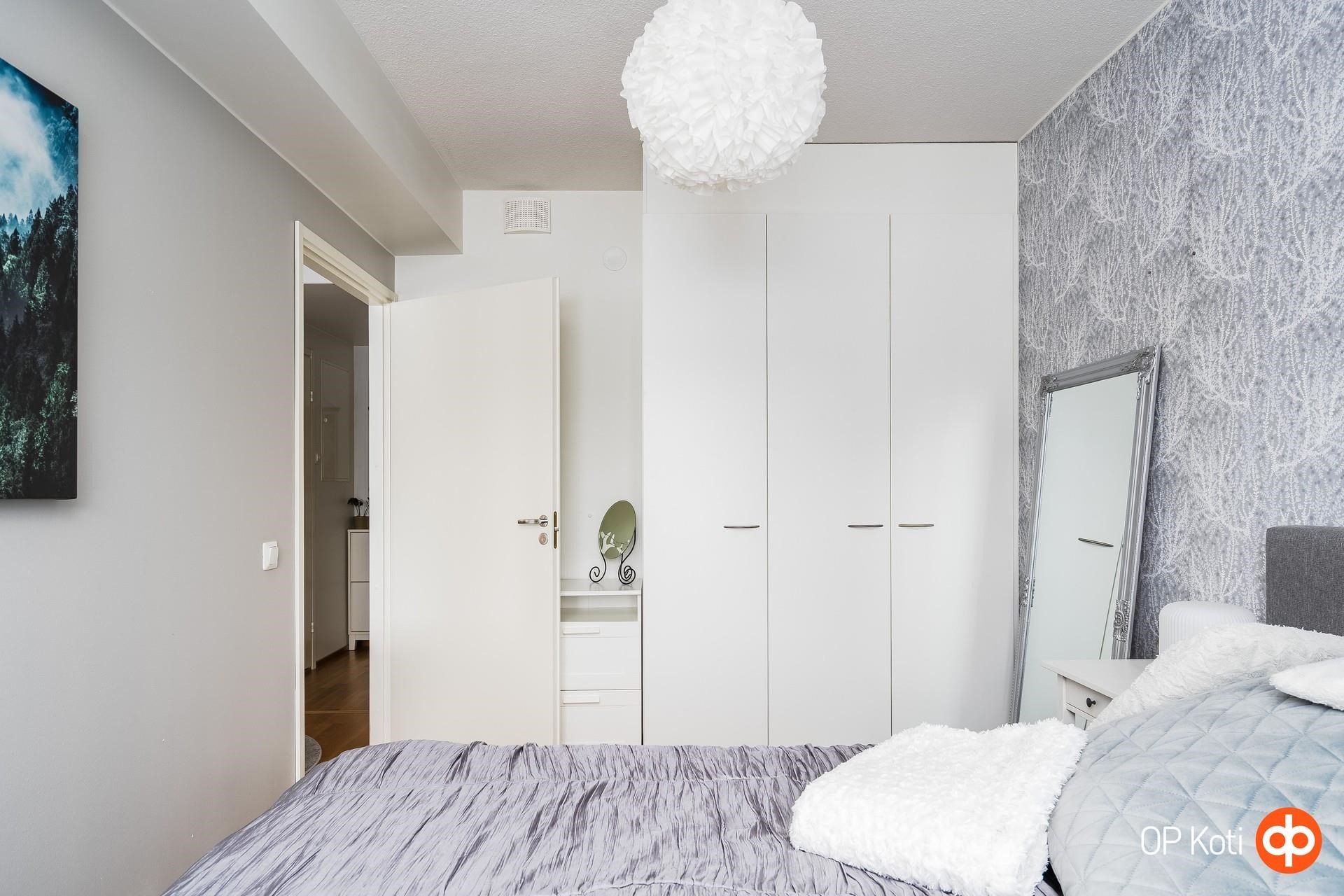Makuuhuone on selkeälinjainen ja tarjoaa hyvin säilytystilaa, ja vaatehuone tuo arkeen lisää sujuvuutta. Kylpyhuone ja sauna muodostavat raikkaan ja hyvin hoidetun kokonaisuuden; sähkökiuas tuo miellyttävät löylyt, ja lattialämmitys lisää asumismukavuutta. Kokonaisuus on kaikin puolin siisti ja muuttovalmis, tänne pääset asettumaan ilman remonttihuolia.