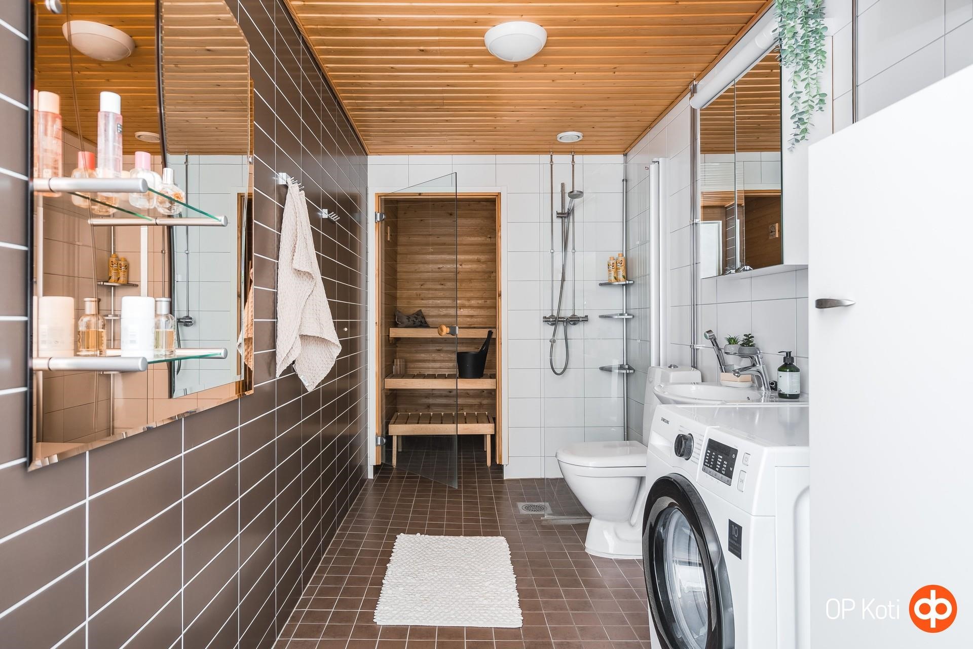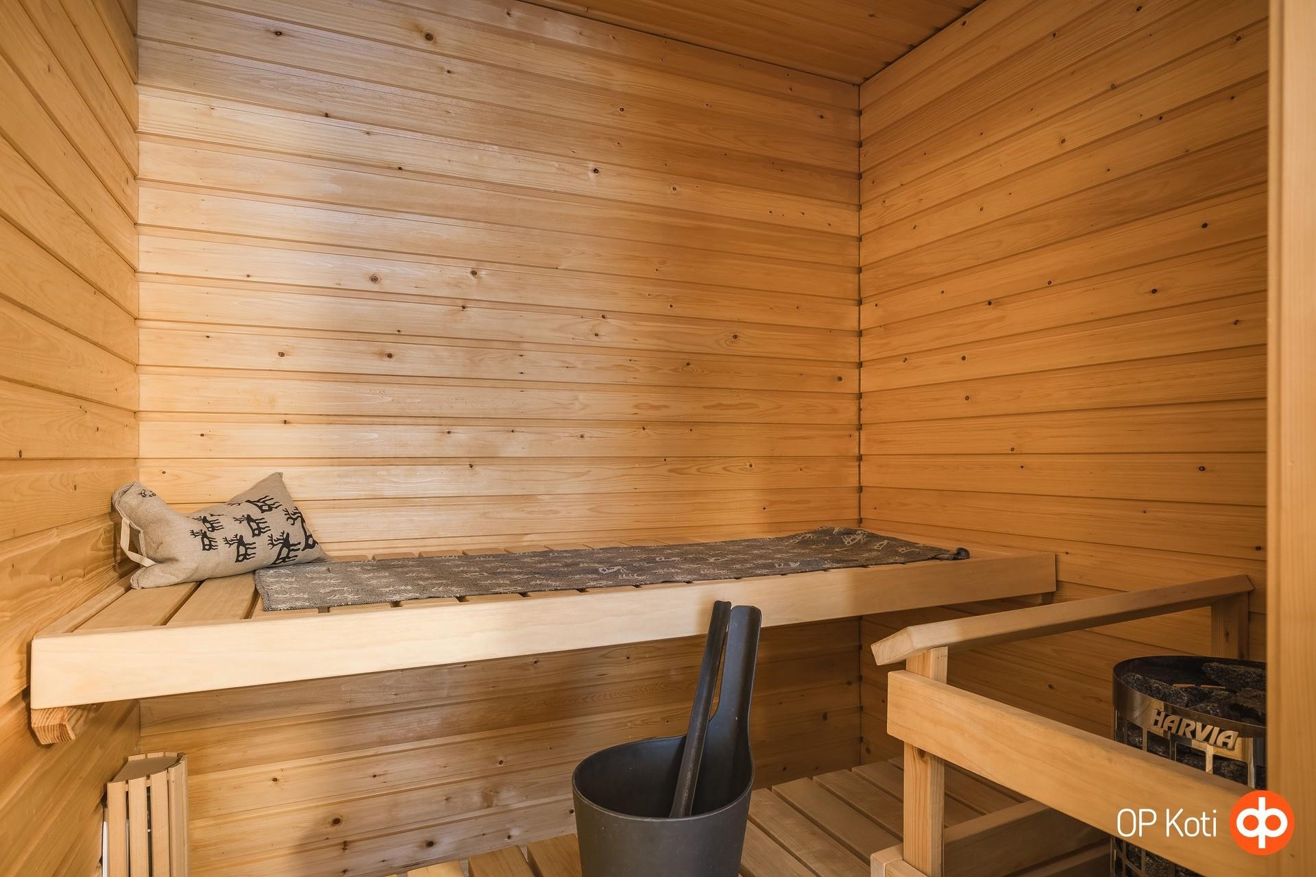 - Sauna tarjoaa rauhallisen ja miellyttävän löylyhetken sähkökiukaan lämmössä, ja tila on suunniteltu selkeäksi ja helppohoitoiseksi. Kylpyhuoneessa on käytännöllinen suihku ja suojaava suihkuseinä, jotka pitävät tilan toimivana ja siistinä. Peilikaappi, kaapit ja allaskaappi tuovat runsaasti säilytystilaa, ja pesukoneliitäntä tekee arjesta vaivatonta. Sähköinen lattialämmitys lisää mukavuutta ja kuivattaa tilan tehokkaasti. Kiinteät valaisimet viimeistelevät kokonaisuuden tuomalla hyvän yleisvalon sekä saunaan että kylpyhuoneeseen.