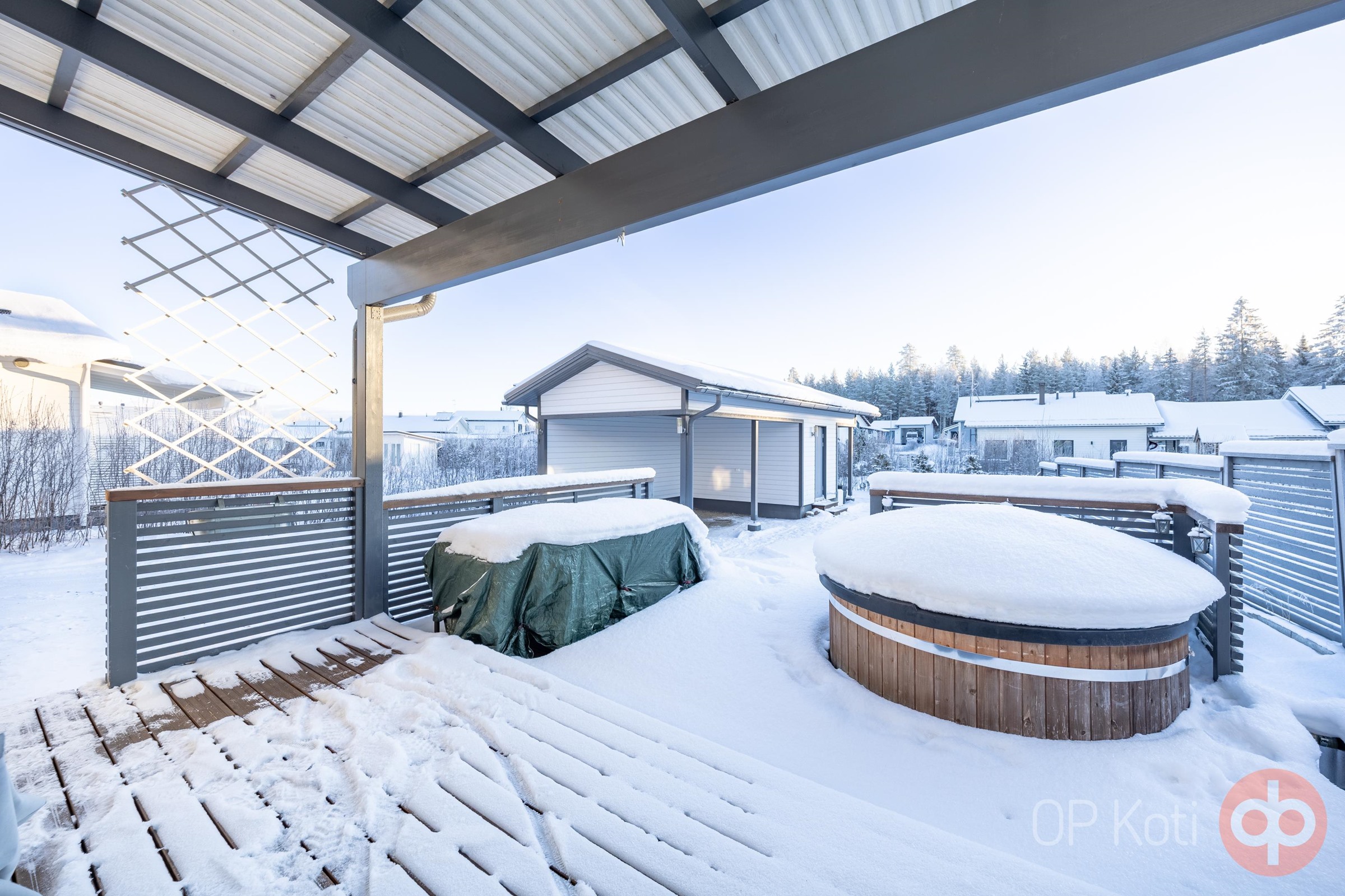 Oma suojaisa piha tarjoaa rauhaa ja yksityisyyttä. Ulkoilmasta voi nauttia tilavalla terassilla ja paljussa. Lisäksi käytössäsi on erillinen autokatos sekä varastorakennus.