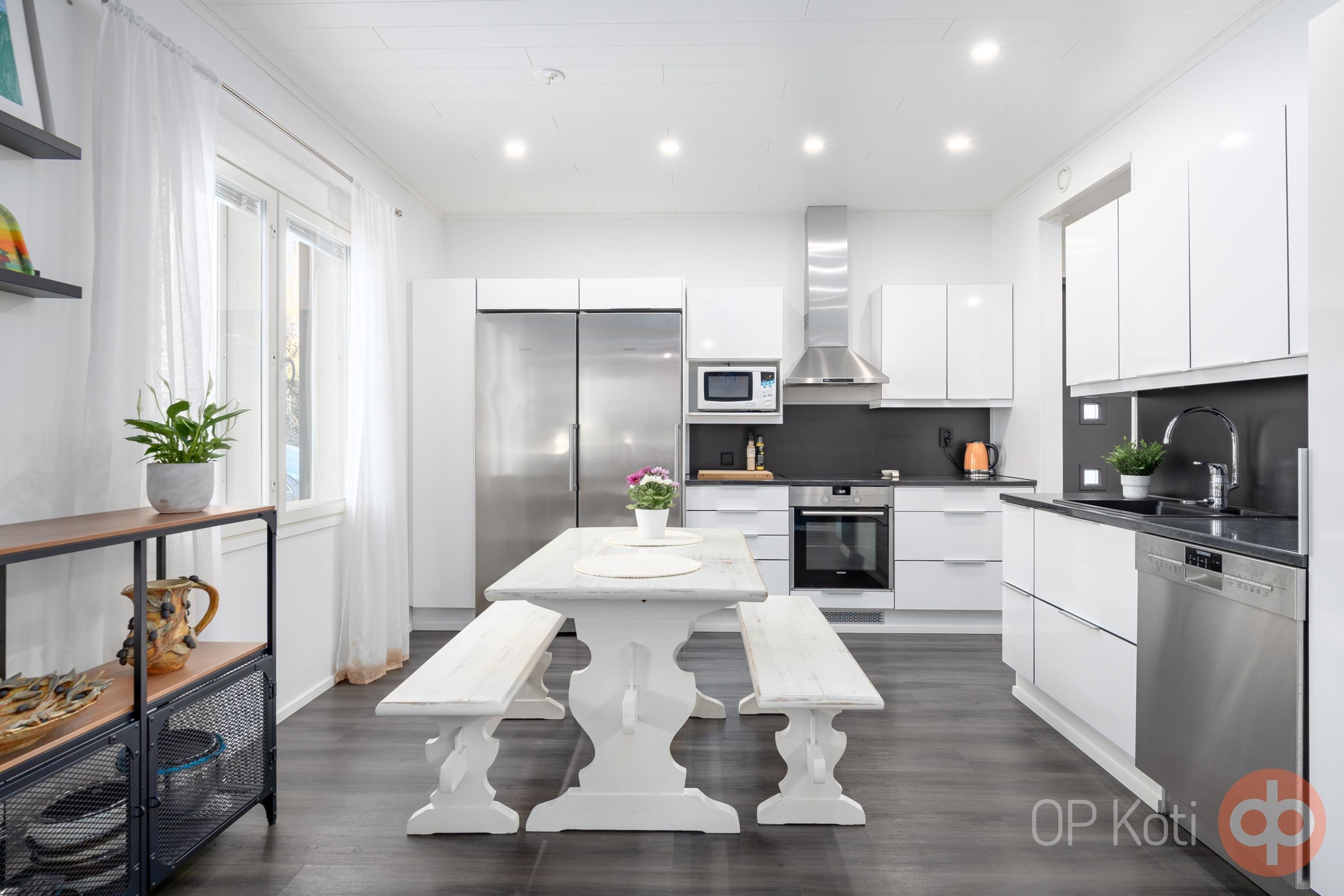 - Jääkaappi, pakastekaappi, erillisuuni, induktioliesi, liesikupu, astianpesukone, kaapistot, kiinteät valaisimet.