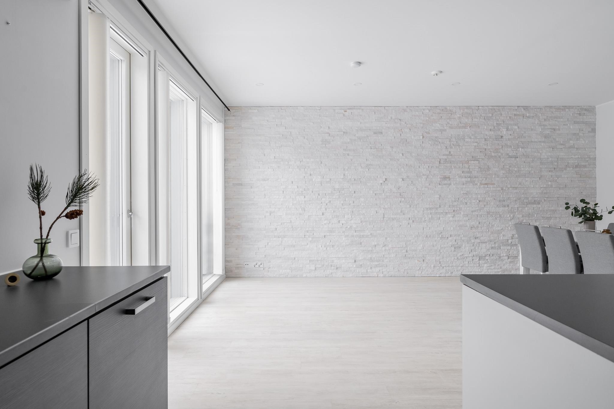 Kodissa on kaksi makuuhuonetta, tilava olohuone sekä keittiö, jossa on kaikki tarpeellinen ruoanlaittoon. Olohuoneen kiviseinä antaa tilaan persoonallisen ilmeen, ja lattiamateriaalit ovat kauttaaltaan helppohoitoisia. Sauna ja kylpyhuone ovat siistit ja toimivat, ja arjen sujuvuutta lisäävät muun muassa lattialämmitys sekä kätevä ilmalämpöpumppu. Säilytystilaa löytyy hyvin, ja kodin varusteluun kuuluu myös huoneistokohtainen ilmanvaihto.